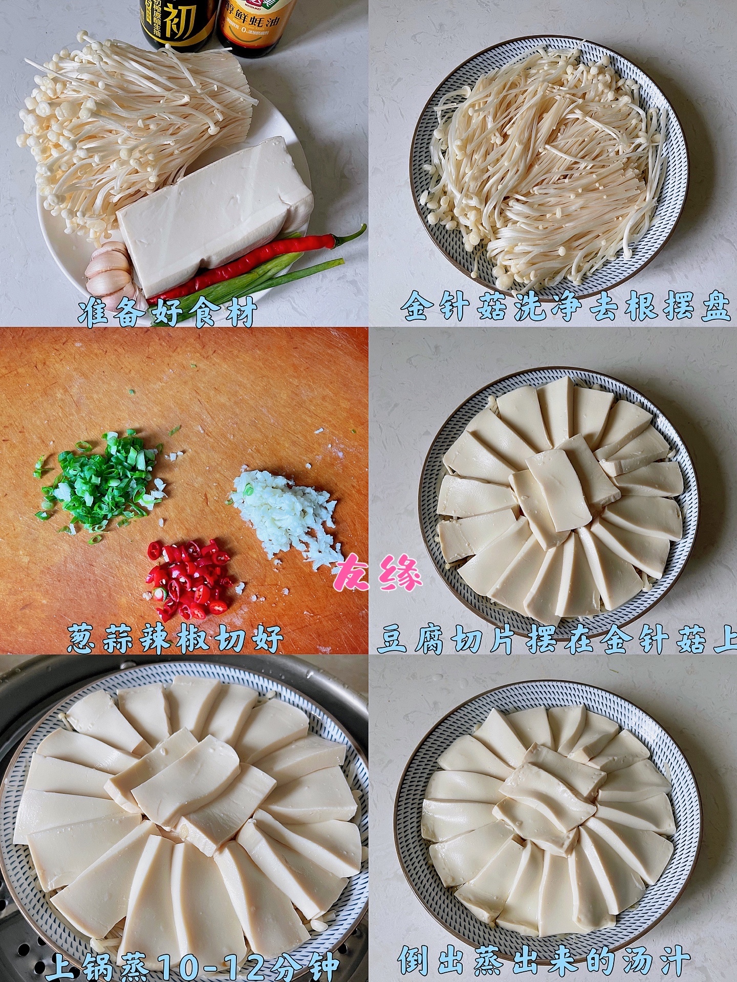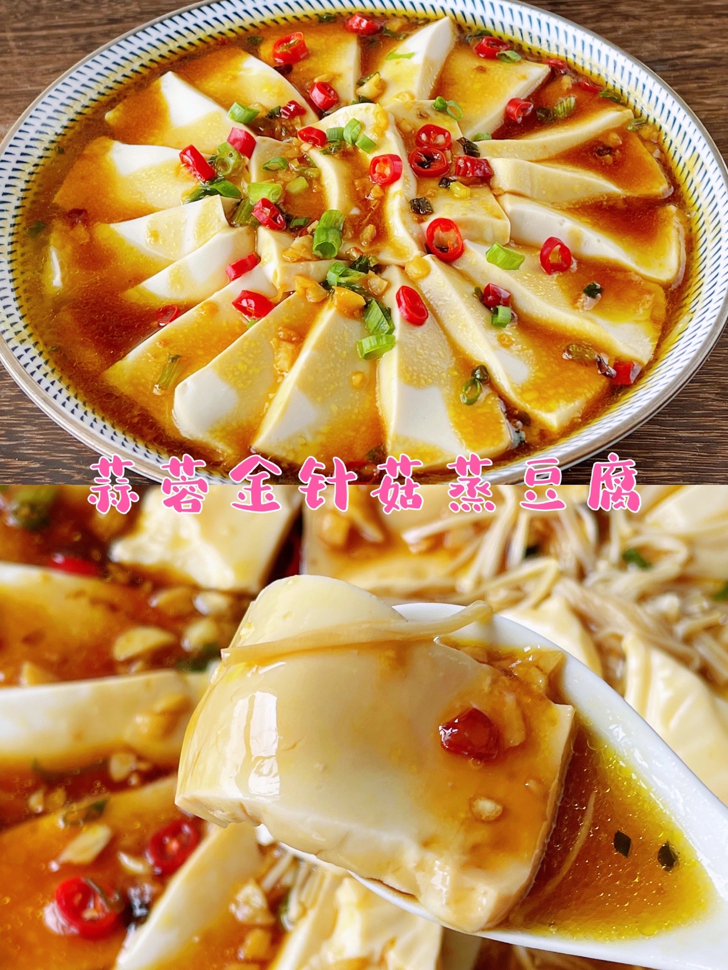 1⃣️金针菇洗净去根摆盘,嫩豆腐切片摆在金针菇上,放入蒸锅蒸10-12分钟,倒掉蒸出的汁水