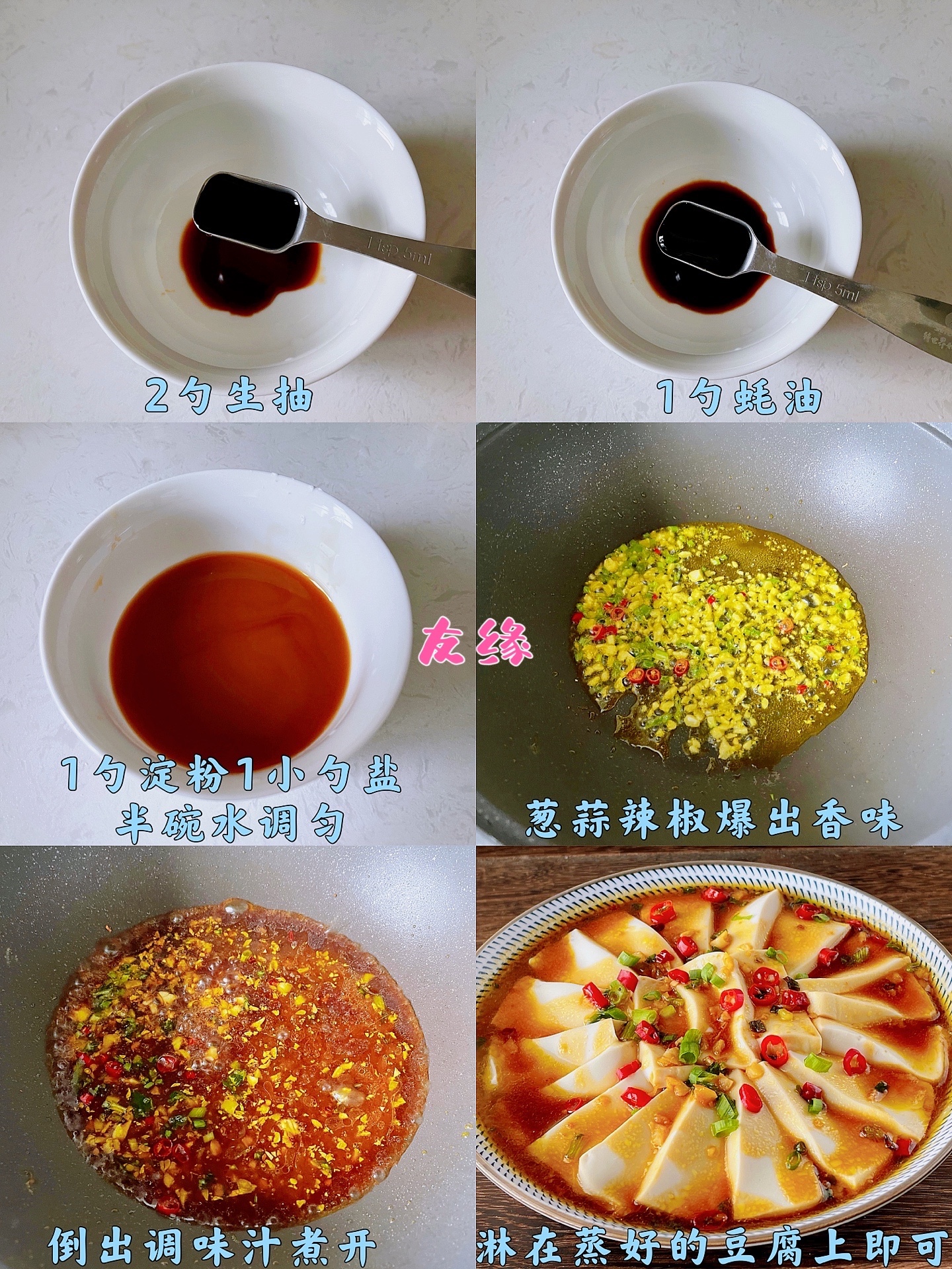 3⃣️热锅入油,葱蒜辣椒爆香,倒入调味汁煮开,淋在豆腐上即可