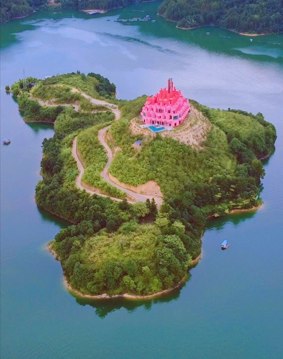 位置最中间的水上小岛,度假休息的好地方。整个风格是粉色的城堡风,还有无边泳池。