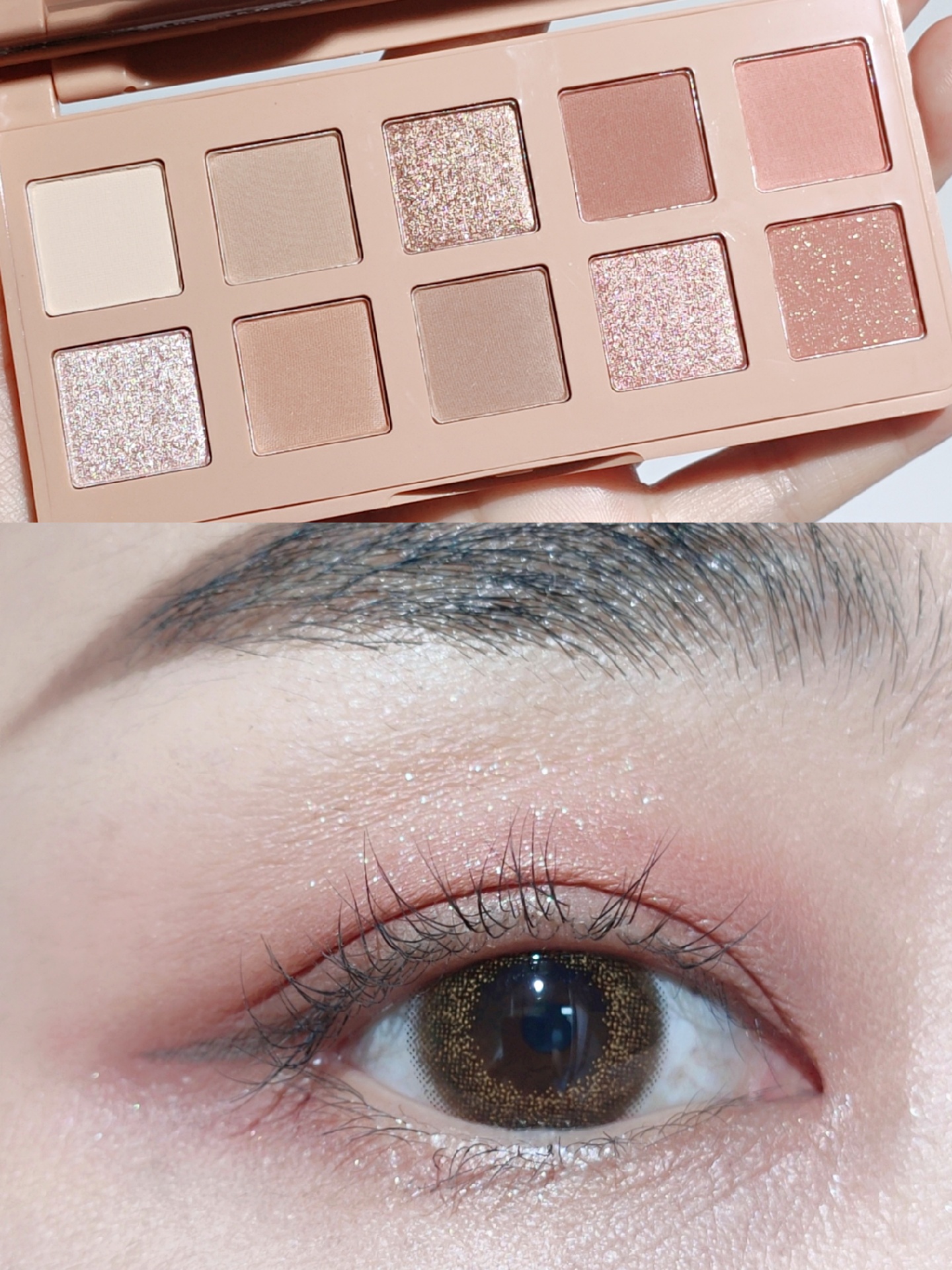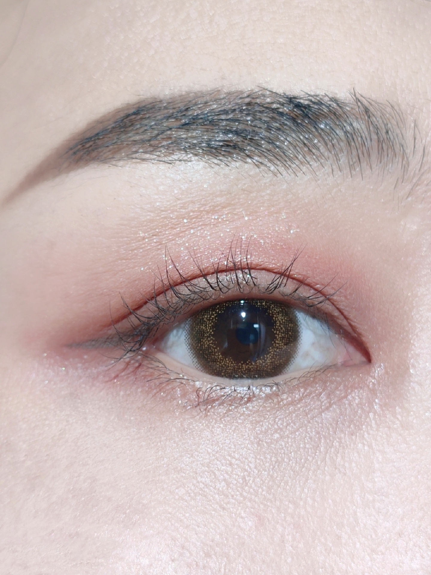浅咖色晕染整个眼皮来消消 肿,红茶棕色晕染眼皮后半段,加深一下眼尾~蜜🍑桃色晕染眼皮前半段~碎钻提亮眼中眼头🙃