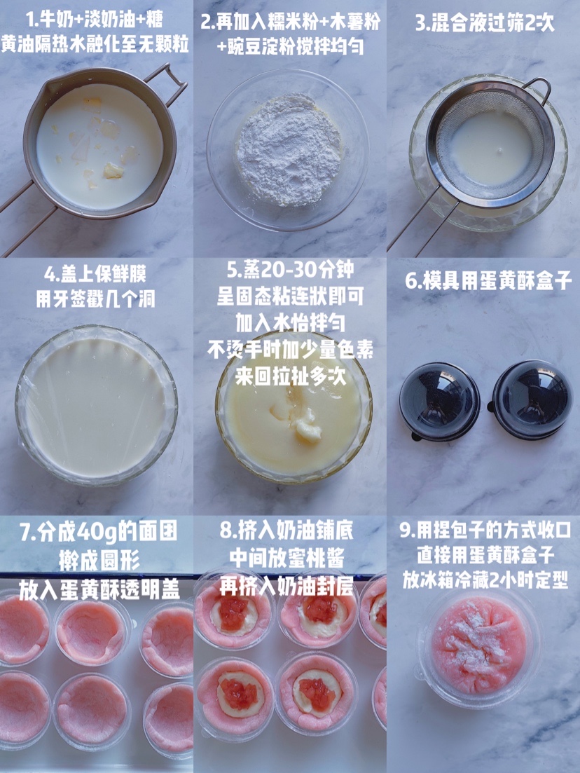 牛奶134g、淡奶油14g、糖25g、黄油13g、糯米粉84g、木薯粉3.5g、豌豆淀粉27g、水怡16g