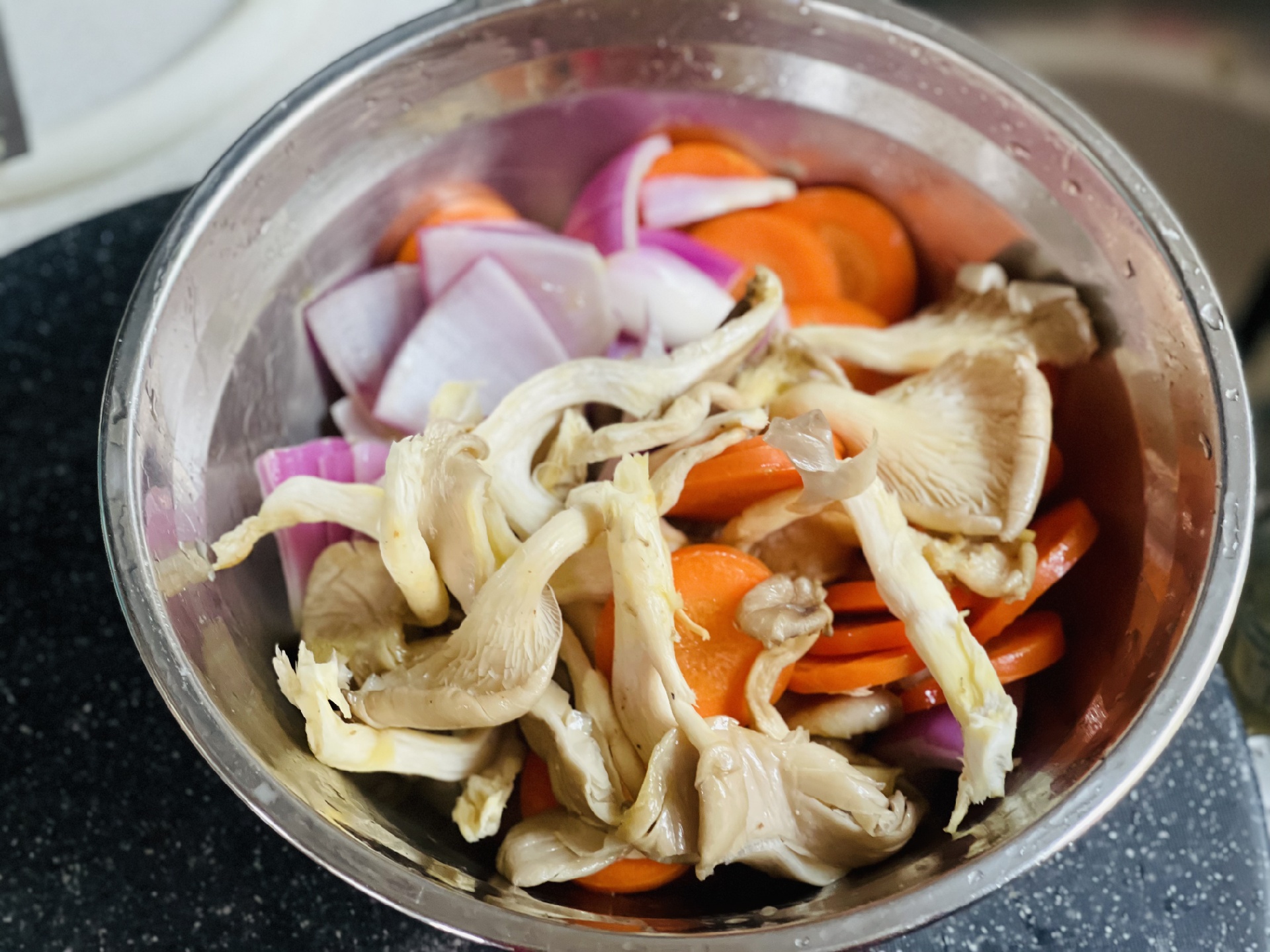 家里常有的蔬菜:圆葱、胡萝卜、蘑菇先加入橄榄油搅拌,避免蔬菜烤糊。