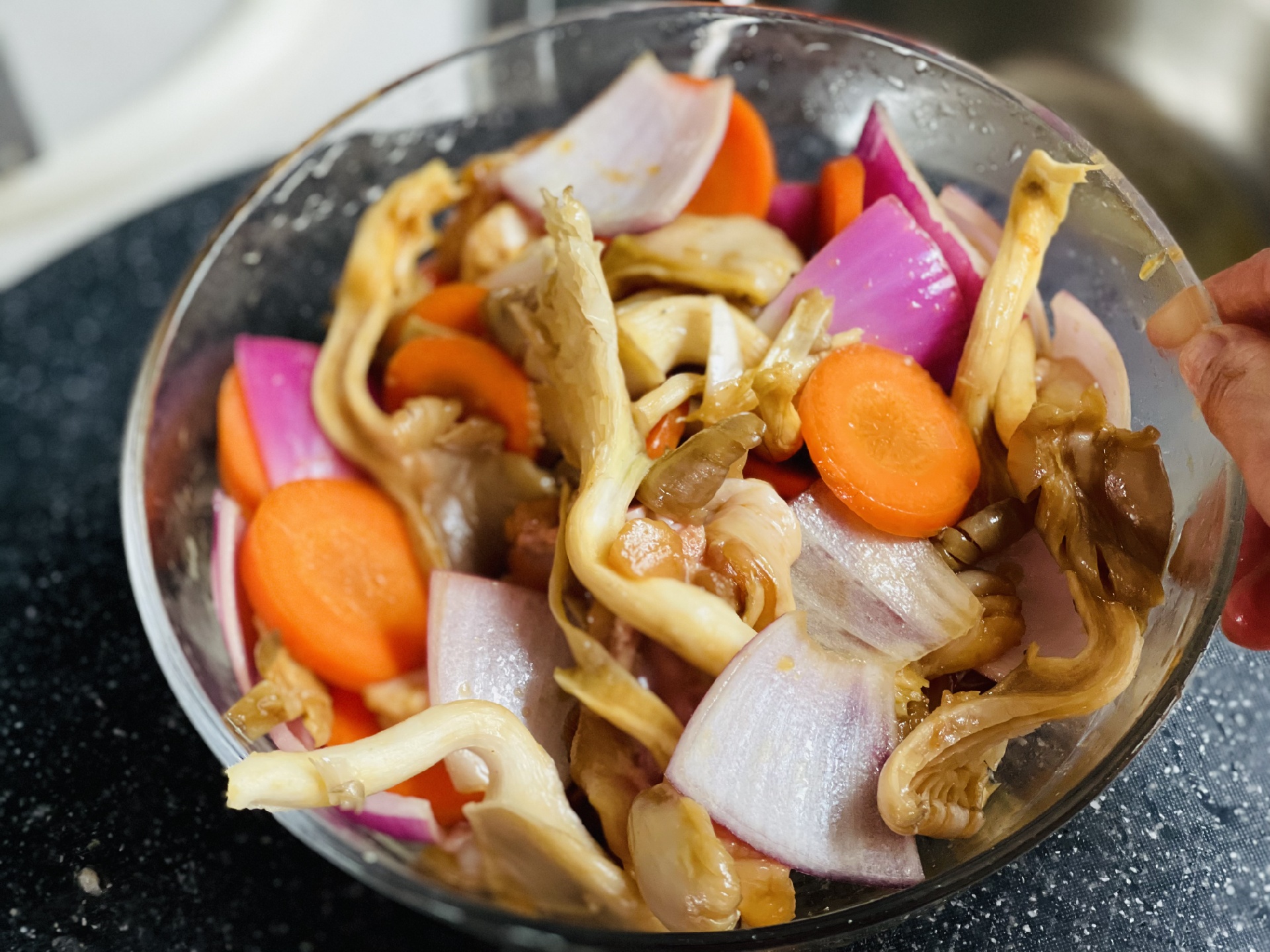 然后把腌好的鸡腿肉连同酱汁一起与蔬菜搅拌~