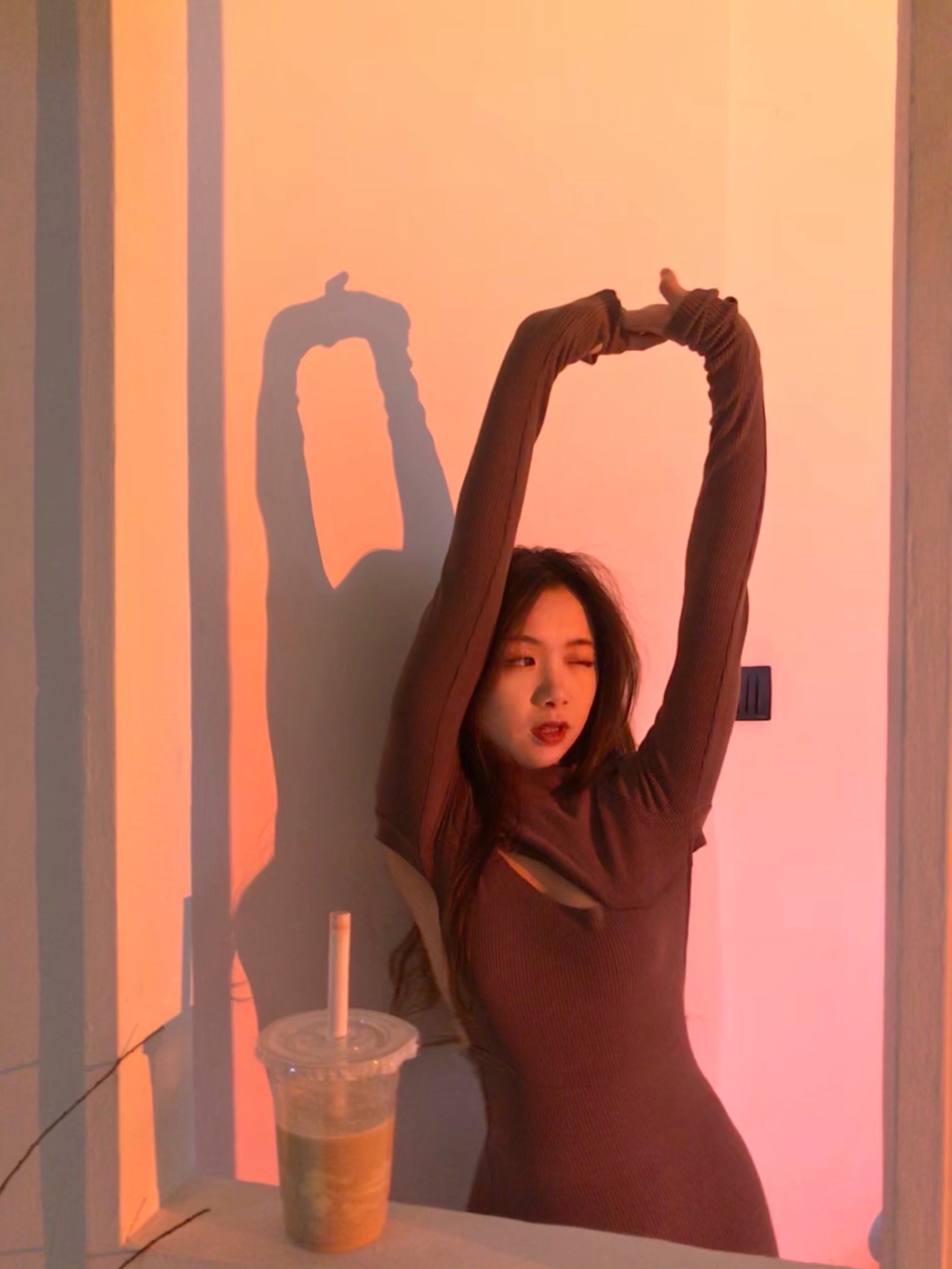 4一只手放大腿中间遮肉 另一只手像伸懒腰的抬手微笑闭眼