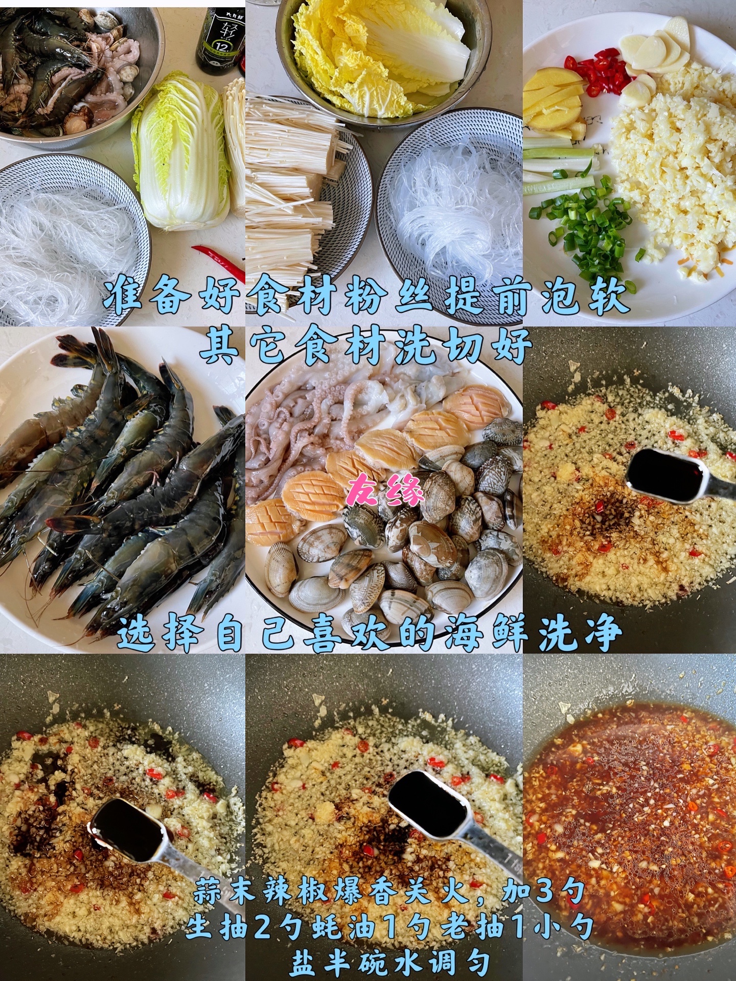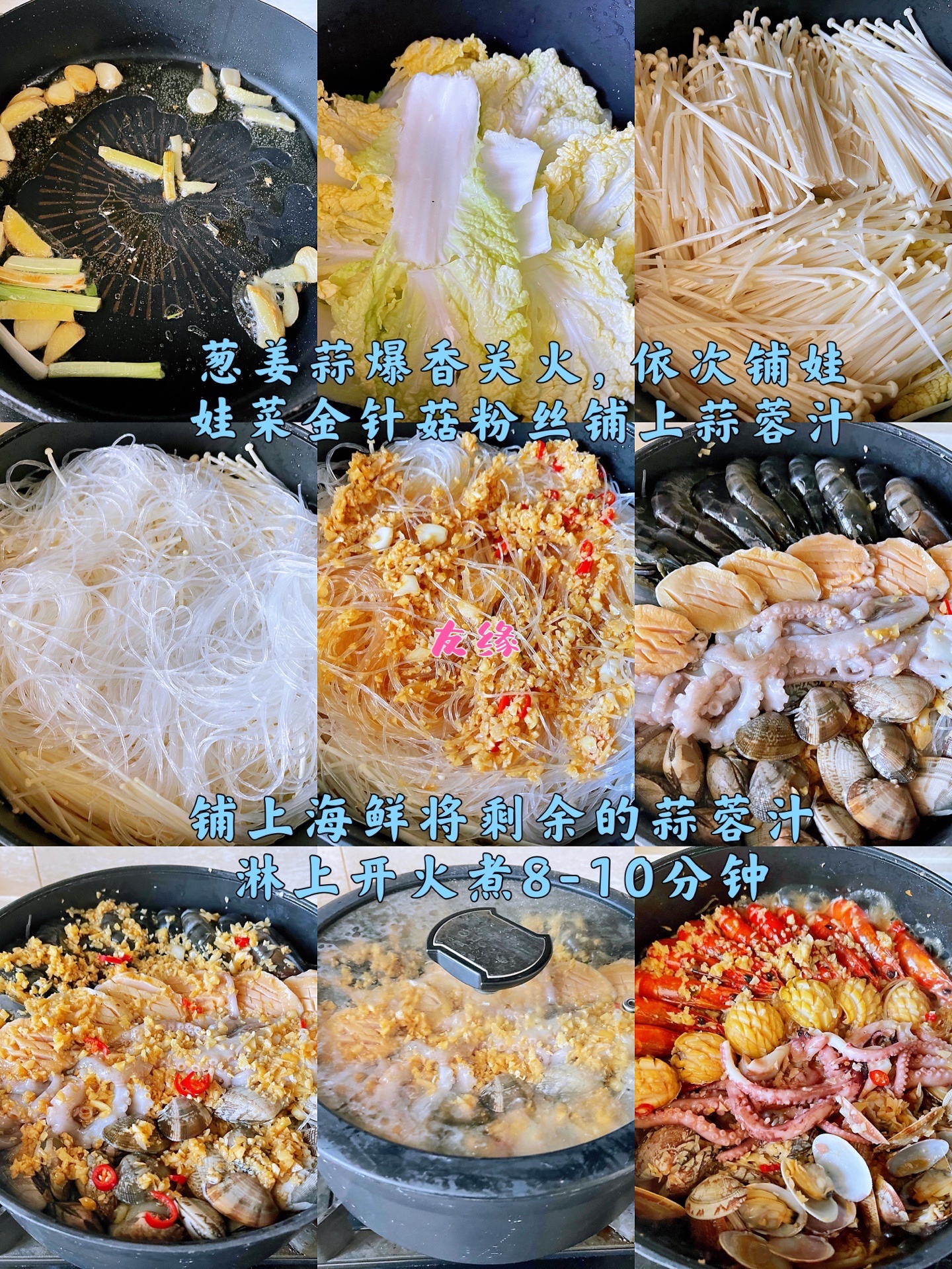 3⃣️热锅入油,放入葱姜蒜片爆香关火,依次摆上娃娃菜、金针菇、粉丝,铺上一层蒜蓉汁,摆上海鲜,再将剩余的蒜蓉汁铺上,开中大火煮8-10分钟即可