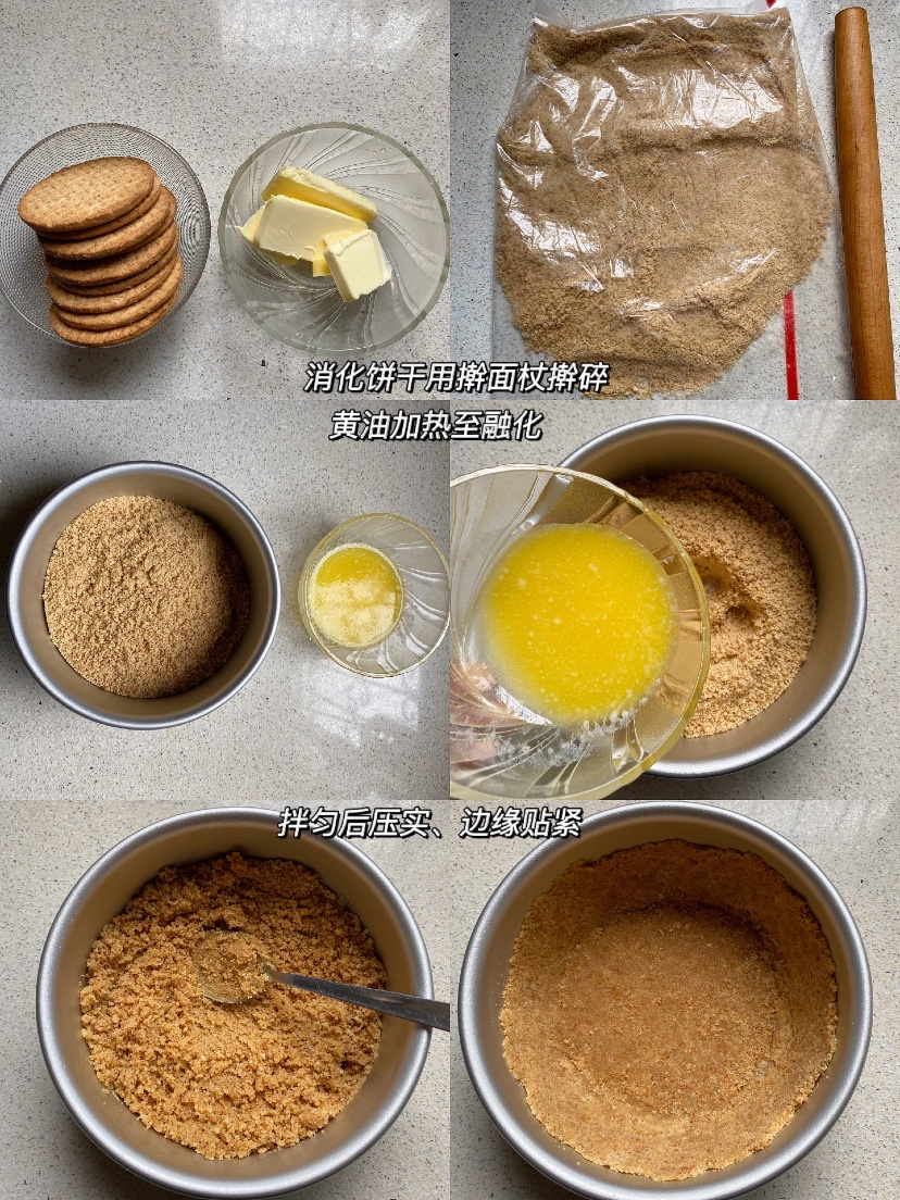 1⃣️消化饼干装入保鲜袋,擀碎后倒入融化的黄油拌匀,用擀面杖压实,勺子把边缘贴紧。