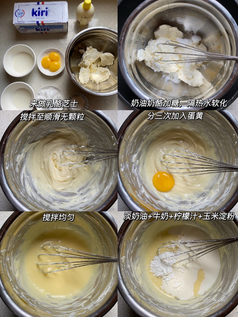 👉乳酪芝士:奶油奶酪250g、细砂糖50g、蛋黄3颗、牛奶20g、淡奶油40g、柠檬汁几滴,玉米淀粉5g