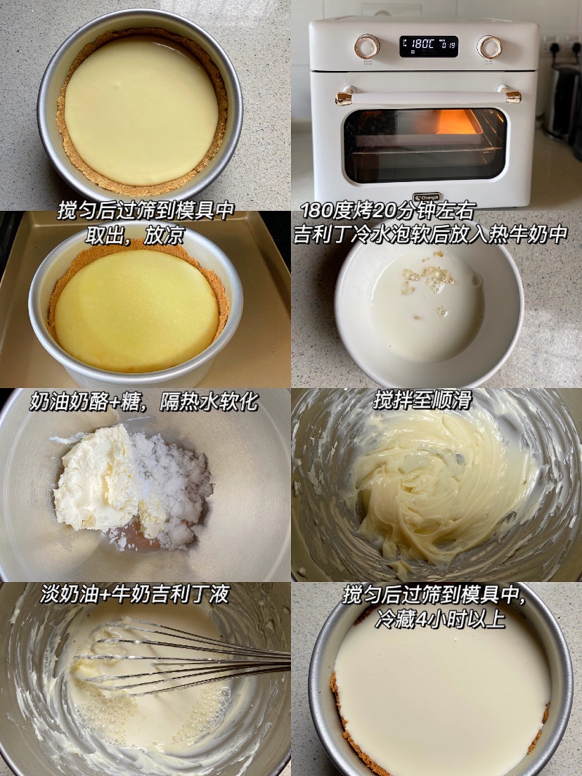 4⃣️冻芝土:吉利丁片+冷水泡软,捞出放入热牛奶搅匀,奶油奶酪+糖隔热水搅拌至顺滑,加淡奶油和吉利丁牛奶液,拌匀后过筛到模具中,冰箱冷藏4小时以上即可。
