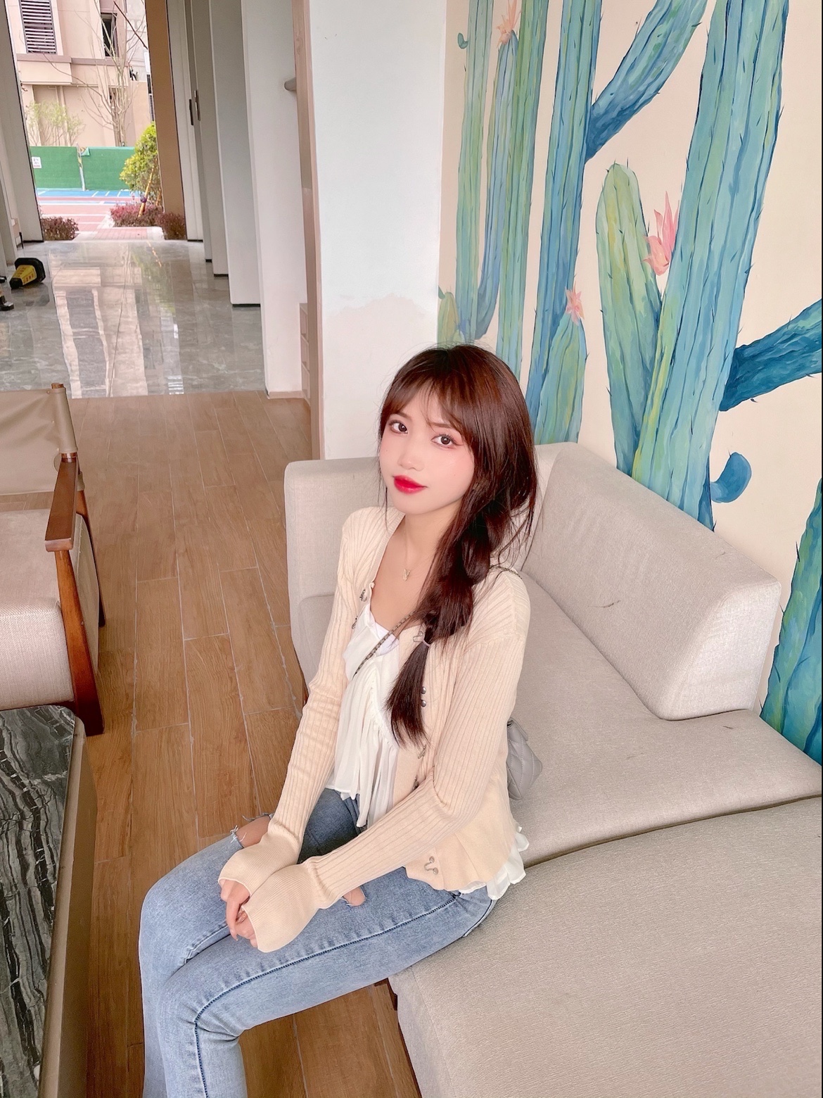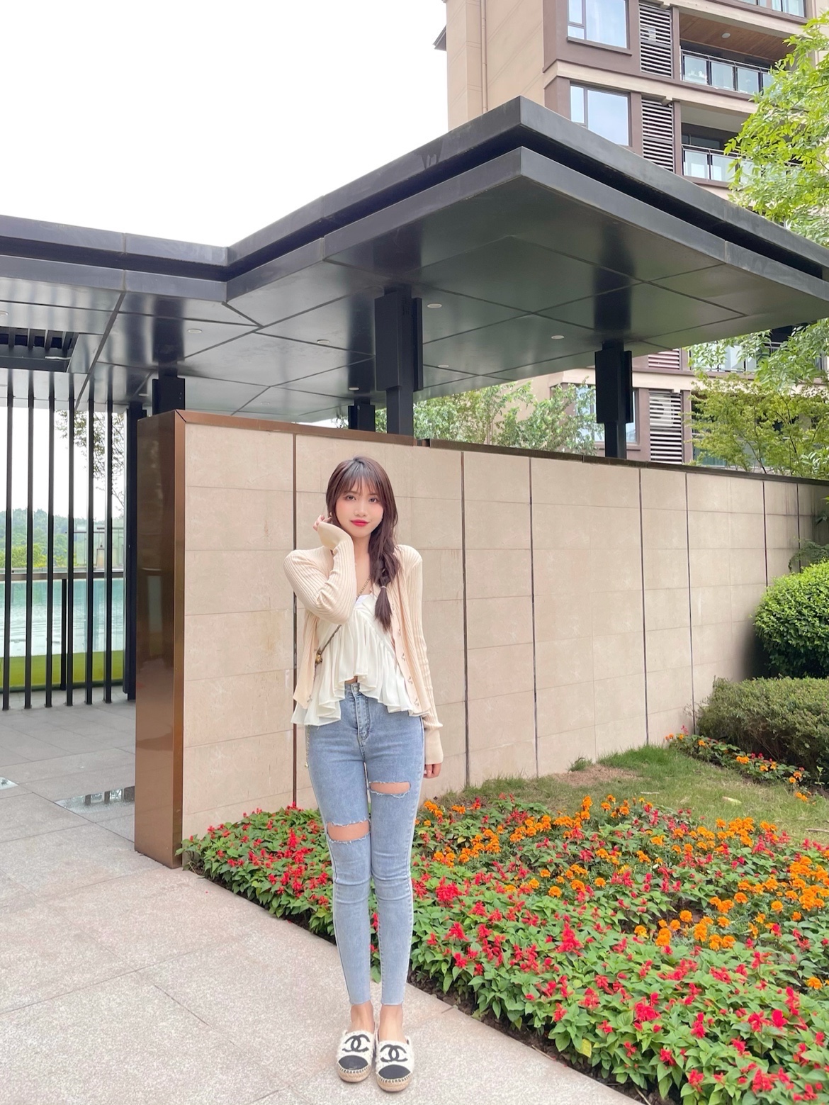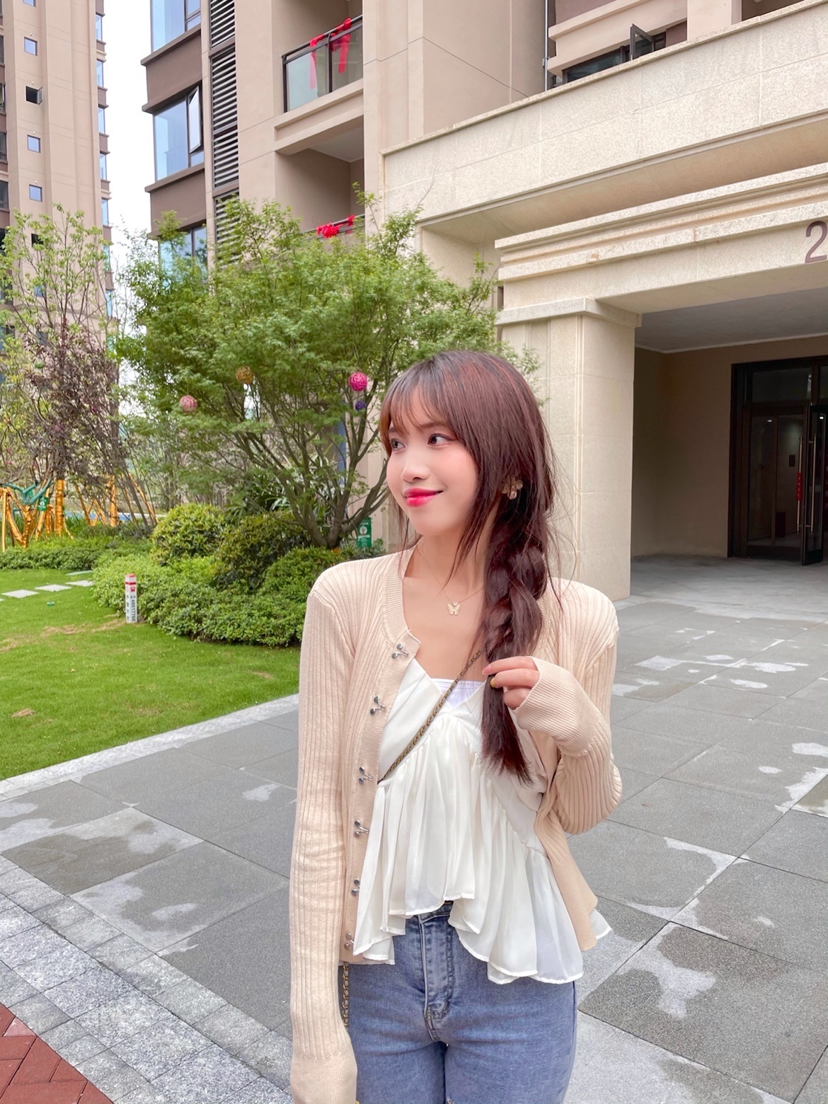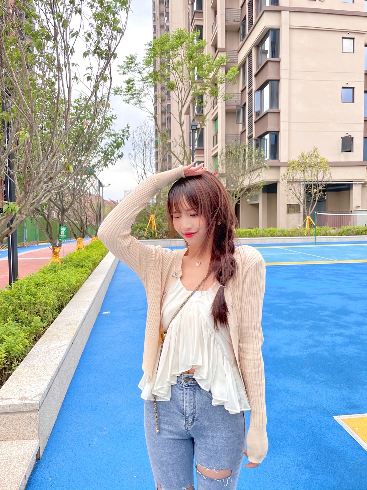 杏色针织开衫➕奶白色荷叶边吊带➕蓝色牛仔裤