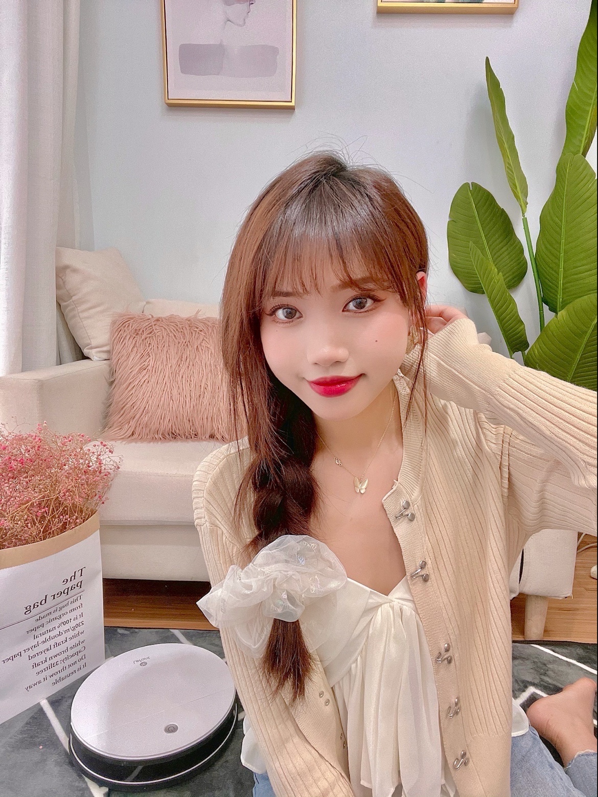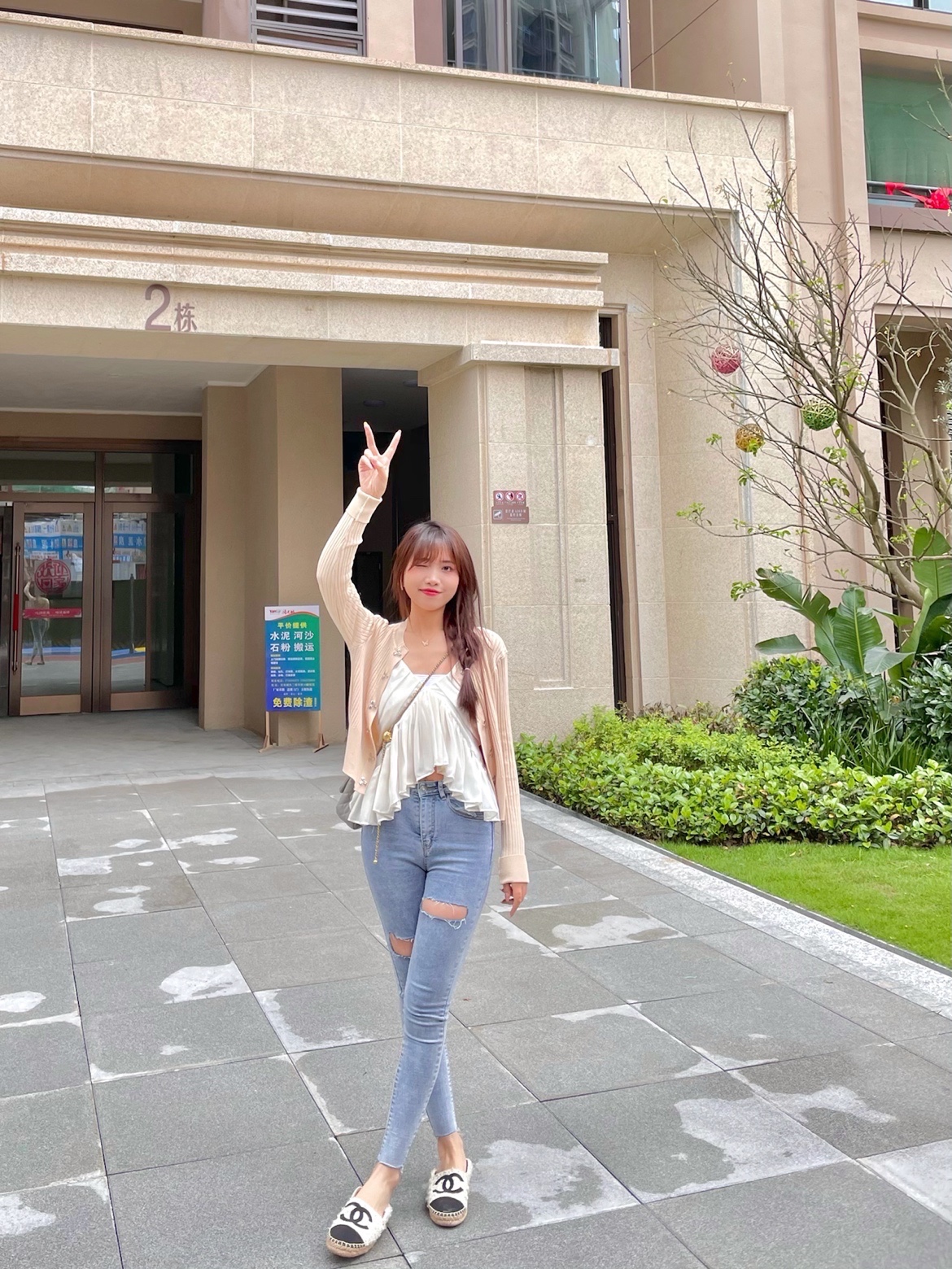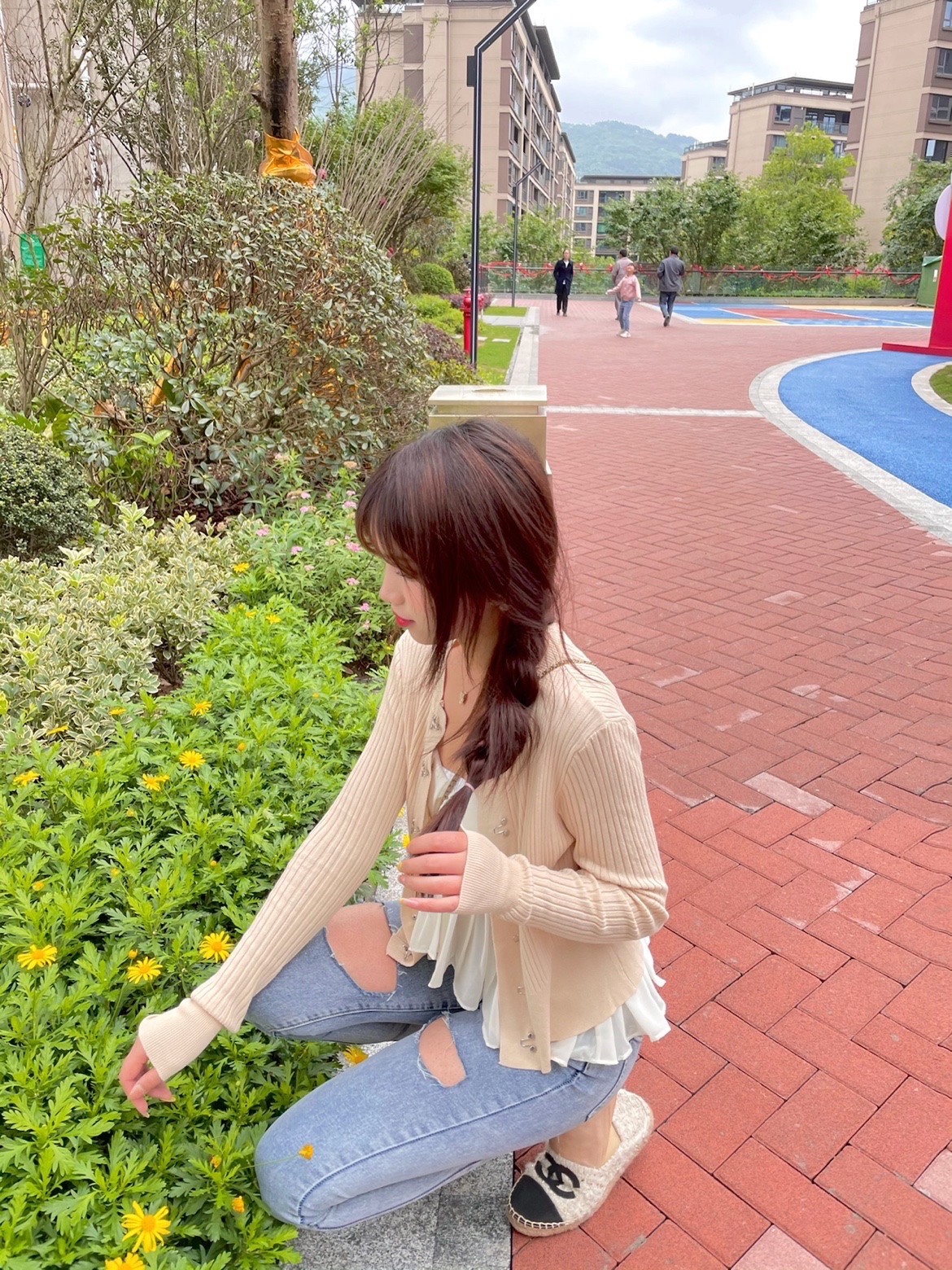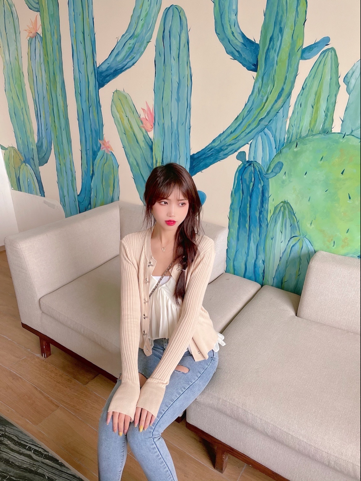 杏色针织开衫➕奶白色荷叶边吊带➕蓝色牛仔裤