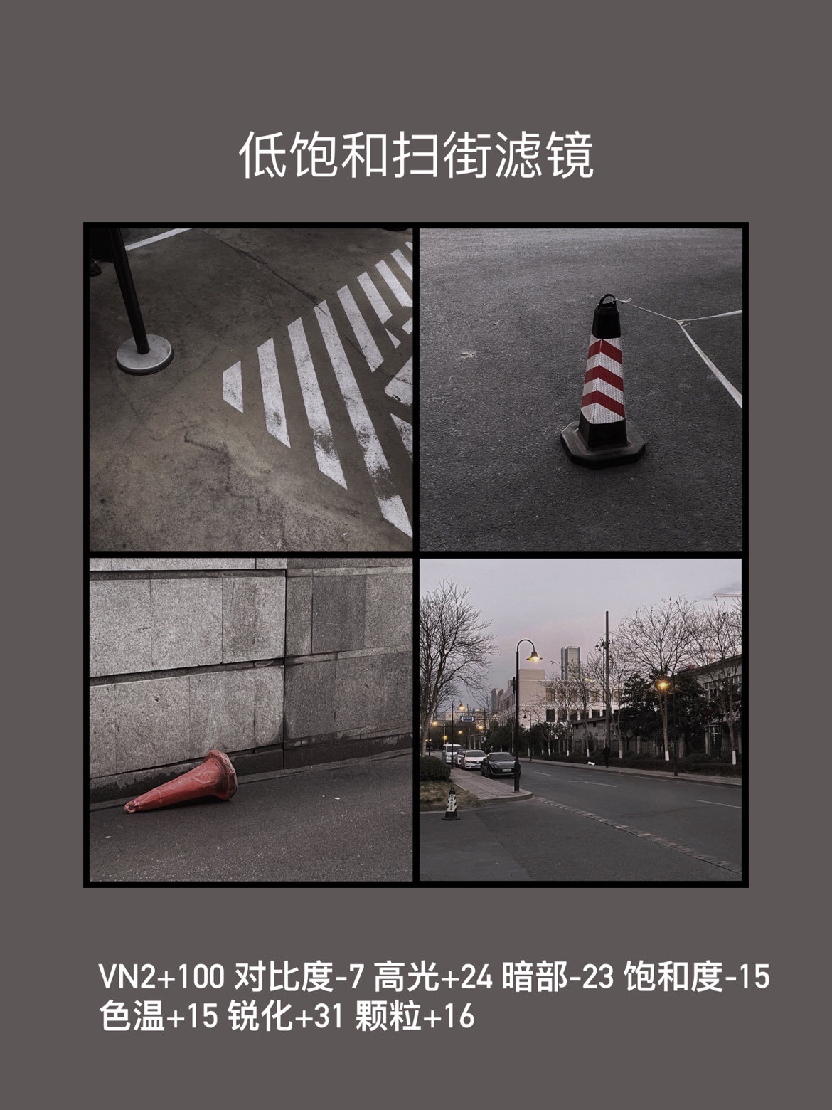 VN2+100 对比度-7 高光+24 暗部-23 饱和度-15 色温+15 锐化+31 颗粒+16
