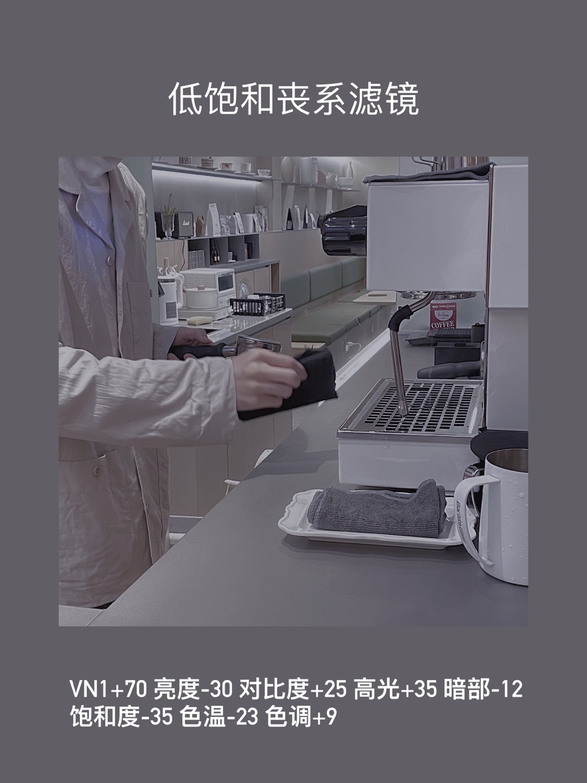 VN1+70 亮度-30 对比度+25 高光+35 暗部-12 饱和度-35 色温-23 色调+9