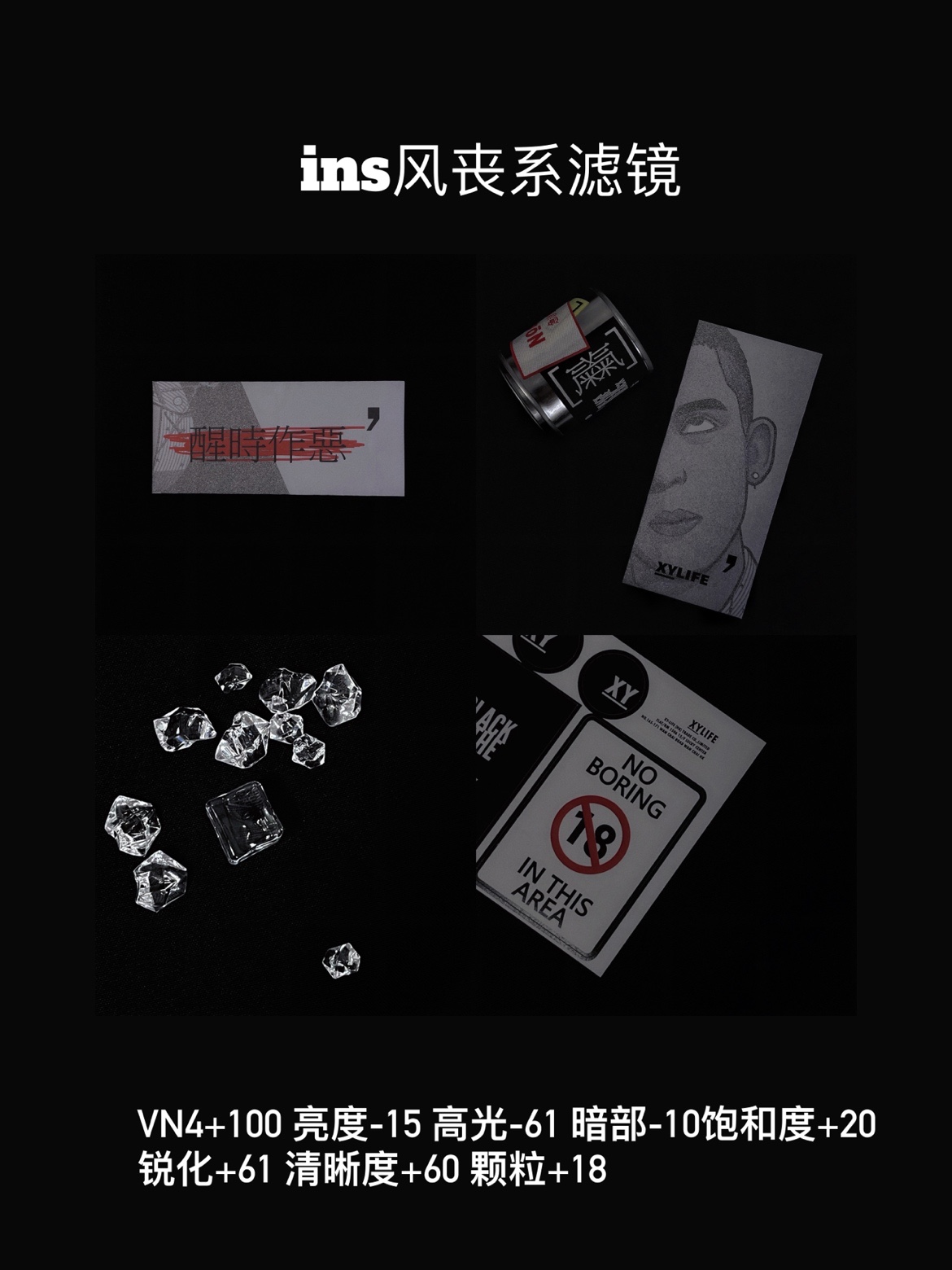 VN4+100 亮度-15 高光-61 暗部-10饱和度+20 锐化+61 清晰度+60 颗粒+18