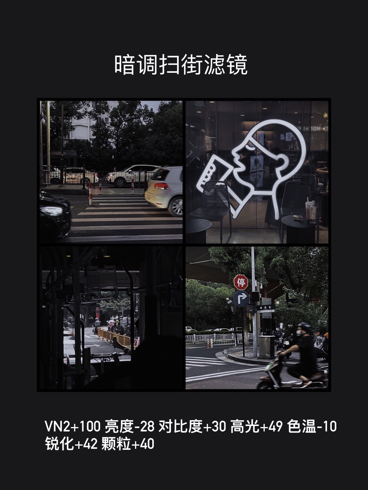 VN2+100 亮度-28 对比度+30 高光+49 色温-10 锐化+42 颗粒+40