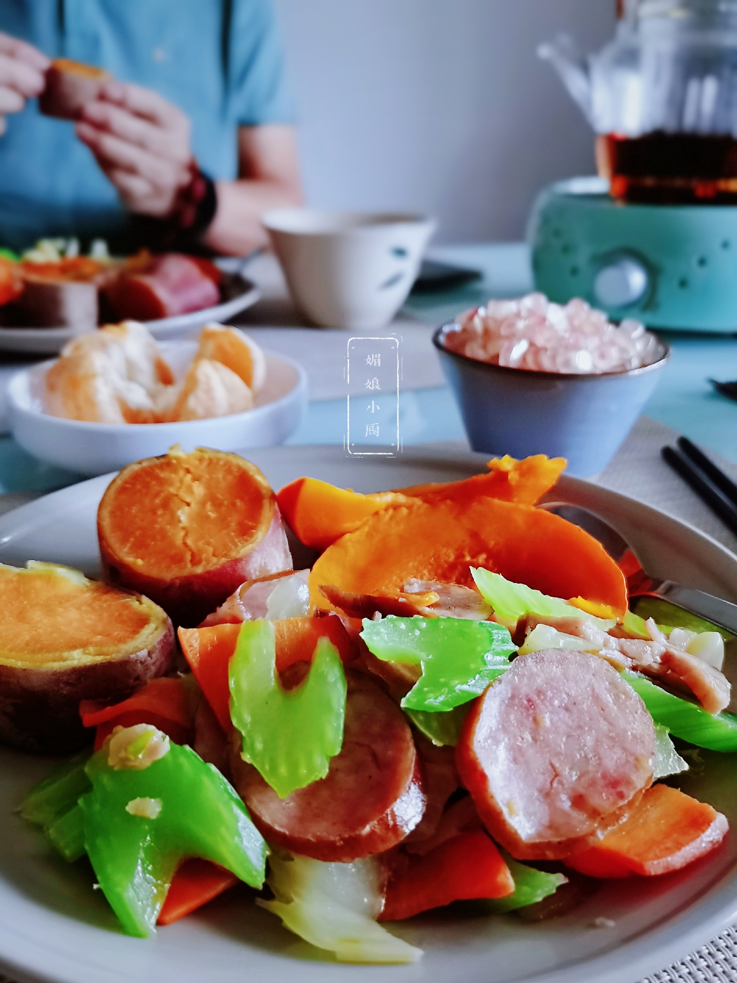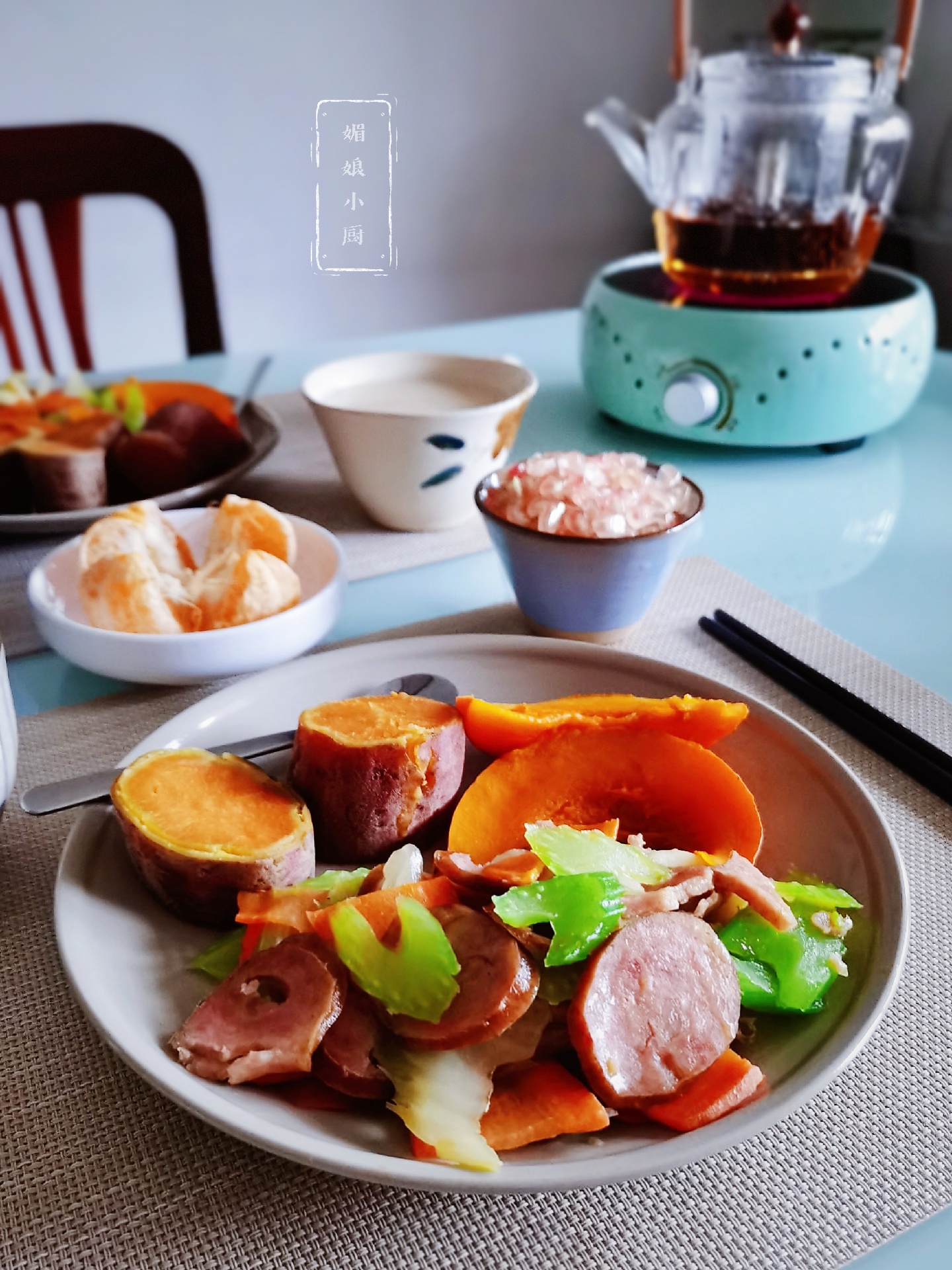 🍒 9-24早餐打卡:奶茶+西芹炒哈尔滨红肠+红薯南瓜