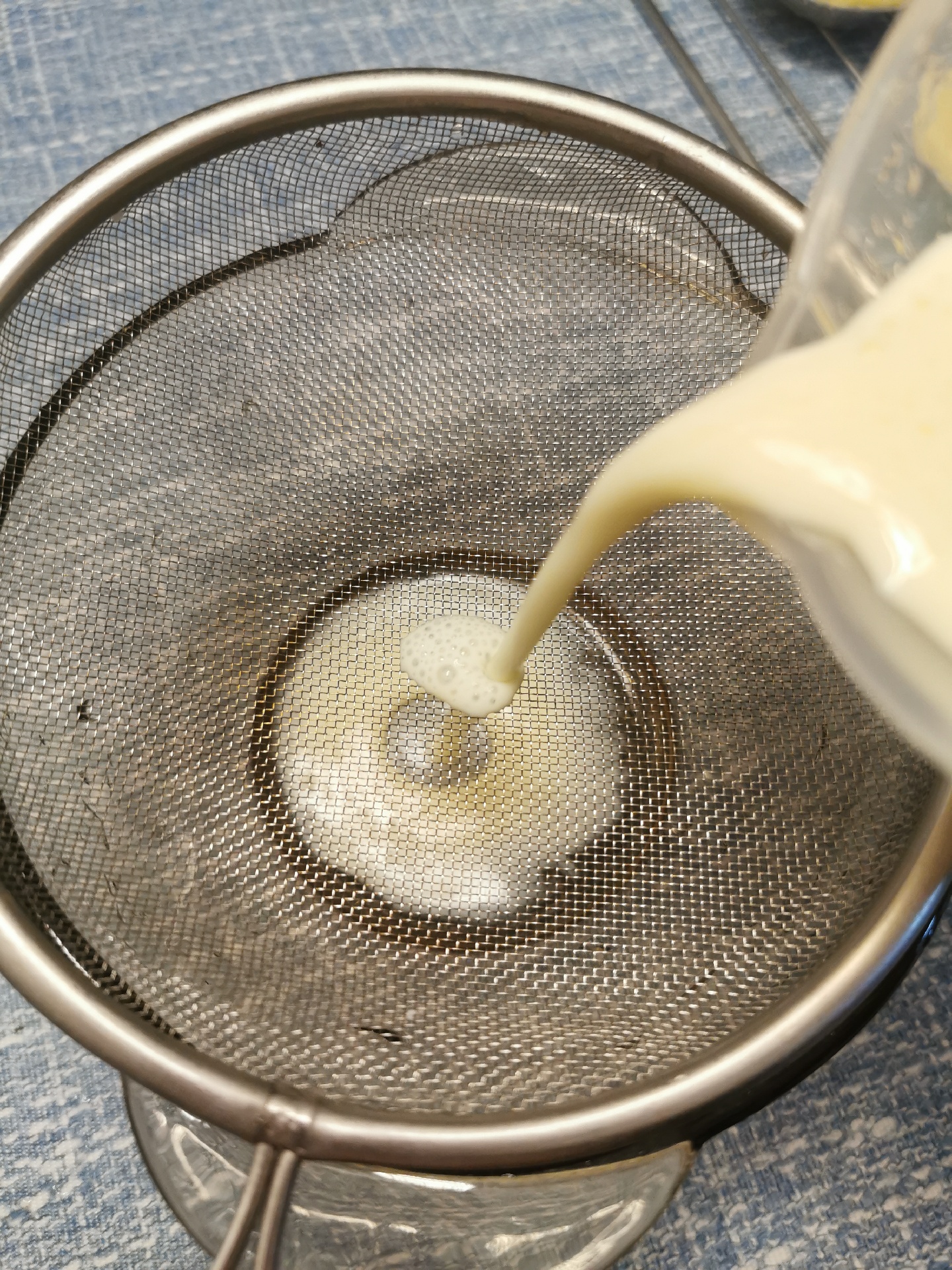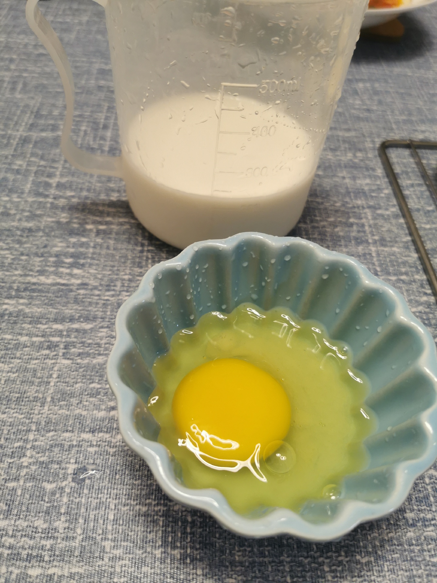 一个蛋加糖搅拌均匀后加牛奶200ml,过筛几次,静置五分钟,消泡