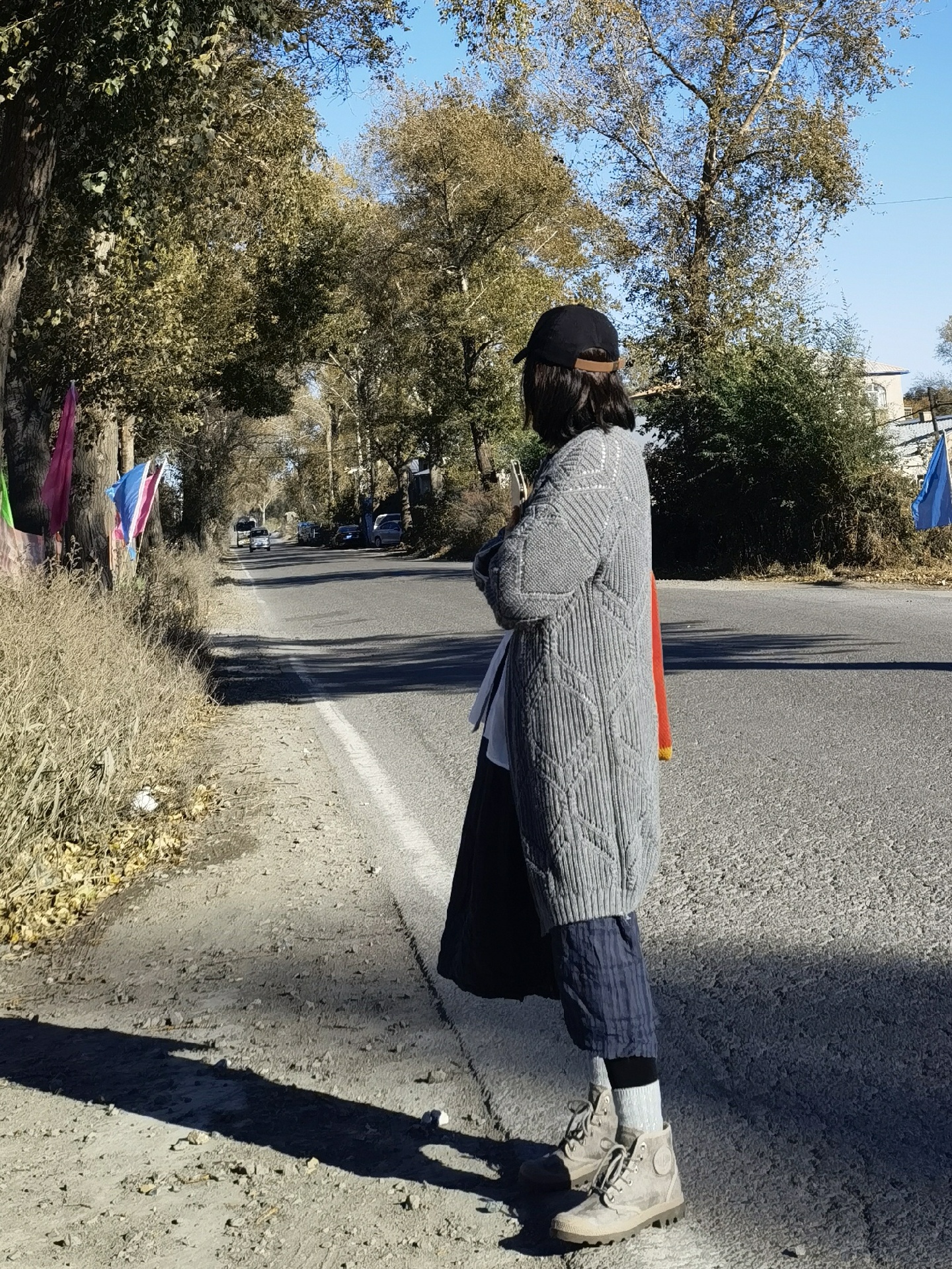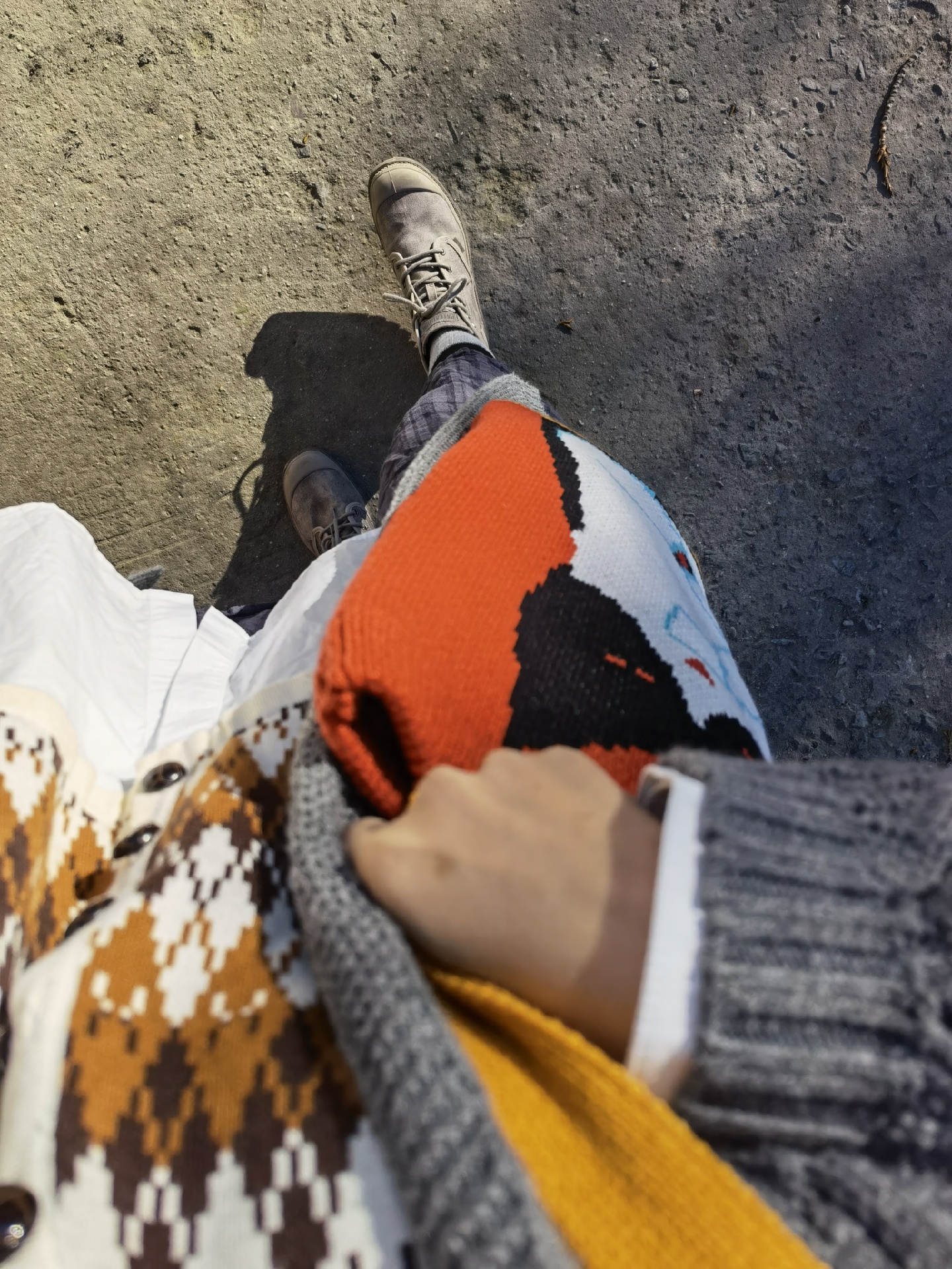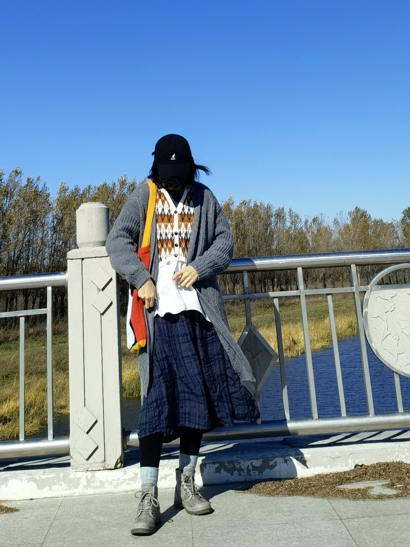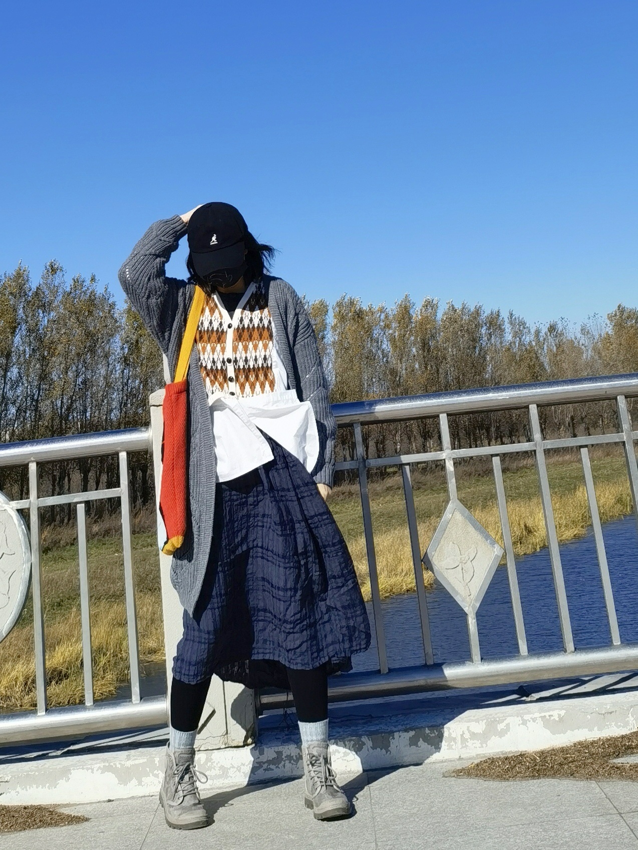 灰色毛衣外套➕深蓝色格子连衣裙