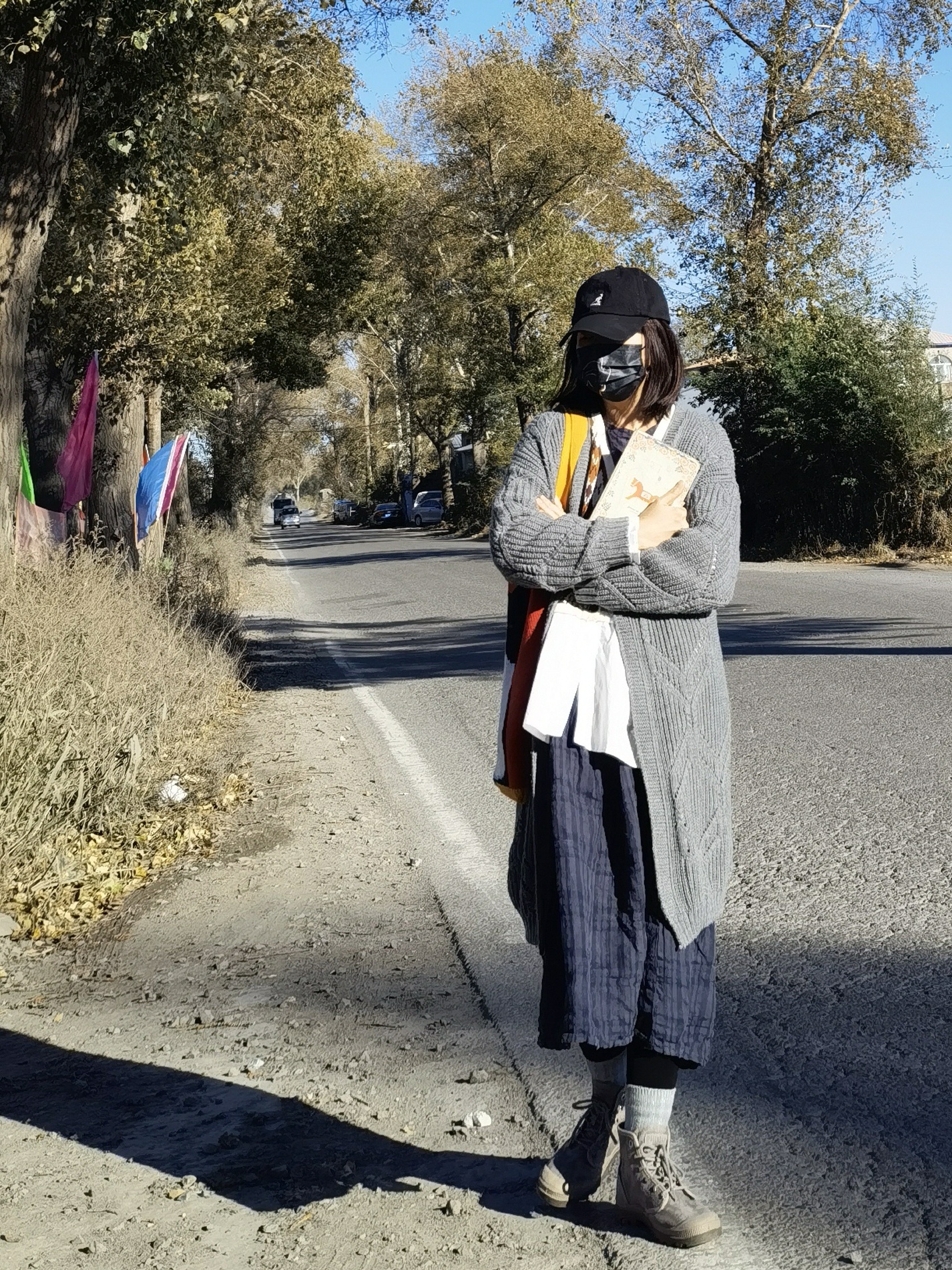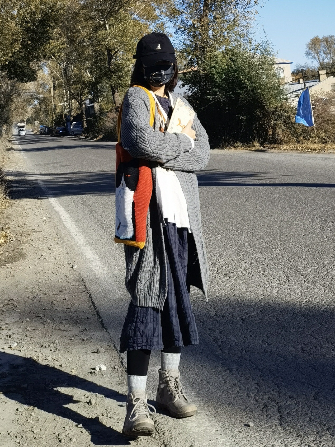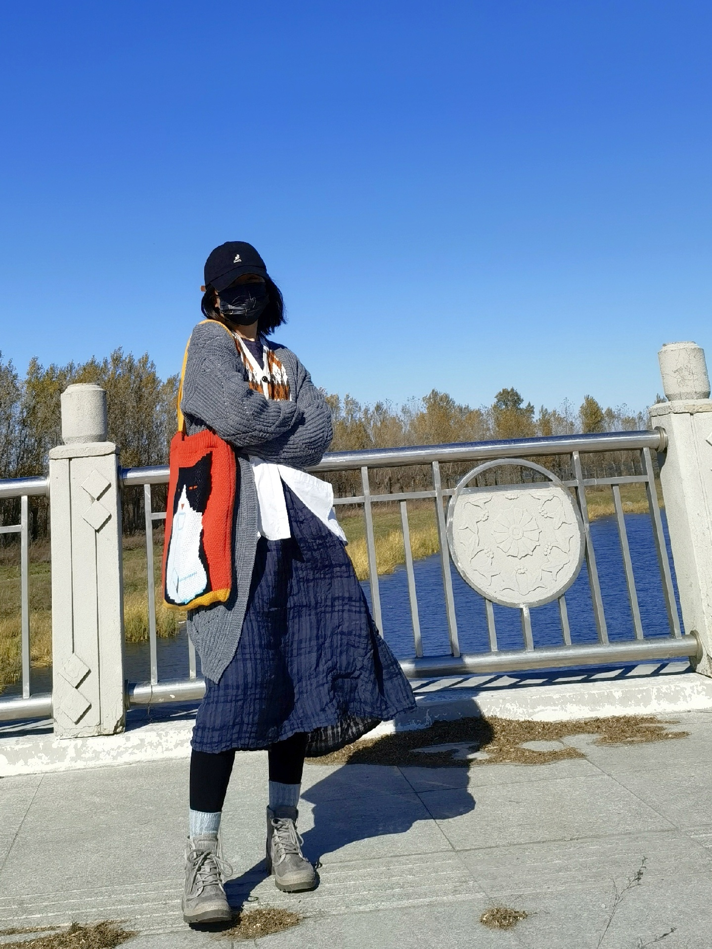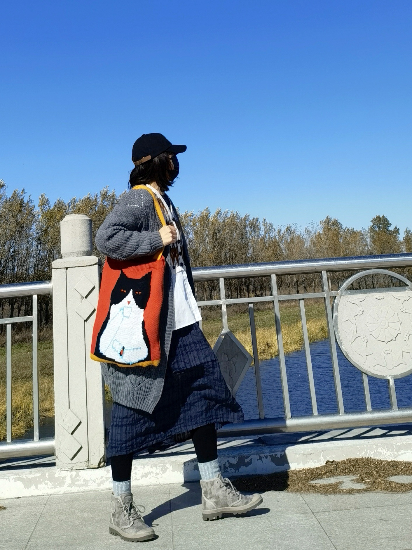 再拎一个特别的针织包包,桔红色背景色加上一只黑白相间的喵,特别醒目!