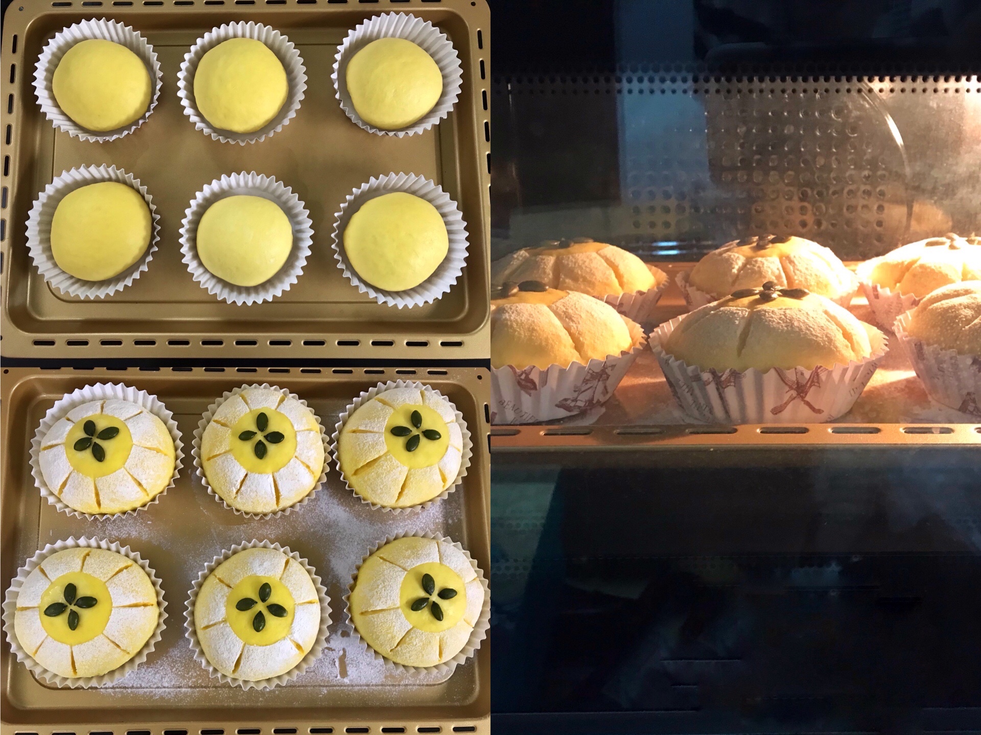 材料:面包粉200克,低粉50克,糖30克,盐3克,酵母3克,奶粉10克,牛奶105克,南瓜泥75克,黄油20克,瓜子仁适量