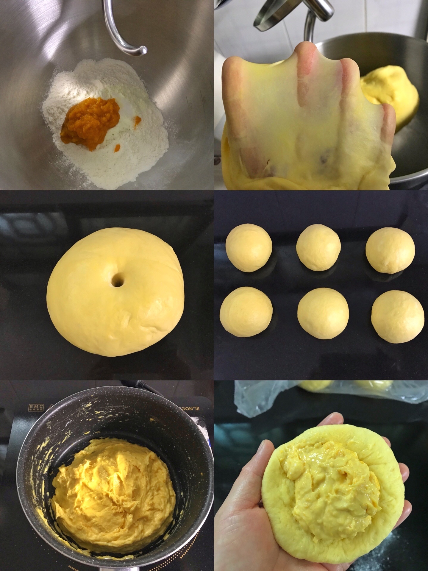 5⃣️、取一个面团,按扁后包入一份南瓜乳酪馅,捏紧收口。