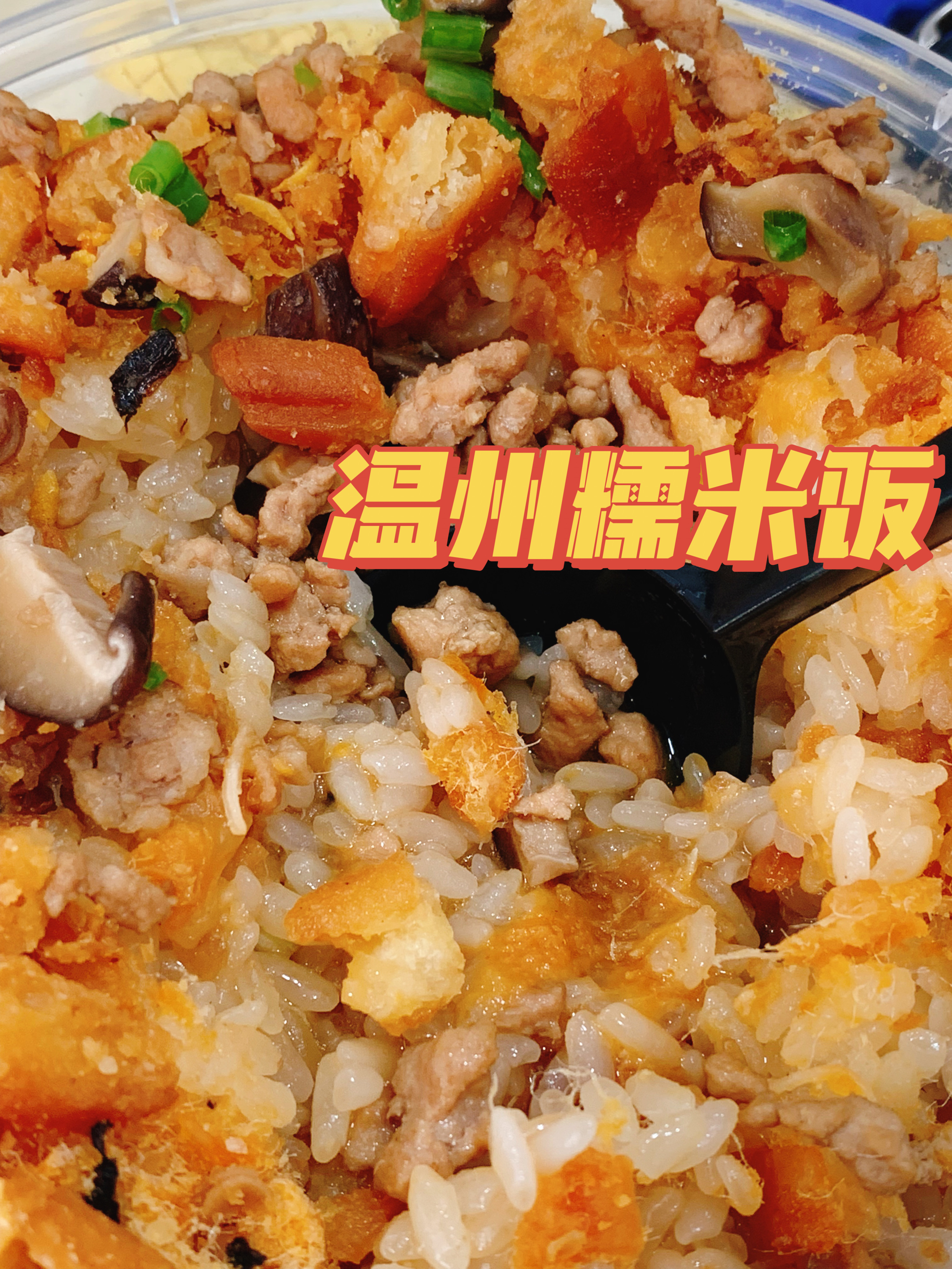 1⃣️温州糯米饭:糯米饭➕油条酥➕肉松➕香菇➕猪肉➕葱花➕灵魂汤汁,软糯有层次,大份的够两个人吃!