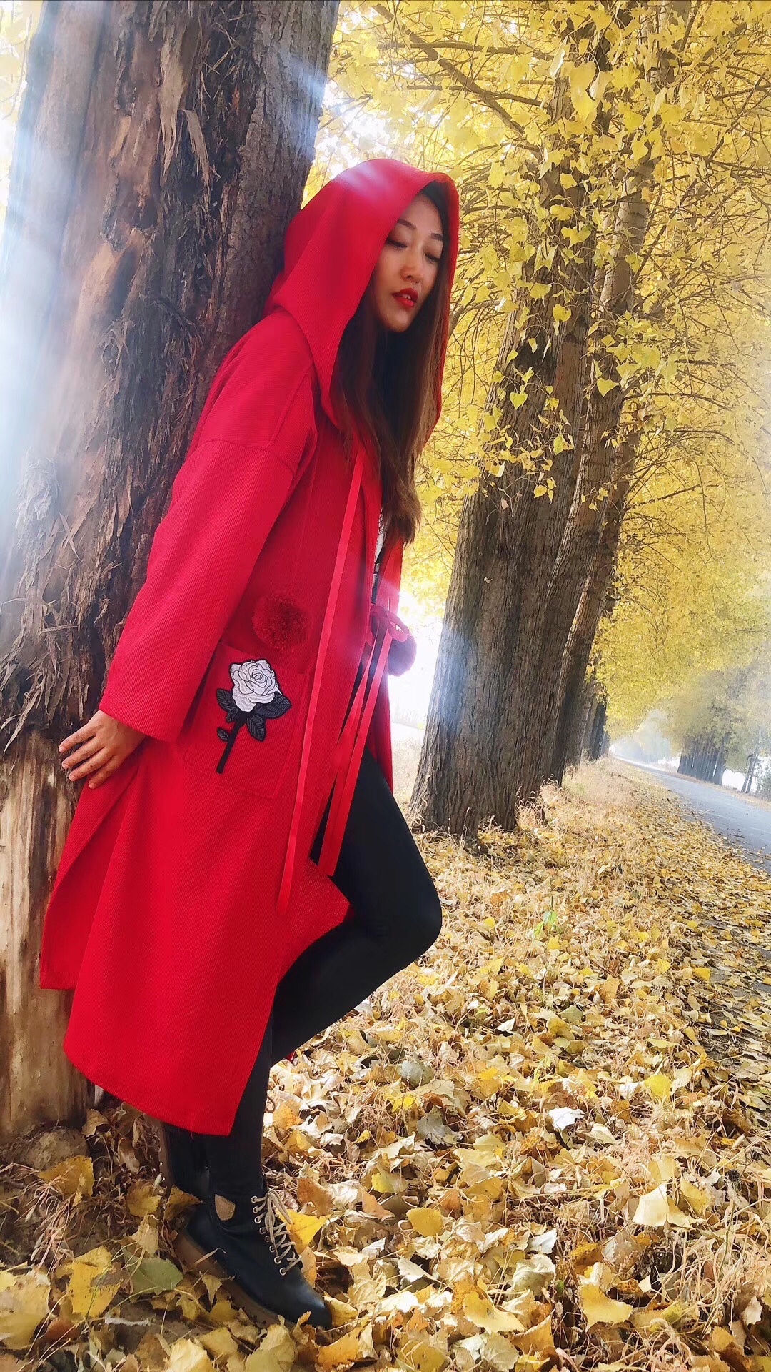 🍁4、 站着靠树拍照,可以靠着树微微仰头或低头看,一侧退屈膝。