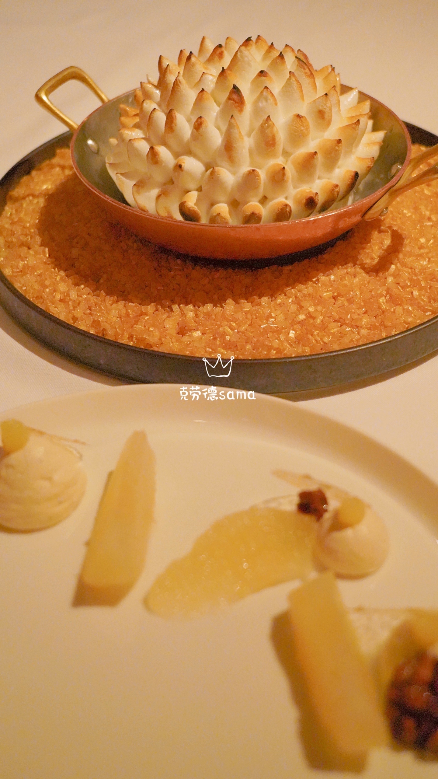 🍫苹果木熏厚切牛柳非常厚道,赠送的番薯及鱼子酱、SW芝士通心粉,随便一款的量都能作为我一顿餐食,而且这道菜的呈现也非常有仪式感,牛肉先是在宝箱里开箱为食客呈现,然后服务员当场切好分餐至食客的餐盘里🐮🐮🐮
