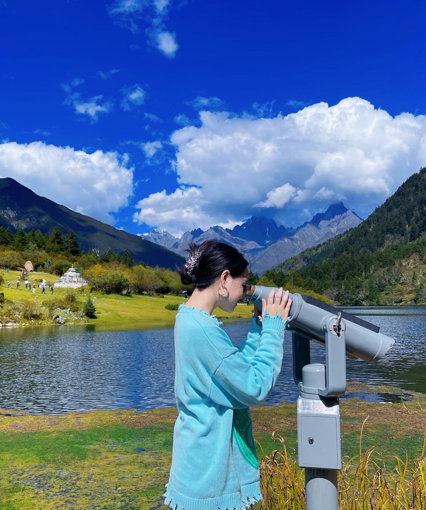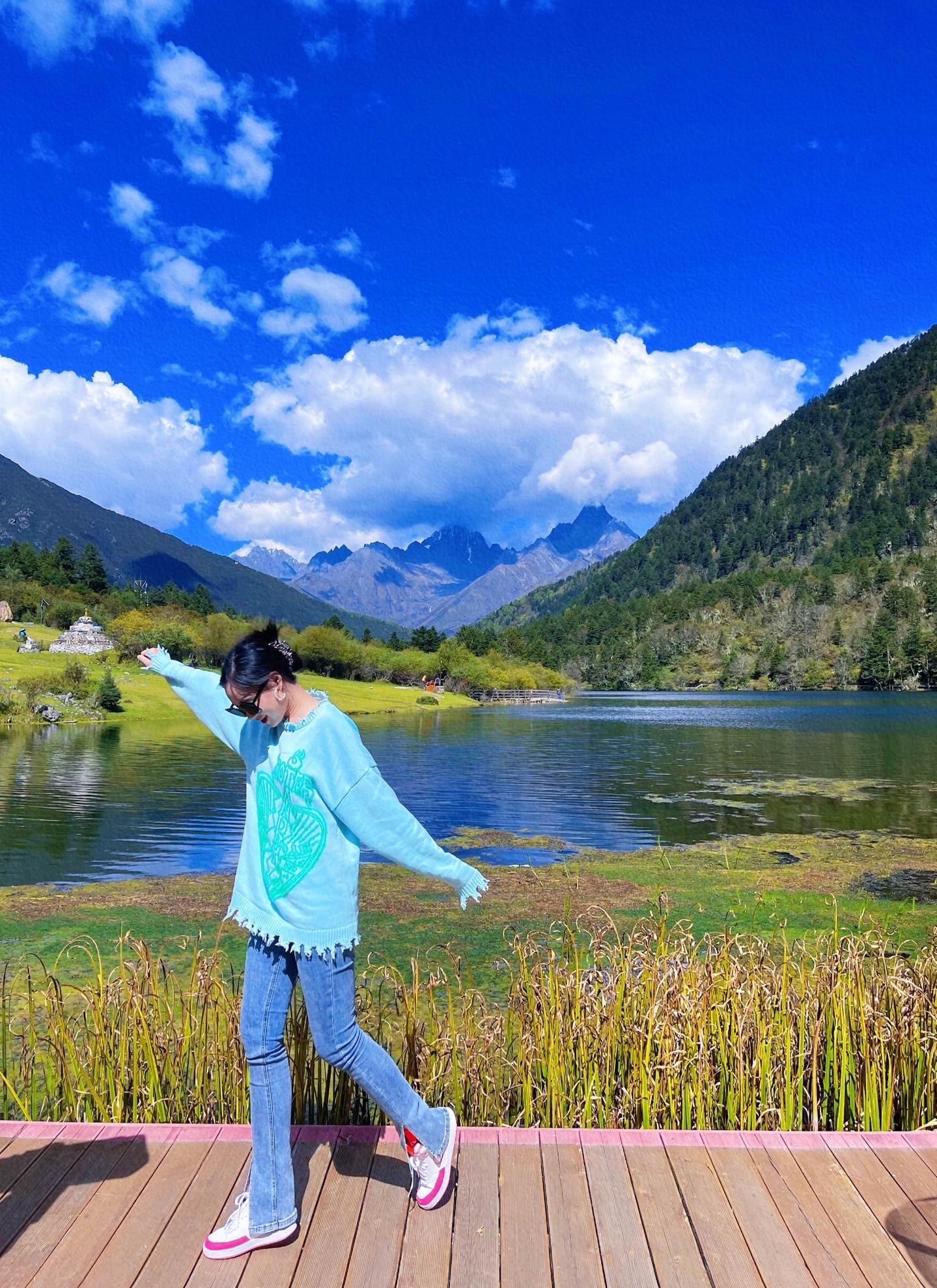 3⃣️. 🚍第三站七色海:被山川,树林,草坪包围的湖泊,倒映着远处的莲花雪山,📷湖中倒影 天空之境的即视感☀️