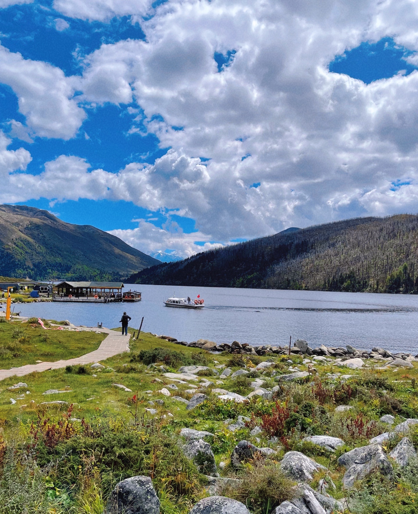 1⃣️. 🚍第一站木格措(野人海):但观光车不能直达,还需要坐船换乘到对岸,船分为景观大船🚢和快艇🛥️,都是随机的,凭运气排队,我是去程大船 回程快艇,明显感受大船真的是龟速呀 慢慢慢😂