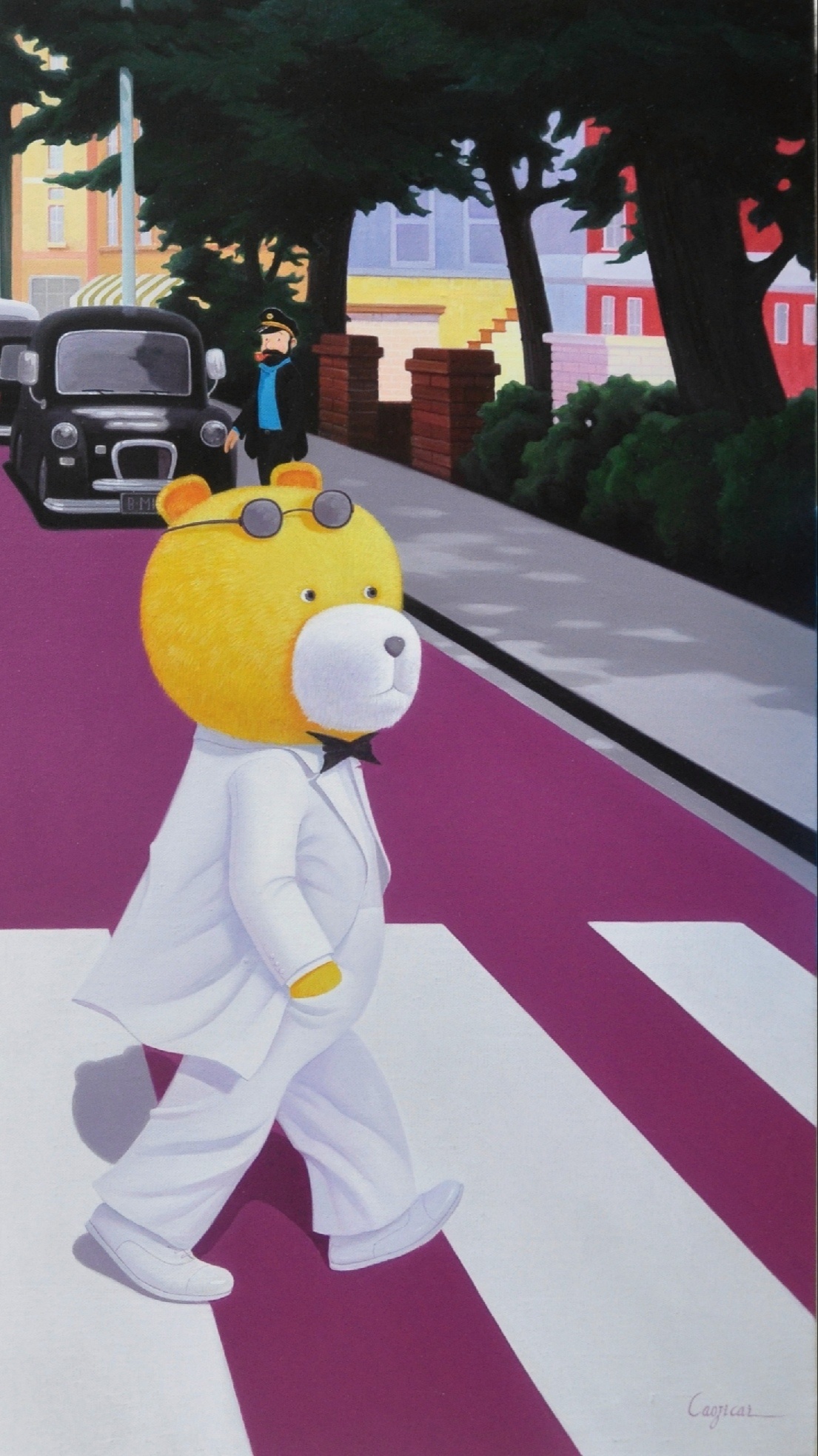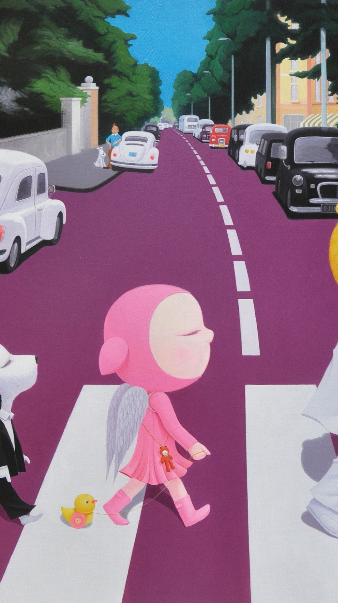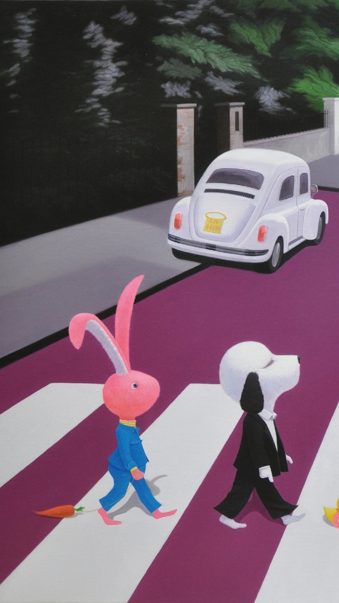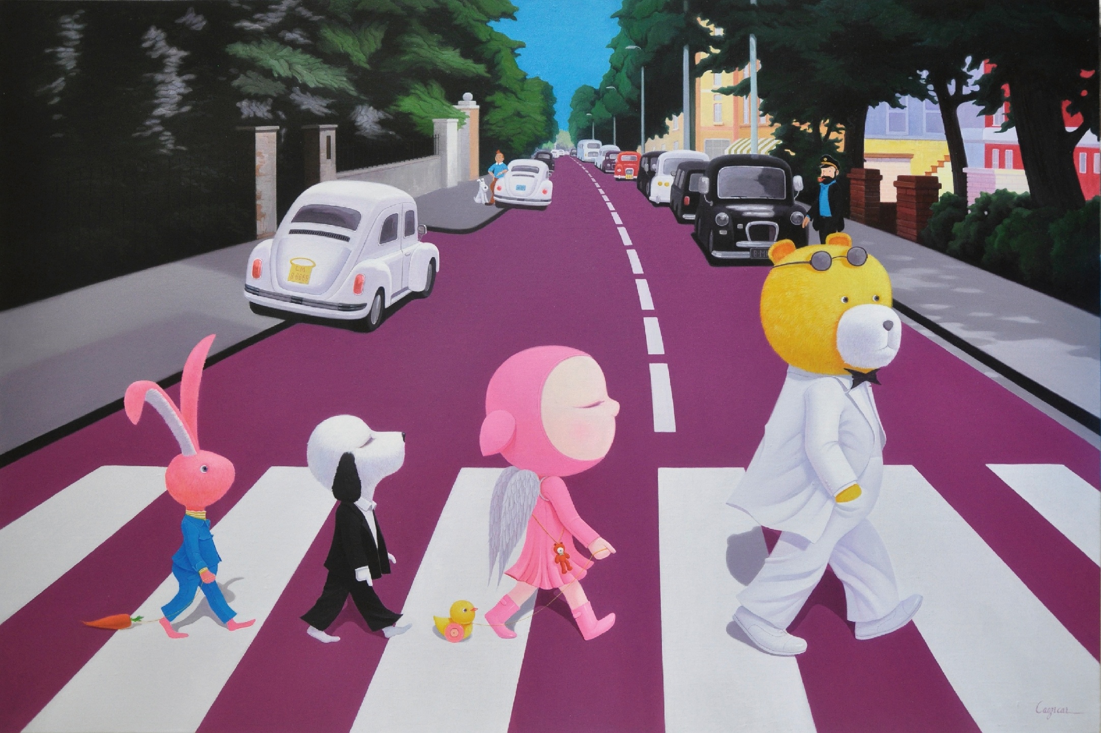 以我的卡通元素作品风格将《Abbey Road》的专辑封面以再现,将俏皮可爱的小茜卡和她的伙伴们融入其中,着力为观者营造了一个乌托邦式的精神避难所,在这个乌托邦里,没有都市里危险的诱惑和陷阱,没有阴暗的人性,不会让你时时刻刻感到紧张和焦虑,你要做的只是驯服内心的小野兽去细嗅艺术与你的芬芳和温暖!因为,置身在这样一个如履薄冰的现实社会里,美丽的童话故事虽然不能代替残酷的现实生活,但是陪伴我们的却是童真的美好,来吧让我们在一起迎着希冀的阳光一起“走在马路上”