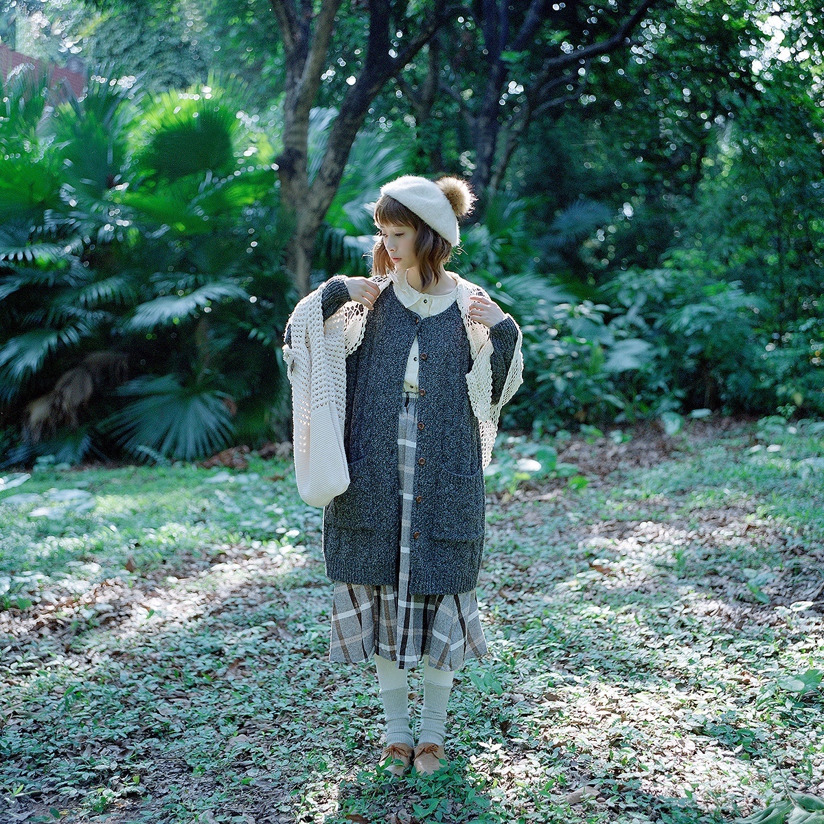深灰色的针织毛衣配上手钩披肩还有格子半裙,绝绝子啊☺☺戴上毛球贝雷帽,森系平底鞋,超好看哒!☺