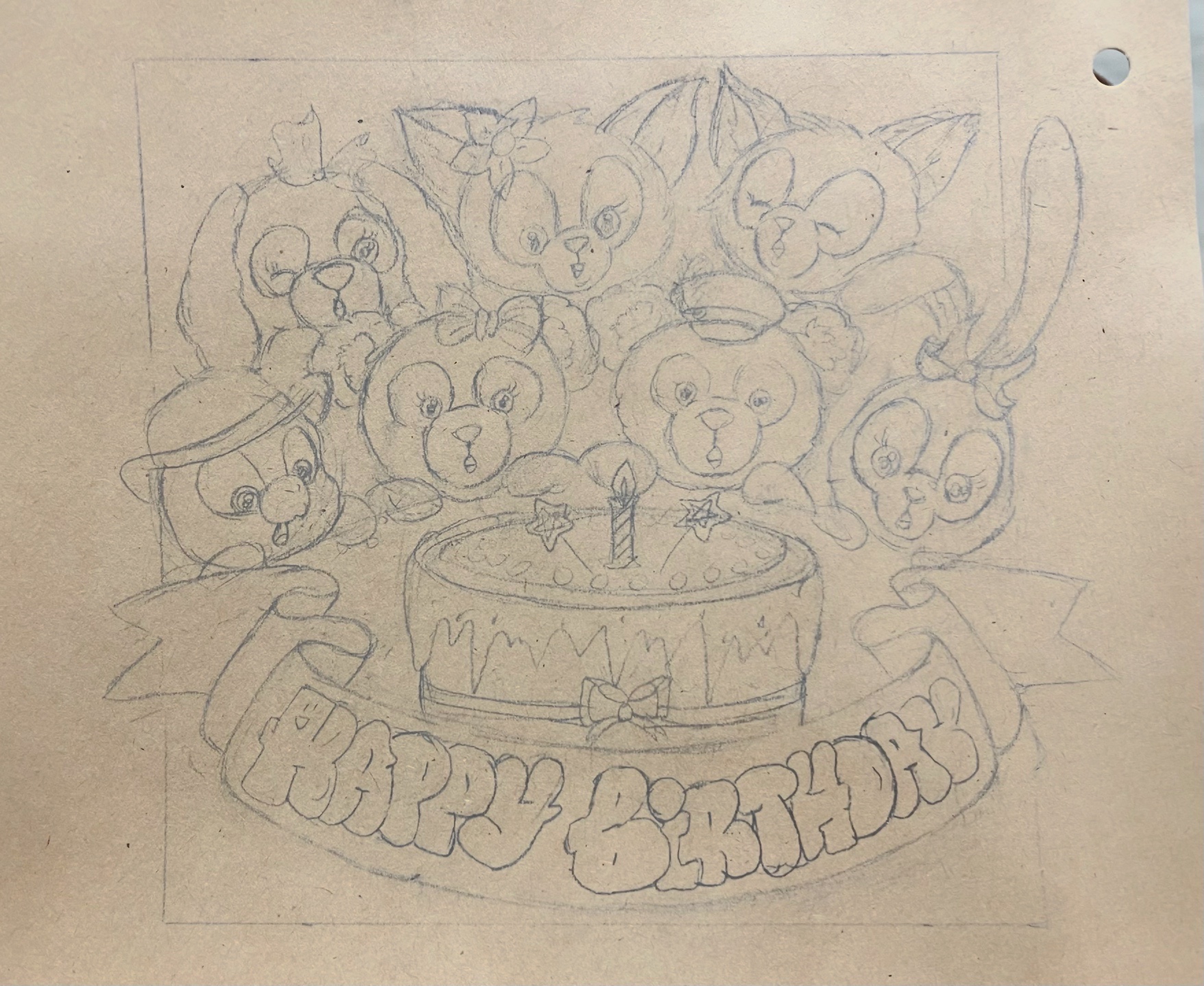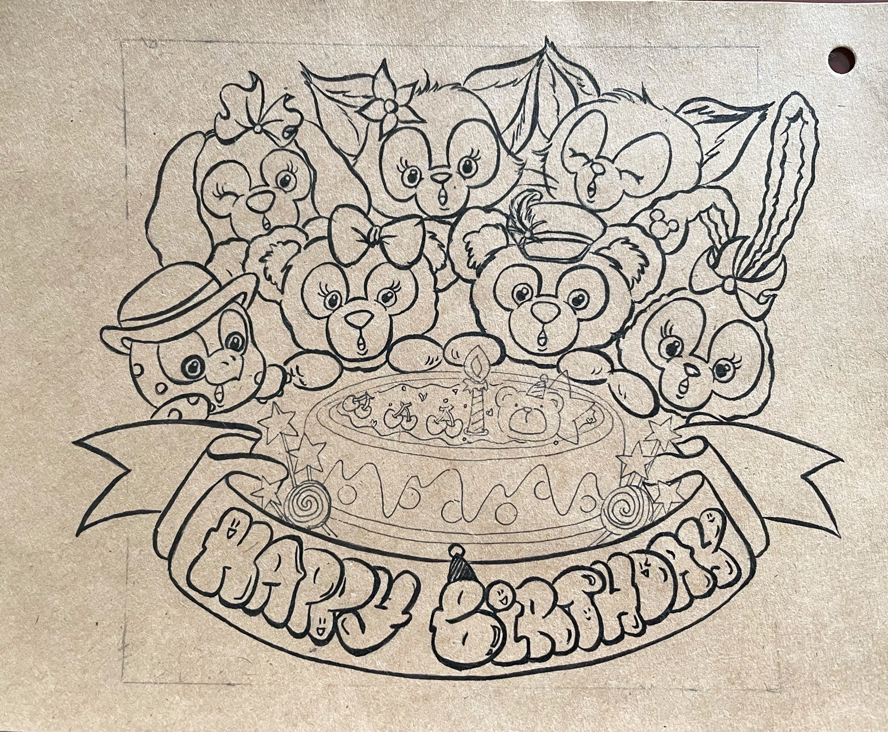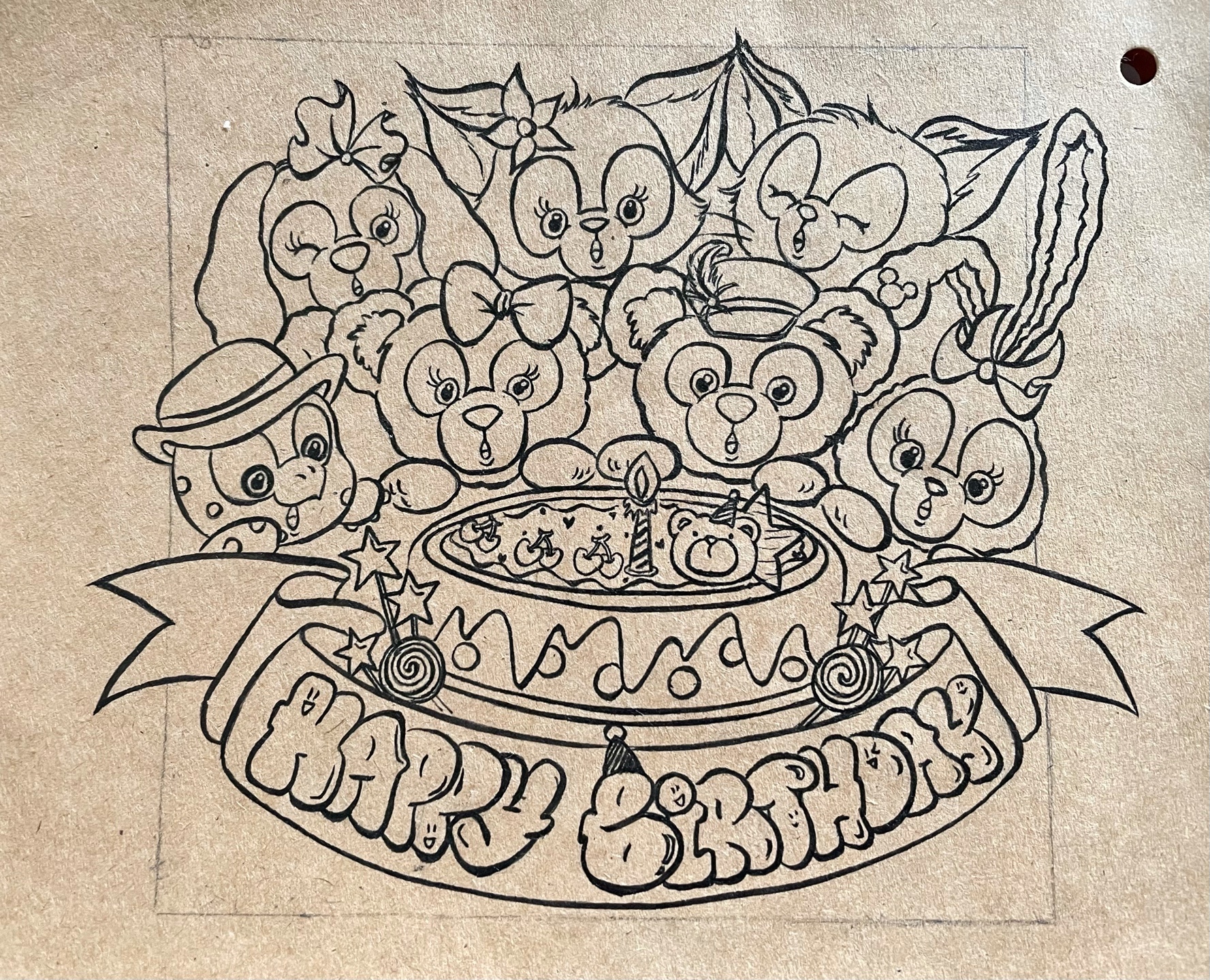 这张是一位粉丝想送给她的小伙伴的生日卡片噢,自己画完也好喜欢啊,好适合送给大朋友啊小朋友~参考的是上海迪士尼五周年的一张海报,可爱的达菲七宝围在一起好有氛围~
