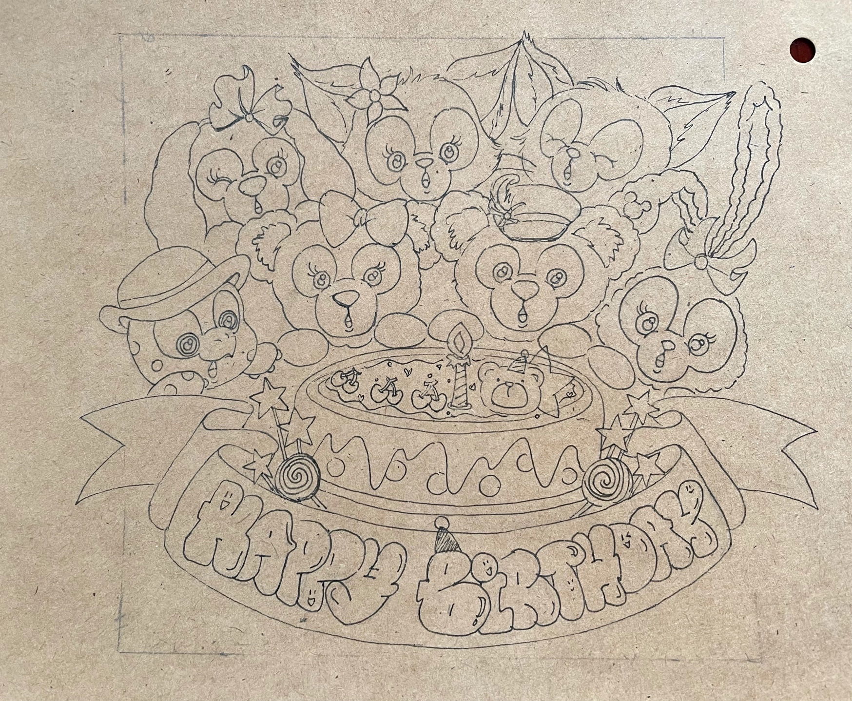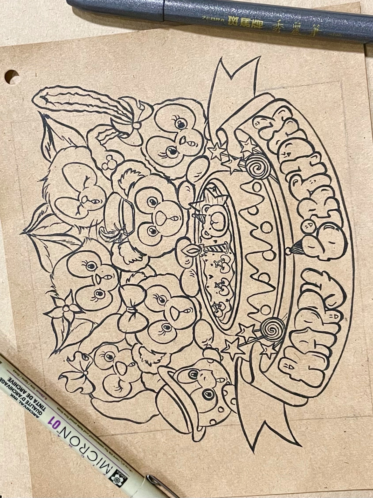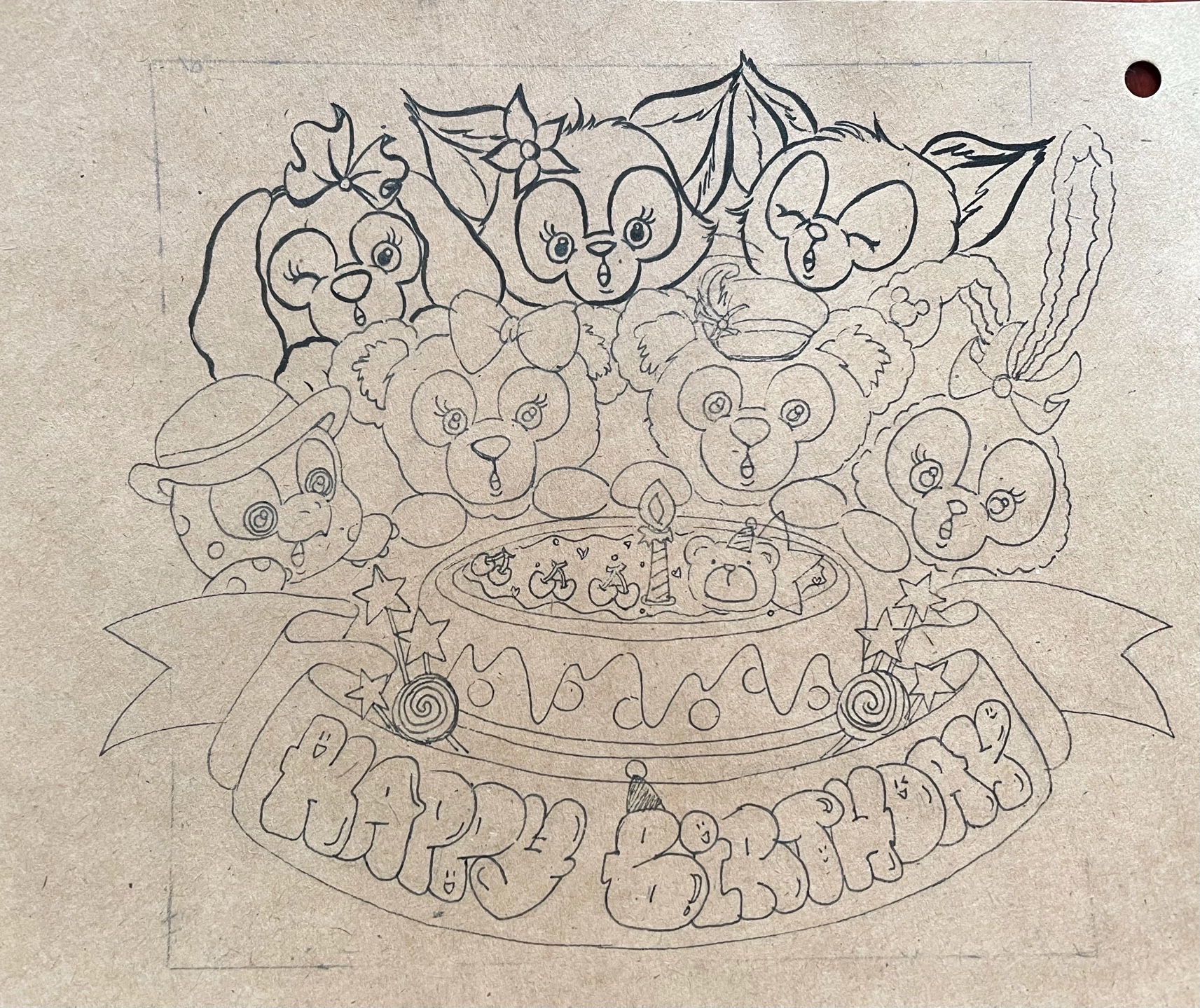 这张是一位粉丝想送给她的小伙伴的生日卡片噢,自己画完也好喜欢啊,好适合送给大朋友啊小朋友~参考的是上海迪士尼五周年的一张海报,可爱的达菲七宝围在一起好有氛围~