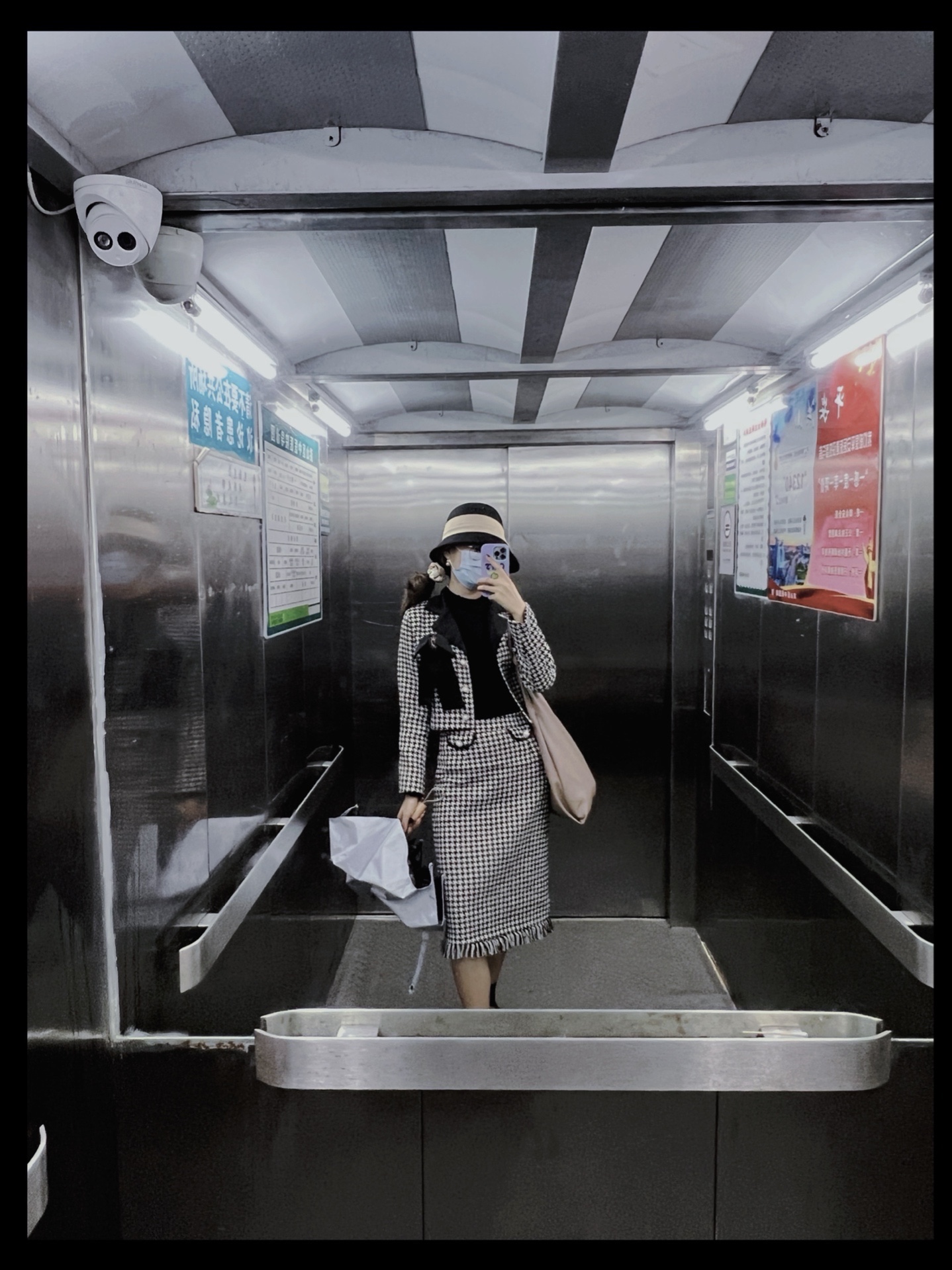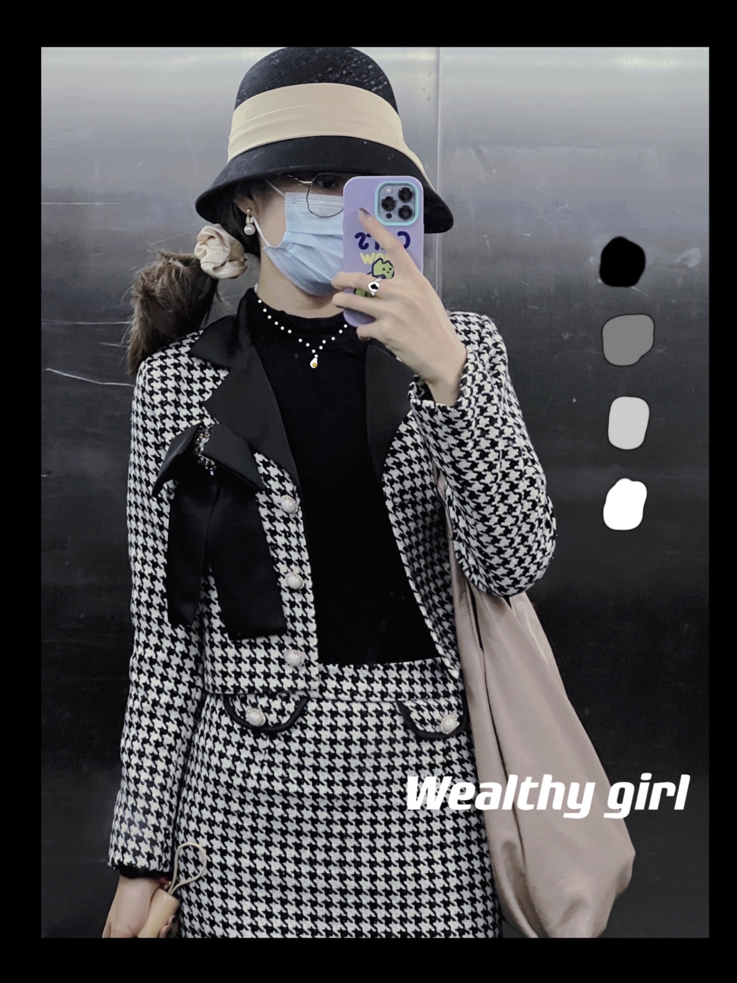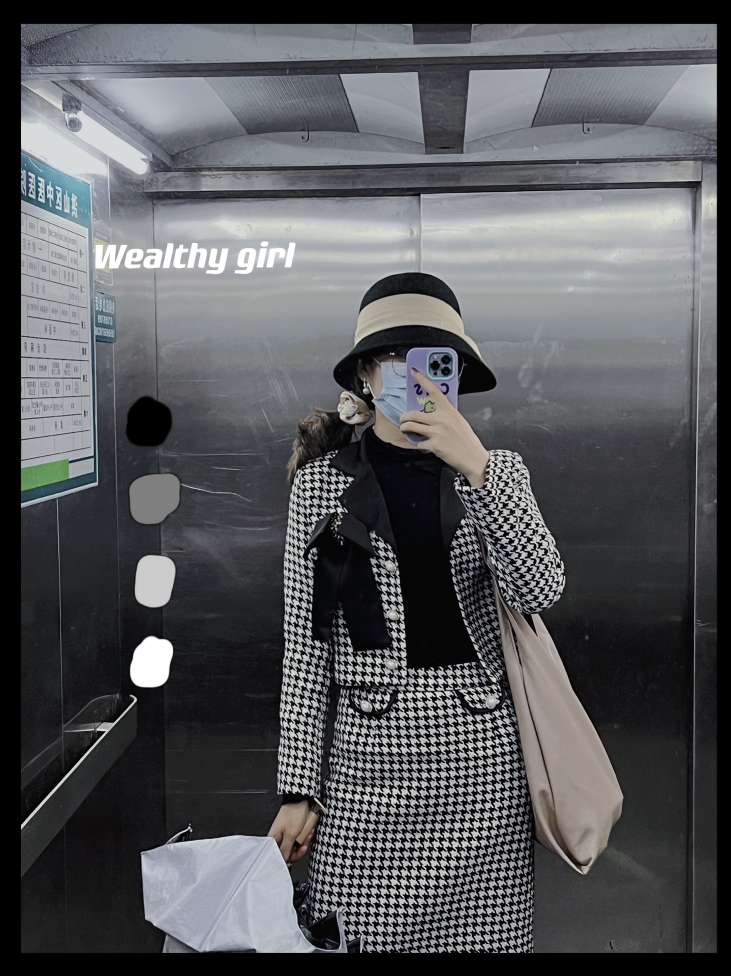 🔲这套衣服就属于上身短款西服,下身包臀裙的设计,是明显的小香风设计。