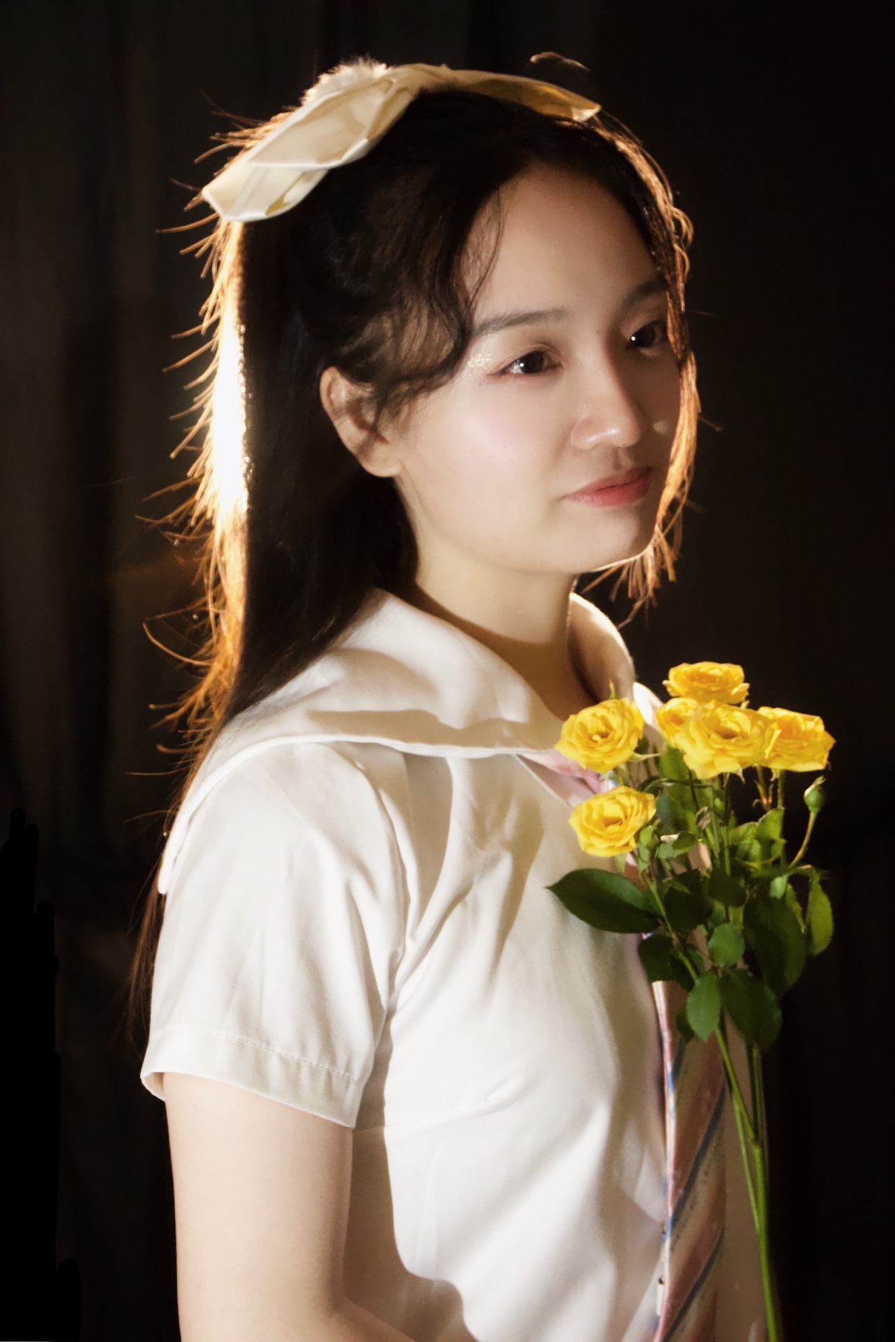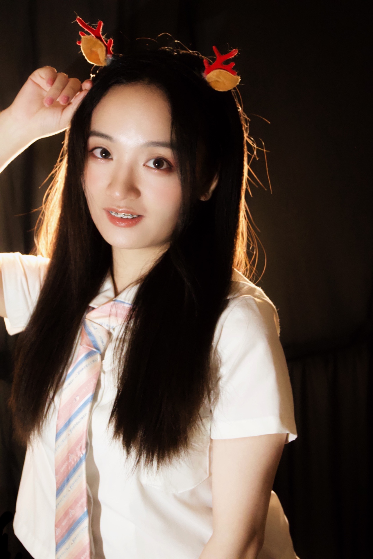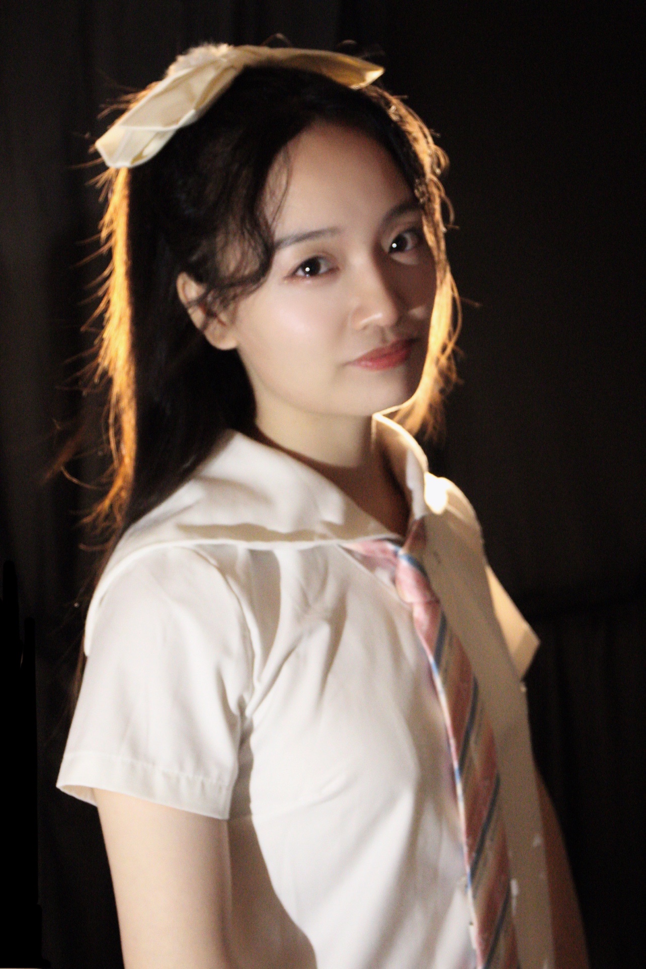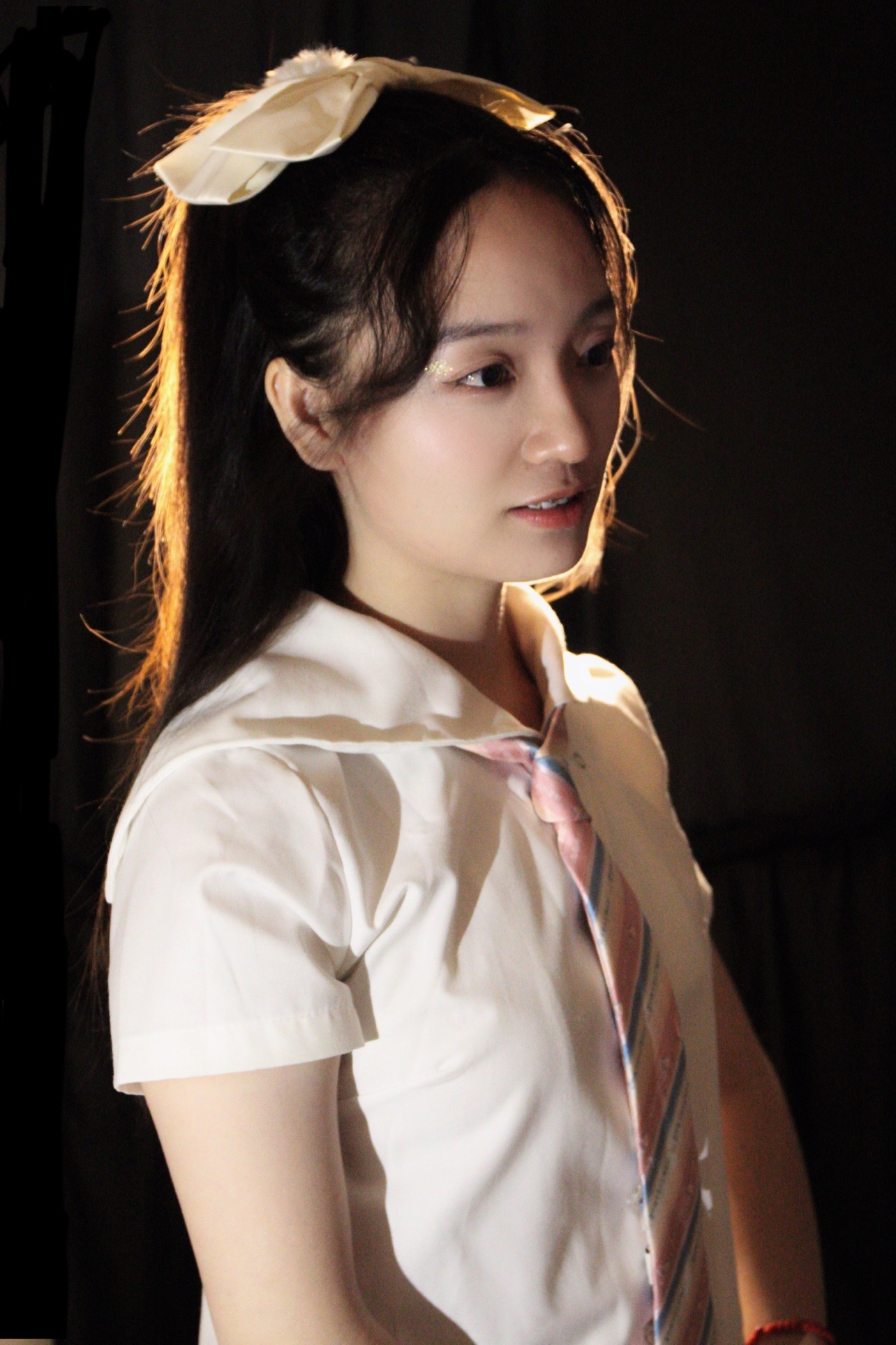 发光少女拍照秘诀,背后黑色背景布 + 背后暖色调灯 + 前面补光灯 = 发光少女