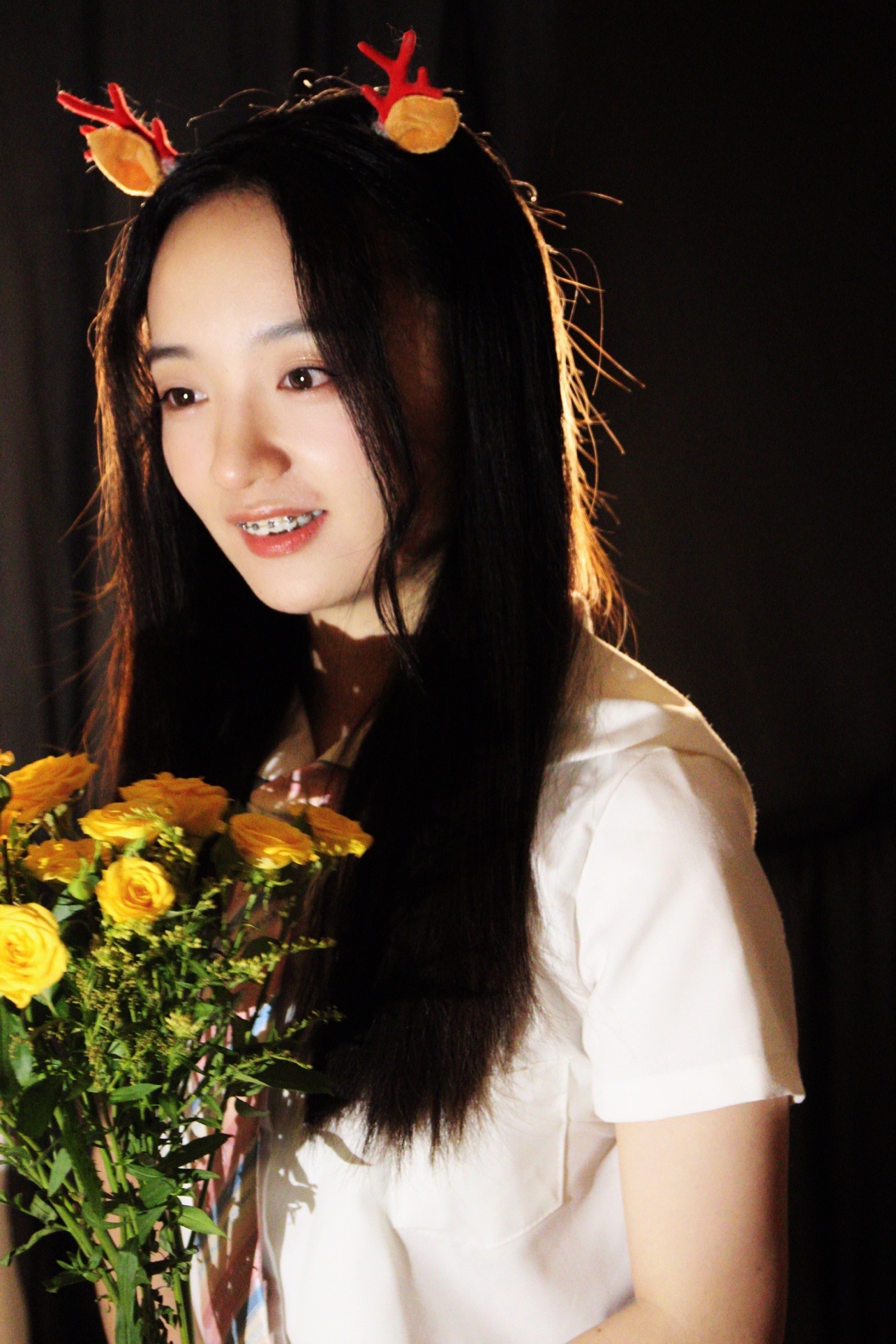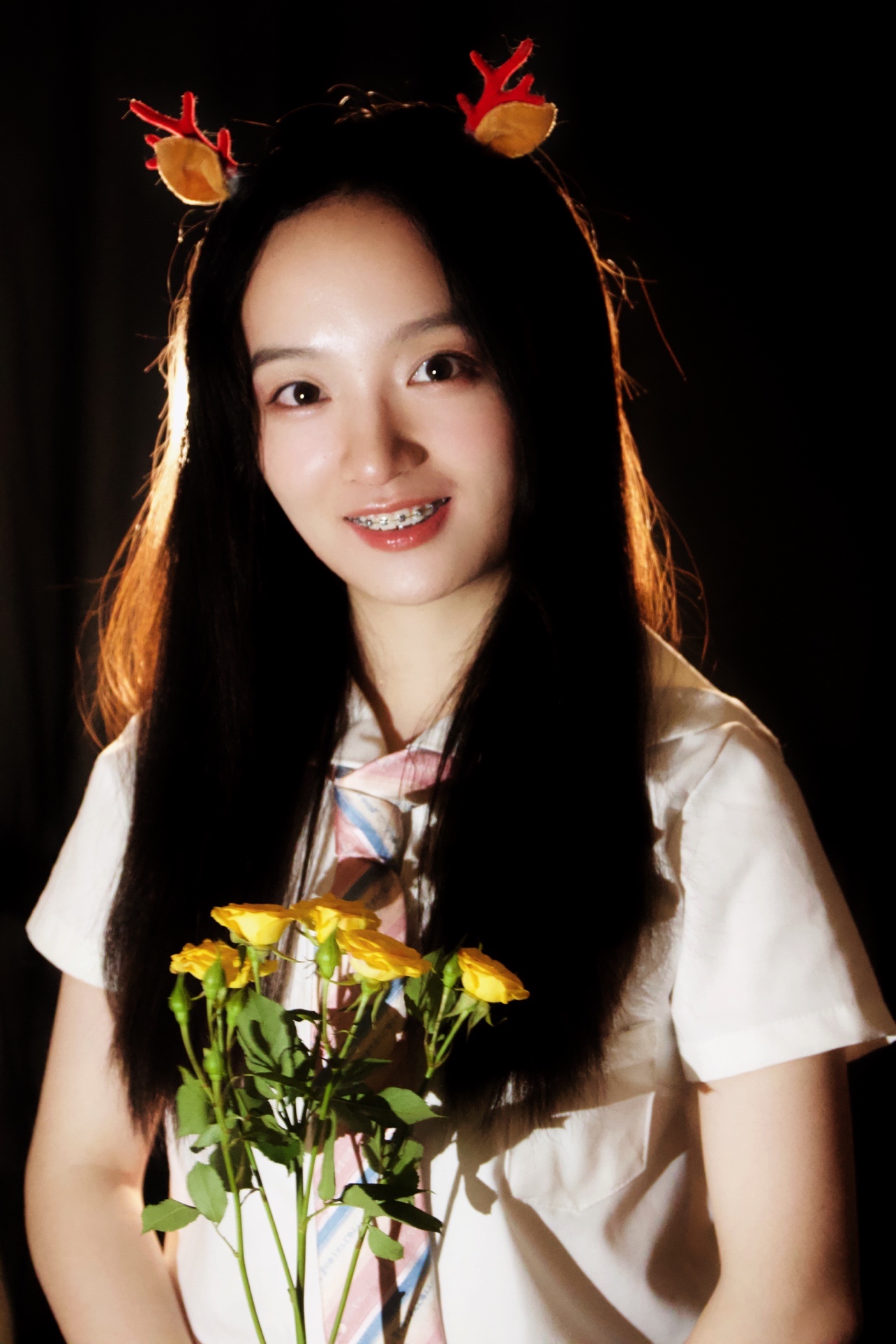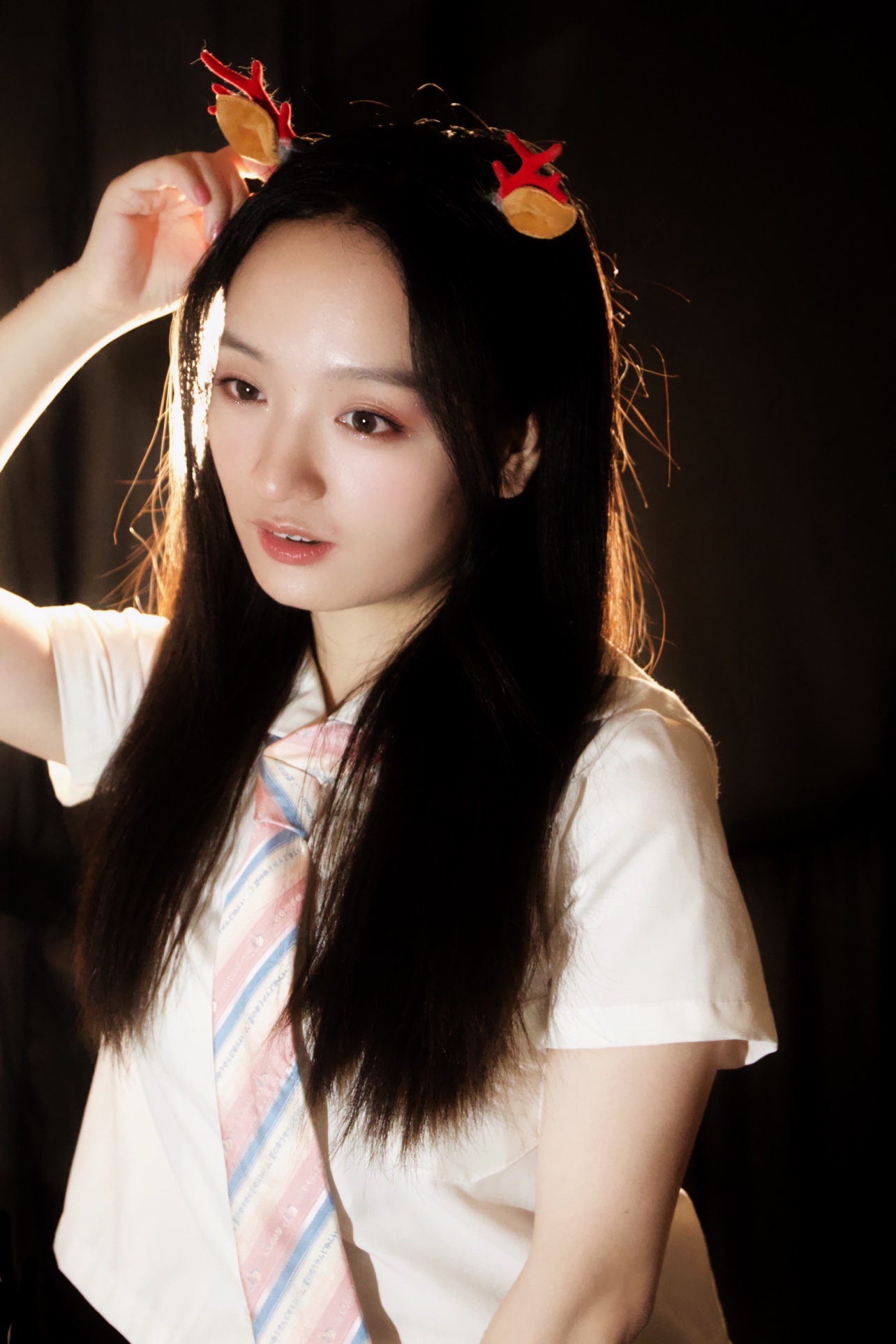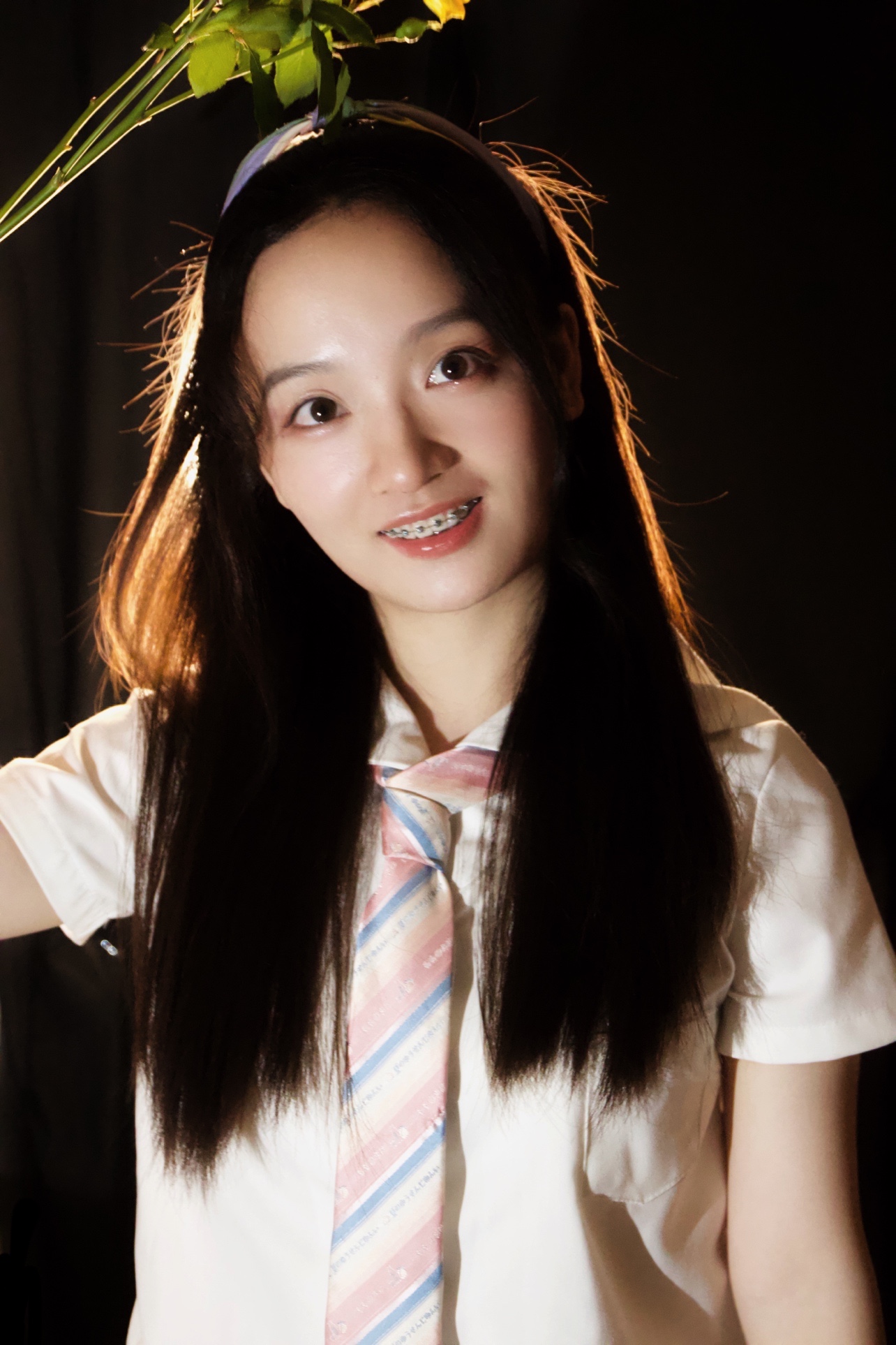 发光少女拍照秘诀,背后黑色背景布 + 背后暖色调灯 + 前面补光灯 = 发光少女