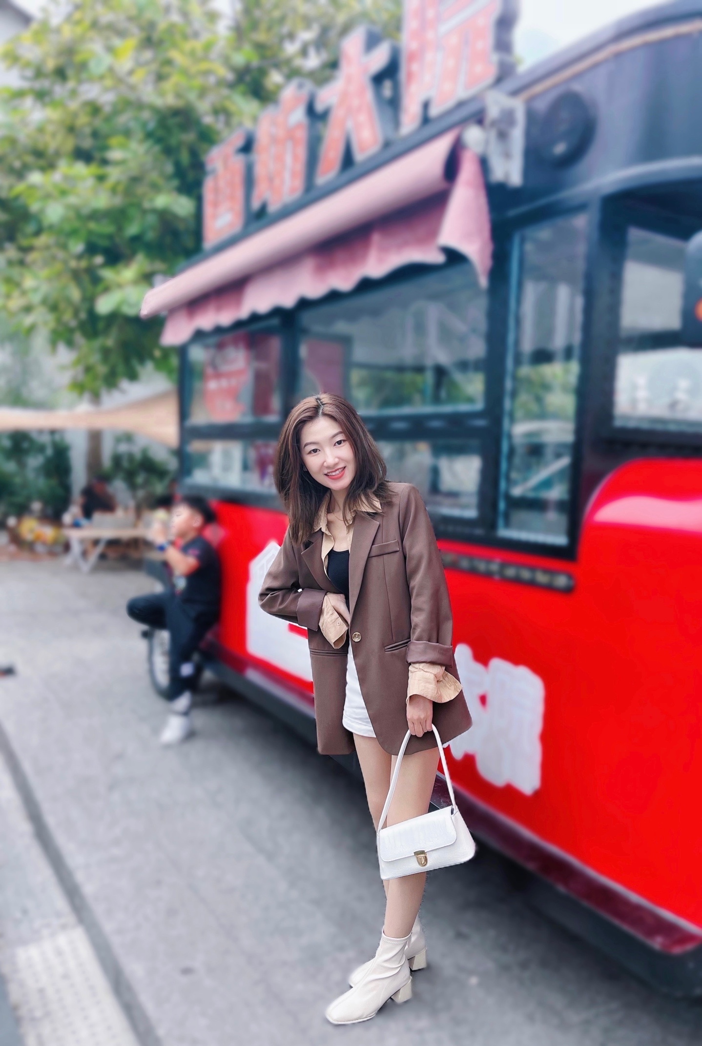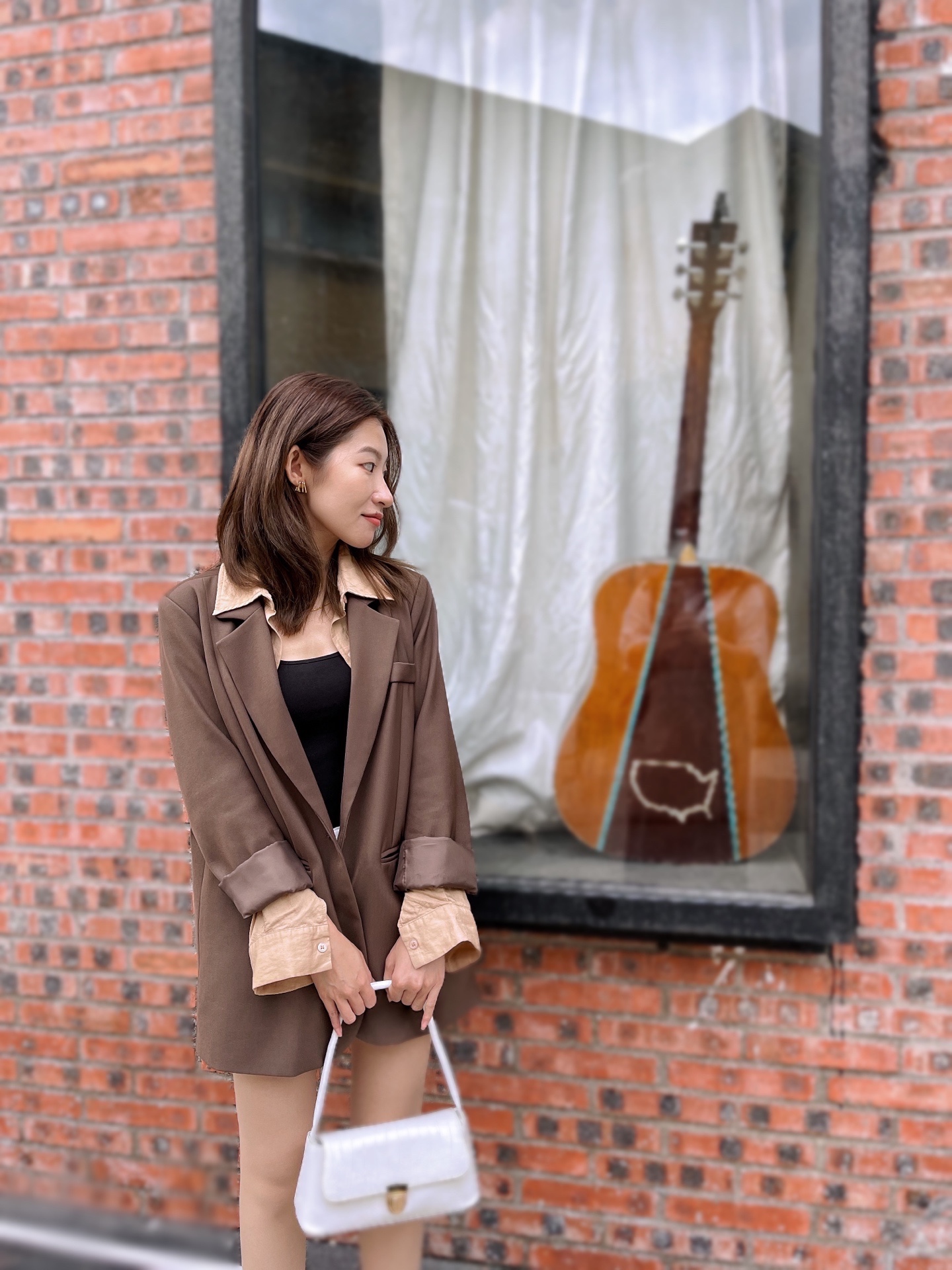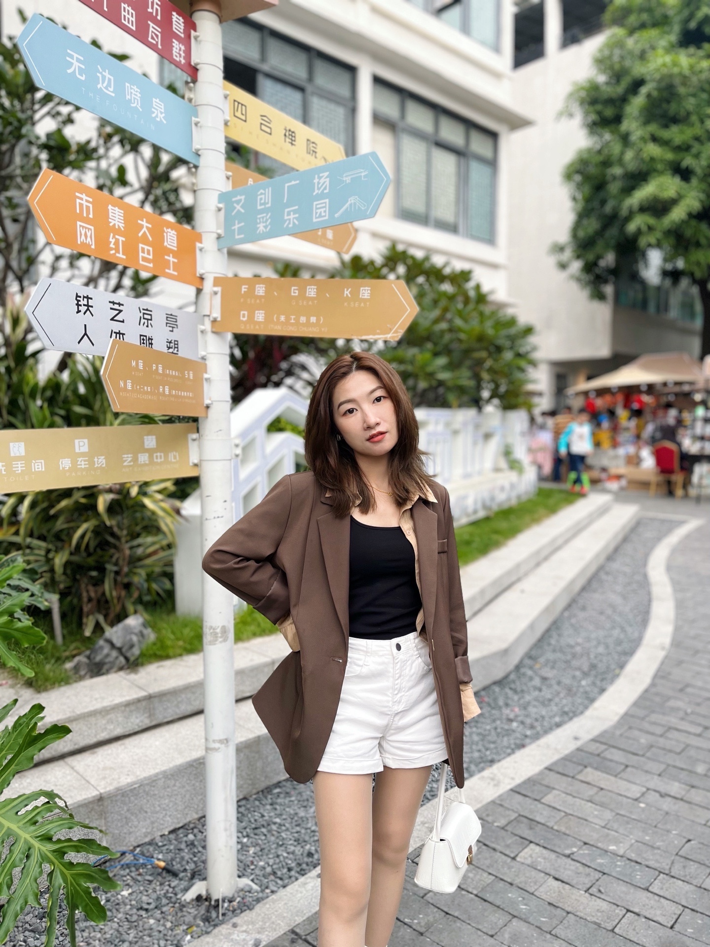 穿搭:背心+短裤+衬衣+西装外套+短靴+白色包包