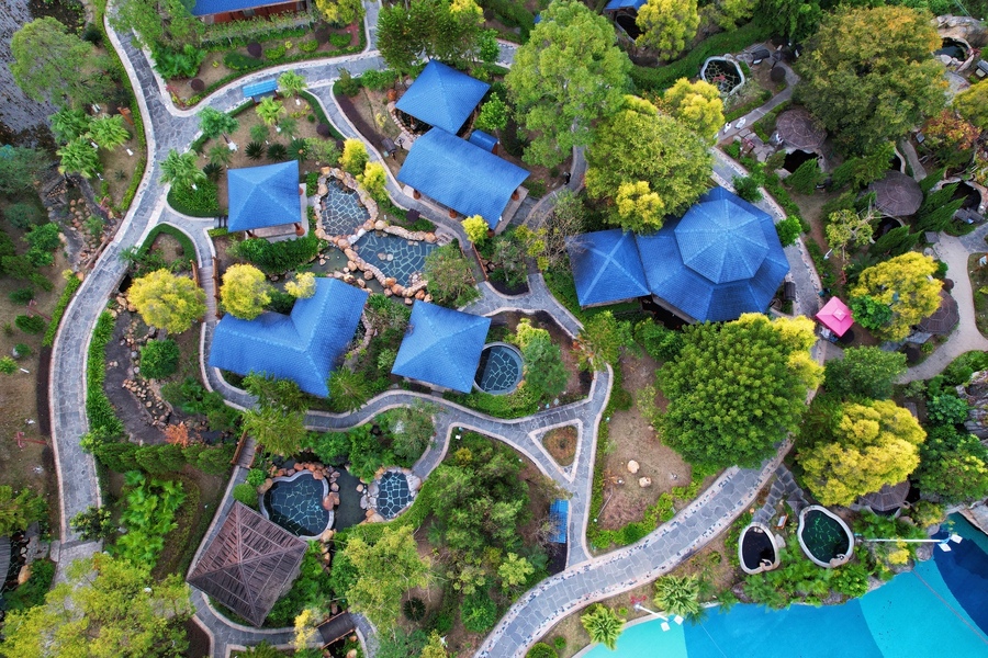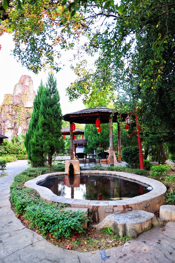 叶园温泉出口温度在68℃左右,温泉水质含有多种对人体有益的矿物质及微量元素,由于碱的含量最高,故为“苏打泉”,有很好的养生、医疗、美容、养颜之功效,室外温泉环境很好,客家围屋休闲区、别具特色的神秘神山溶洞区、造浪池、水疗SPA池、客家草药池、亲亲鱼疗池,养生池等应有尽有,整个池区分布在青山、翠竹环抱的自然美景之中,让您充分感受客家生态温泉的魅力!