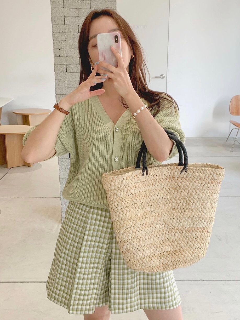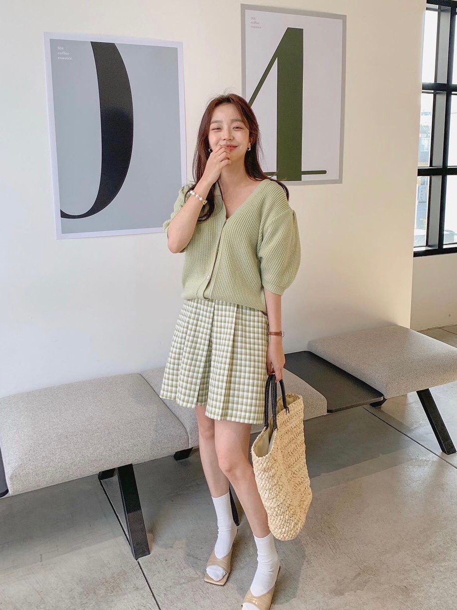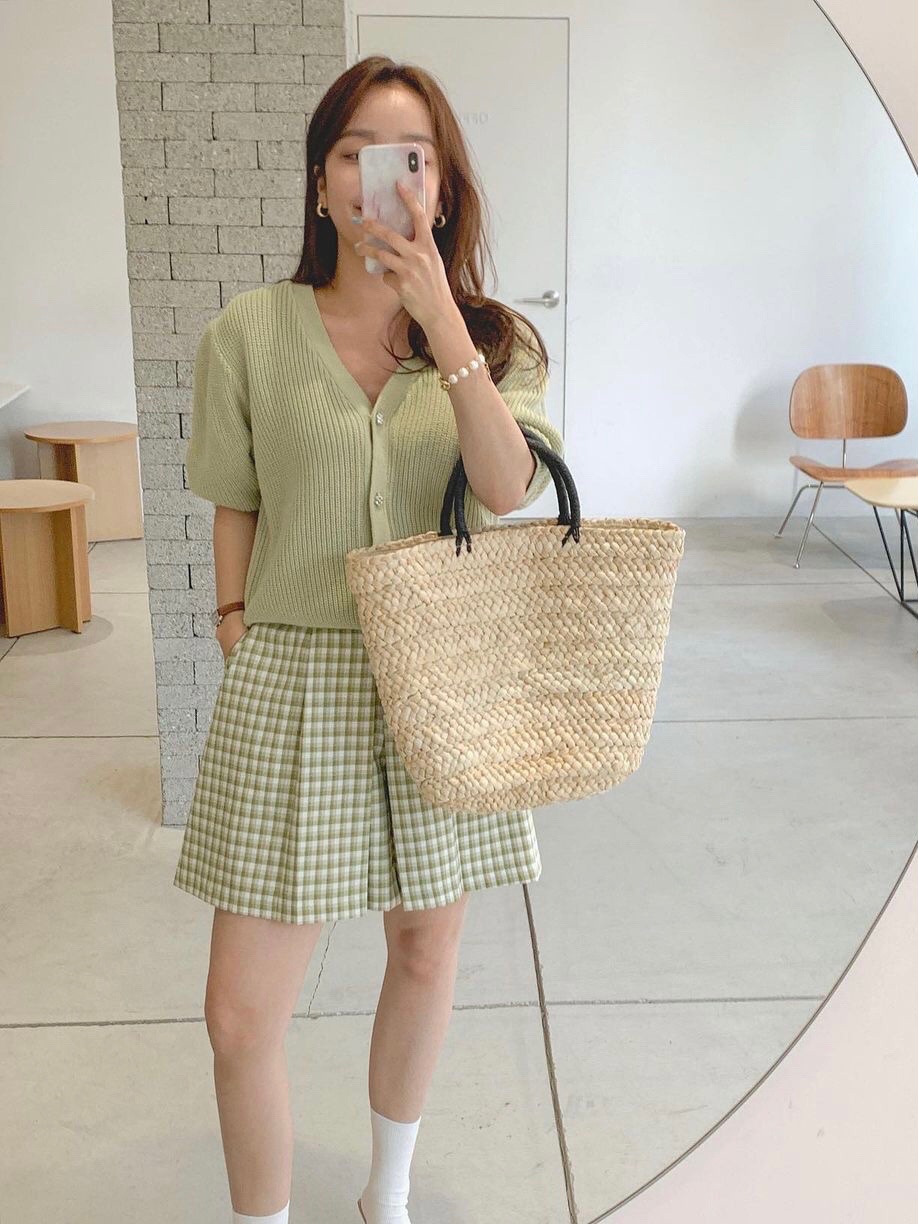 穿搭亮点:搭配同色系格纹短裤。当豆绿色与格纹元素巧妙融合在一起之后,整体的清新气息无疑是得到了更进一步的提升和优化,与此同时,宽松的裤管也能够与双腿形成视觉上的对比反差,起到衬托身材的作用。