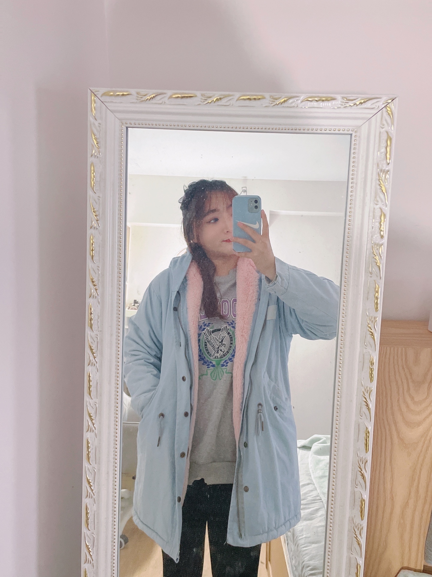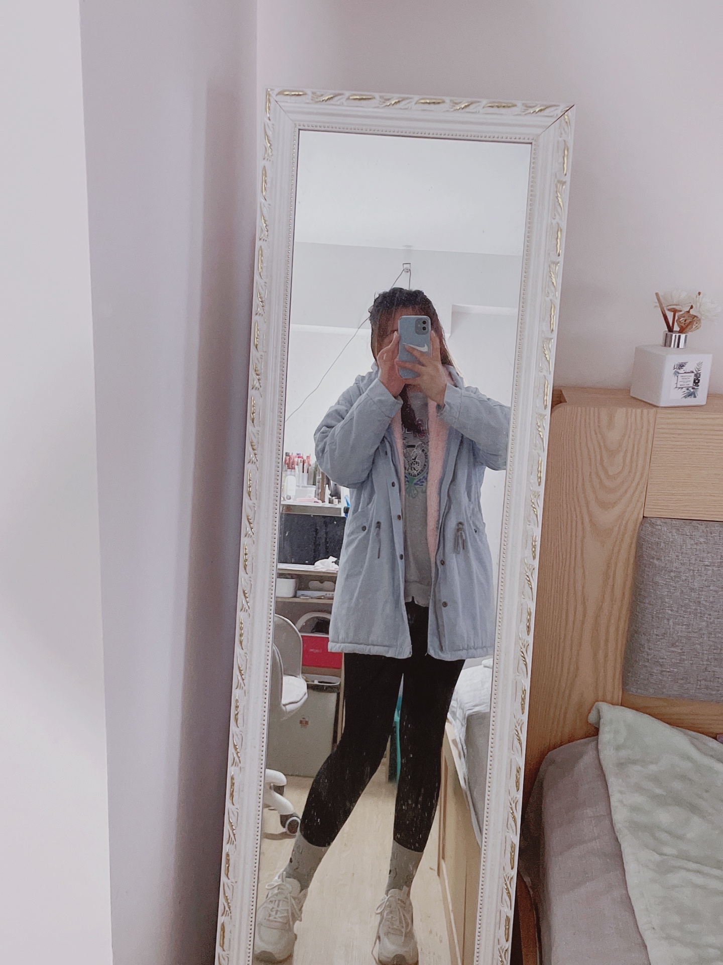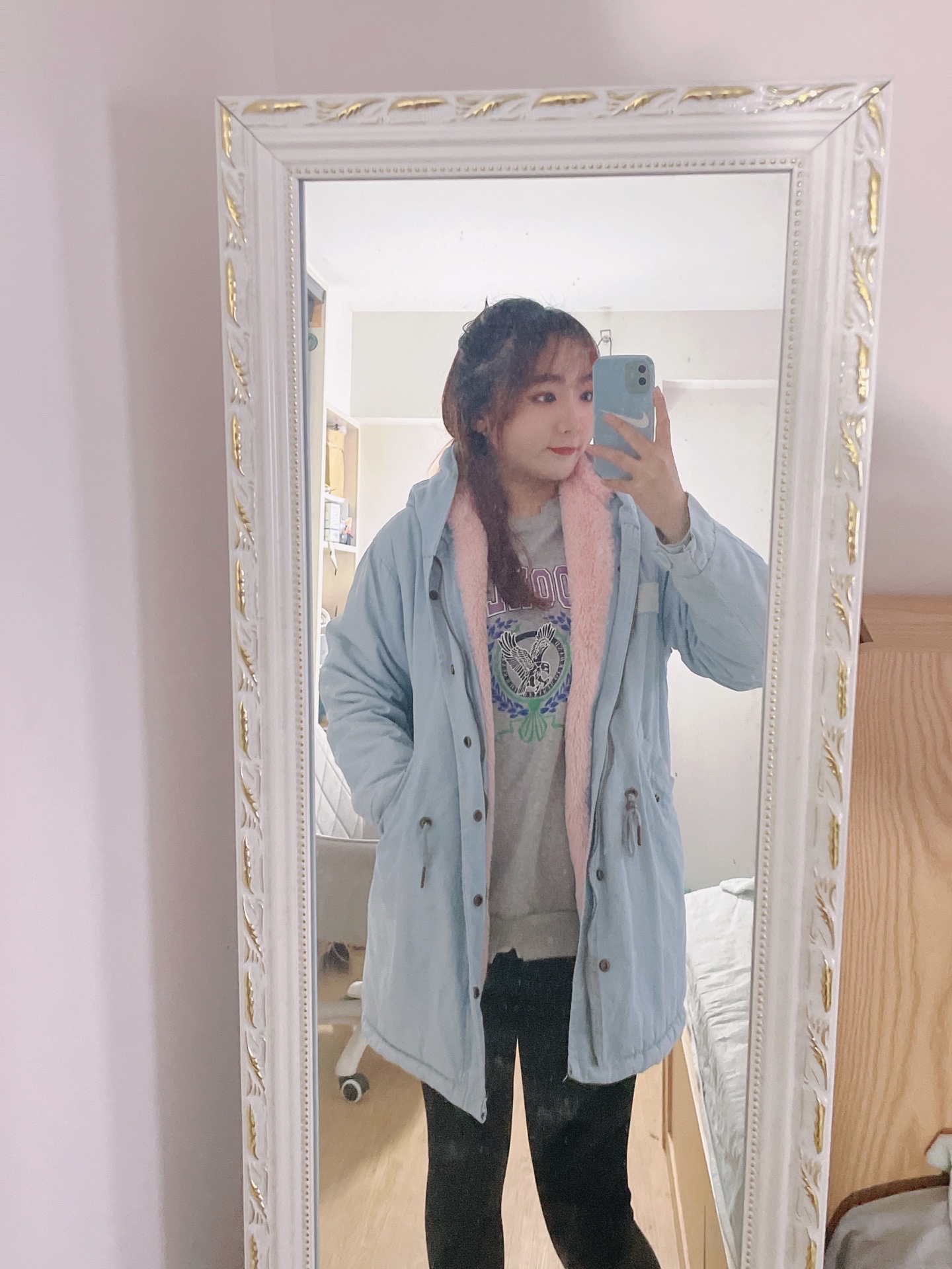 我作为一个北方妹子 虽然说不是特别怕冷 但是毕竟北方的温度在这摆着 咱也不是那种过反季节的人 所以我这一身适合北方小个子宝贝的穿搭 绝对实用性的 蓝色的派克服内衬做了加绒设计 大风刮来也不担心透风 很保暖 然后穿一个黑色打底裤 搭配一双老爹鞋完事!简单有效的穿搭