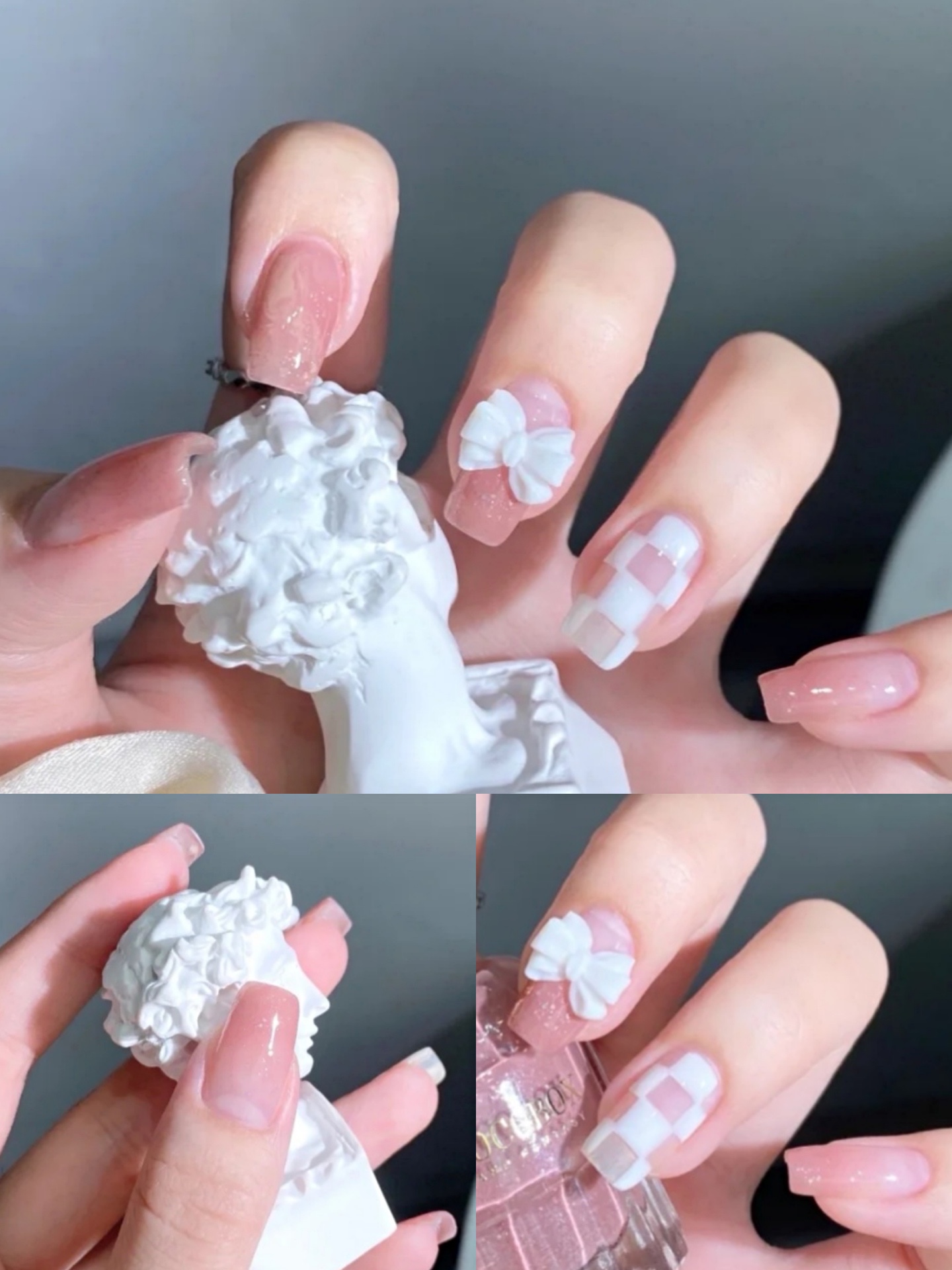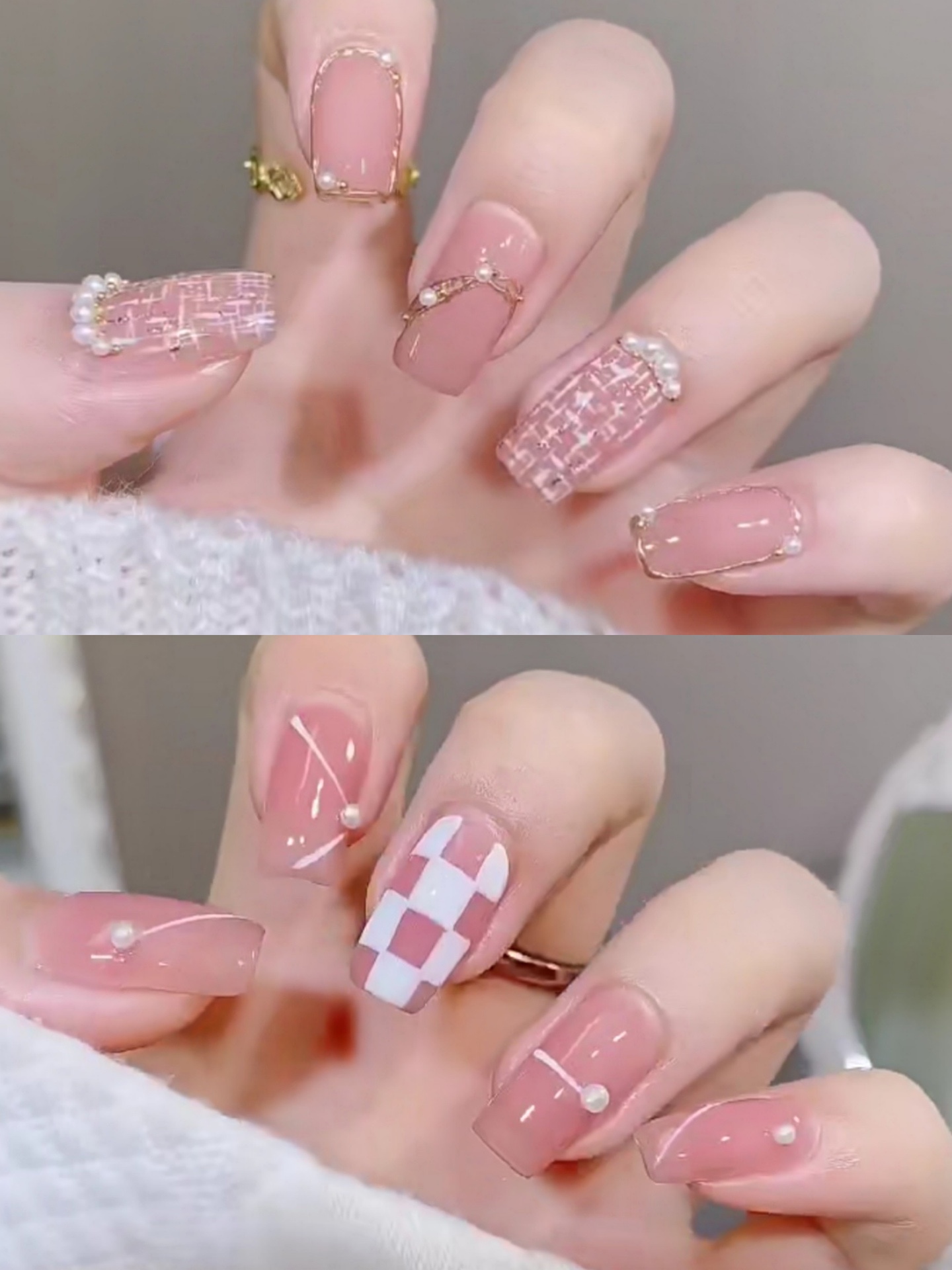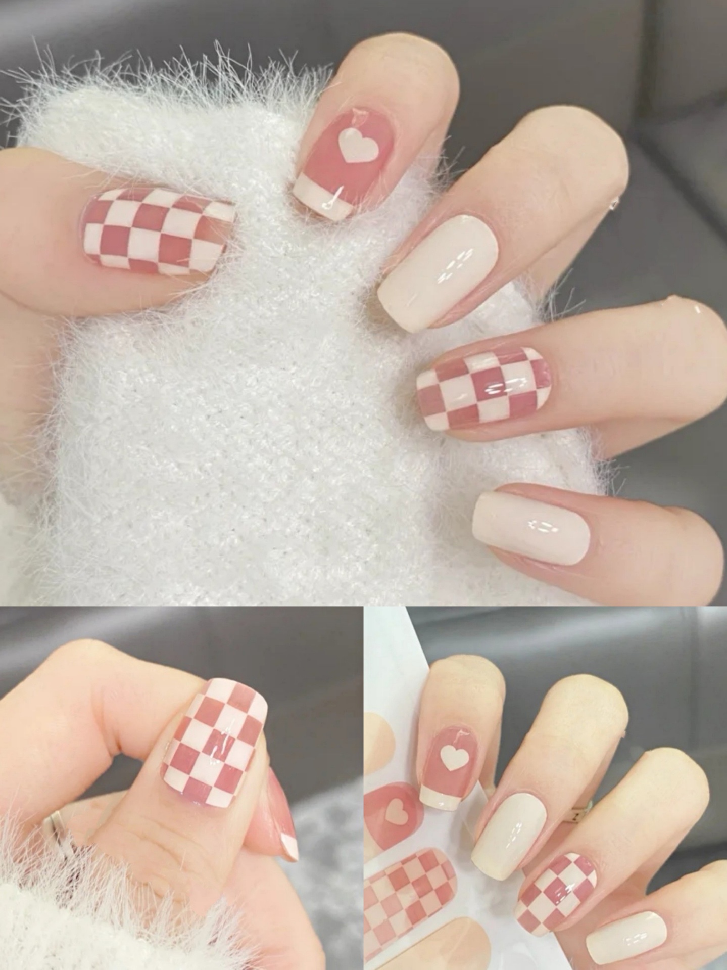 还有小宝没做过今年很火的棋盘格美甲嘛?这完全是秋冬天心心念念的菜啊!粉白粉白的不要太可爱了,配色真的绝绝子,好看又百搭的赶紧安排一下哦~