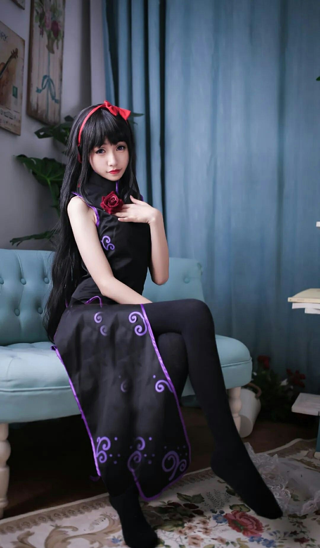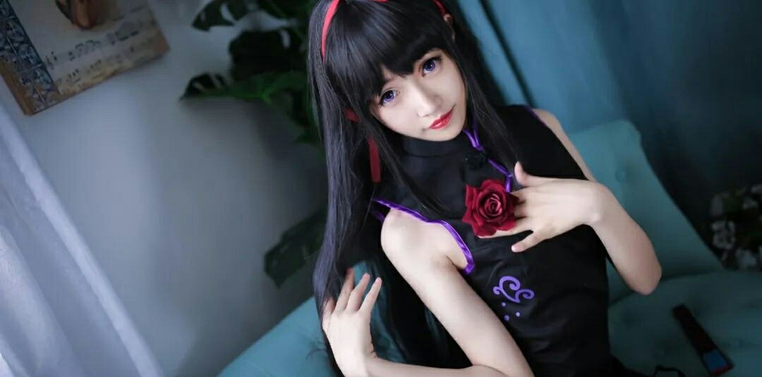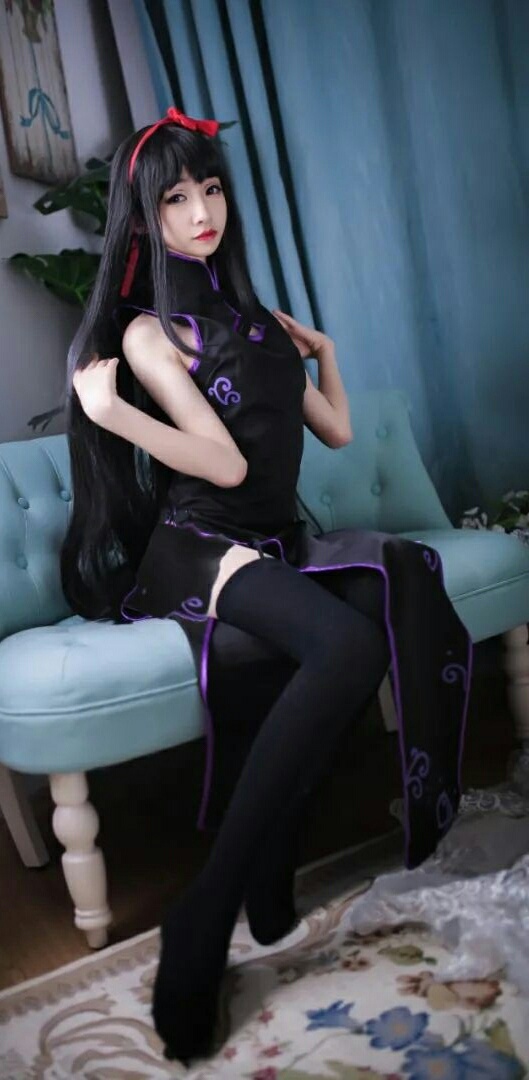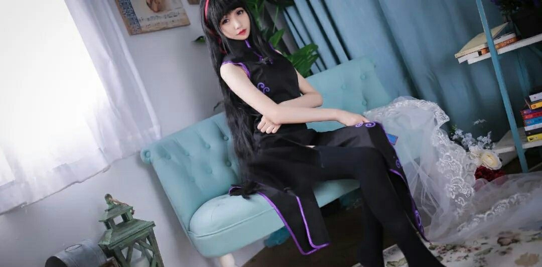 cos:魔法少女小圆丝质黑旗袍晓美焰cos正片