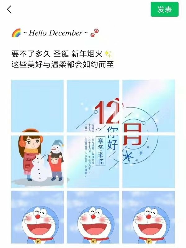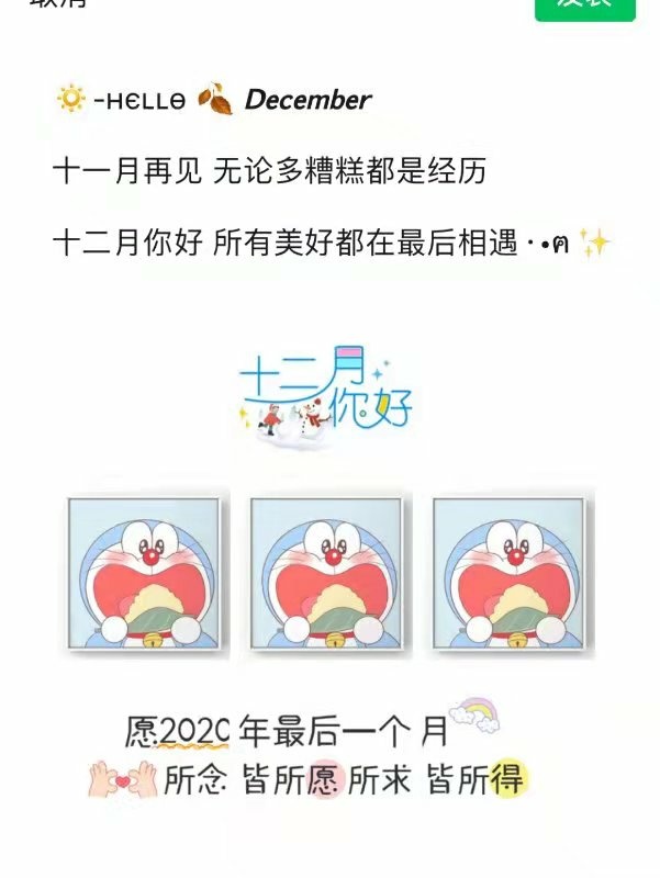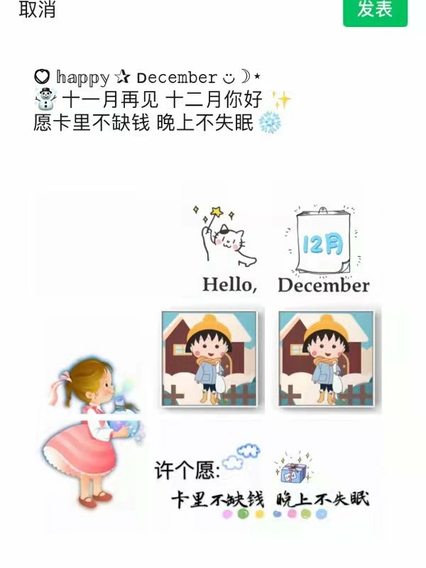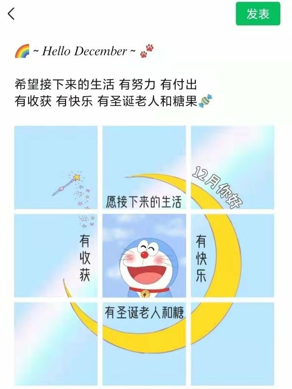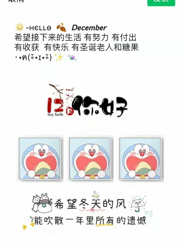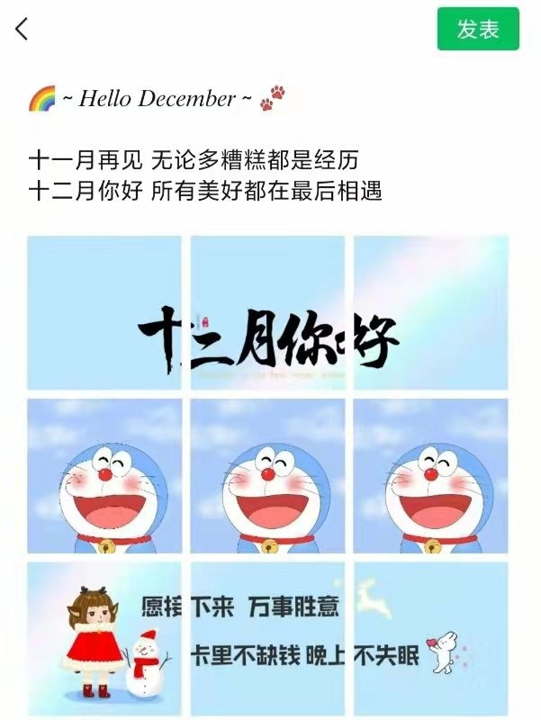 ☀️适合十二月你好发朋友圈文案/九宫格 1. ☀|||☀️适合十二月你好发朋友圈文案/九宫格1. ☀☁ 𝓗𝓮𝓵𝓵𝓸 𝓓𝓮𝓬𝓮𝓶𝓫𝓮𝓻💒愿2020年最后一个月所念皆所愿 所求皆所得2. 🔅-ʜєʟʟɵ ♥️ 𝘿𝙚𝙘𝙚𝙢𝙗𝙚𝙧╭┬┬┬┬┬┬┬┬┬┬╮ⓛⓤⓒⓚ𝟏𝟐月の好运╰┴┴┴┴┴┴┴┴┴┴╯“拍了拍你”·•ฅ(⌯͒•ɪ•⌯͒)✨3. 🔅-ʜєʟʟɵ 🍂 𝘿𝙚𝙘𝙚𝙢𝙗𝙚𝙧十一月再见 无论多糟糕都是经历十二月你好 所有美好都在最后相遇·•ฅ✨4. ㋋ ᵕ̈ ʜᴀ͟ᴘ͟ᴘ͟ʏᴇᴠᴇʀʏᴅᴀʏ̆̈❄️愿所得皆所期所失皆无碍用温暖迎接整个冬日5. ㋋ ᵕ̈ ʜᴀ͟ᴘ͟ᴘ͟ʏᴇᴠᴇʀʏᴅᴀʏ̆̈❄️✨ 希望接下来的生活,有努力,有付出,也有收获,有快乐,有圣诞老人和糖果🍬6. 🔅-ʜєʟʟɵ 🍂 𝘿𝙚𝙘𝙚𝙢𝙗𝙚𝙧ⓛⓤⓒⓚ𝟏𝟐月の好运文案要不了多久 圣诞 雪花 新年烟火🎇这些美好与温柔都会如约而至7. ♥️ ᎻᎬᏞᏞᎾ ,十二月〰〰〰〰〰请一定照顾好我这个小朋友呀8. 🌈 𝐻𝑒𝓁𝓁𝑜 𝒟𝑒𝒸𝑒𝓂𝒷𝑒𝓇 ☁︎你的12月正在派件 请保持好心情!!!9. ‘曾经以为很遥远的2020年其实只剩下最后一个月了’' 21世纪十年代最后一个12月希望……🌨️ ''十二月,你好🍷 '10. ♡⃝ 𝕙𝕒𝕡𝕡𝕪 ✰ ᴅ𝚎𝚌𝚎𝚖𝚋𝚎𝚛 ◡̈ ☽⋆☃十一月再见 十二月你好 ✨愿卡里不缺钱 晚上不失眠❄@MT创作者学院@MT美物 @MT小助手 @MT情报局 @私人相册