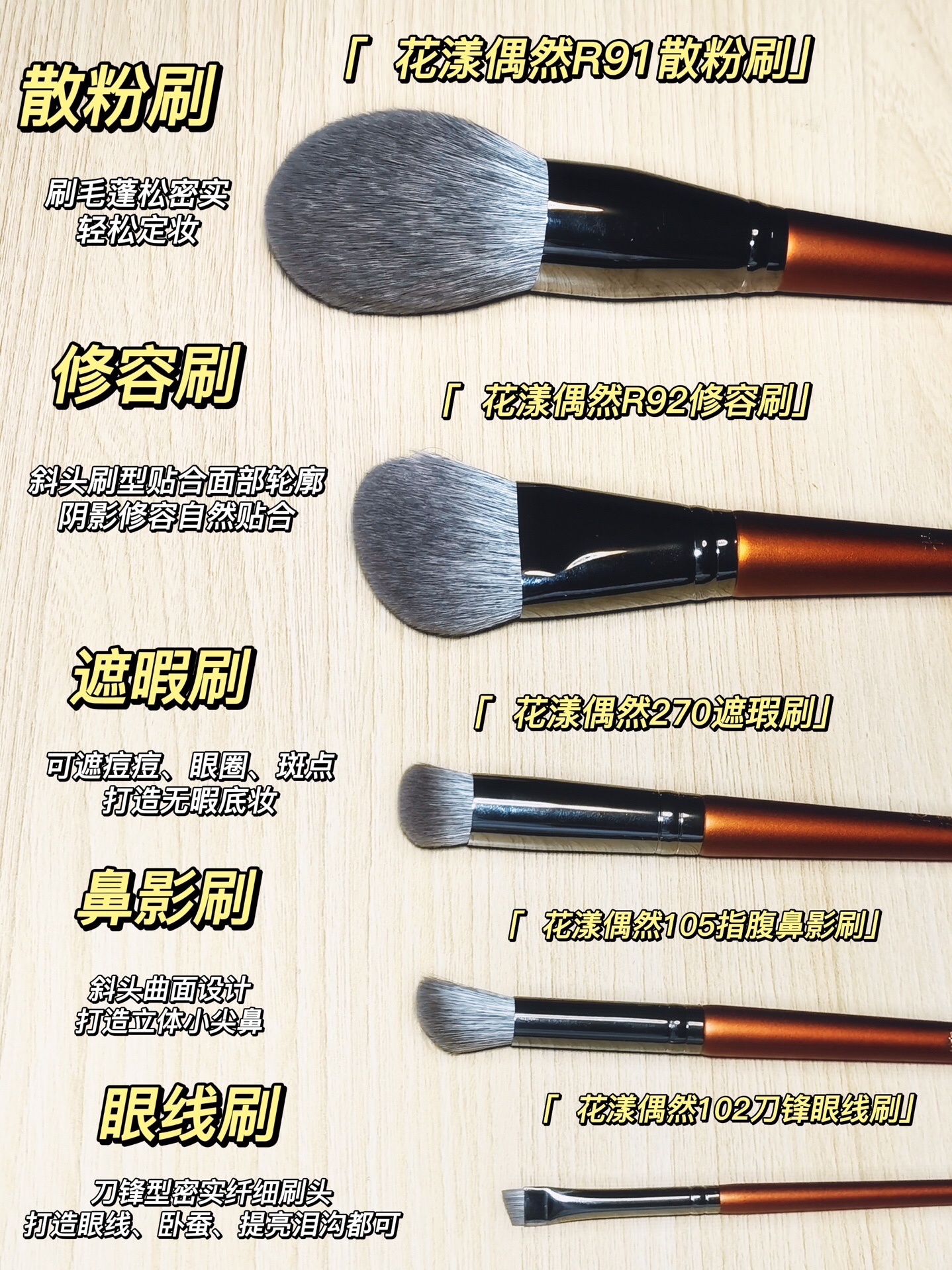 👉我经常用的刷子就是偶然家的R91散粉刷,R92修容刷,R102刀锋眼线刷,R105指腹鼻影刷,R08神指遮瑕刷!