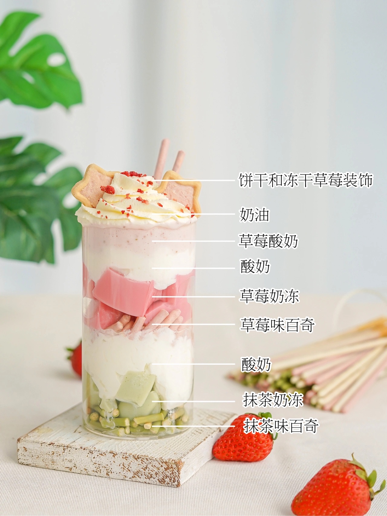 倒入一层原味酸奶,放上草莓饼干和草莓奶冻