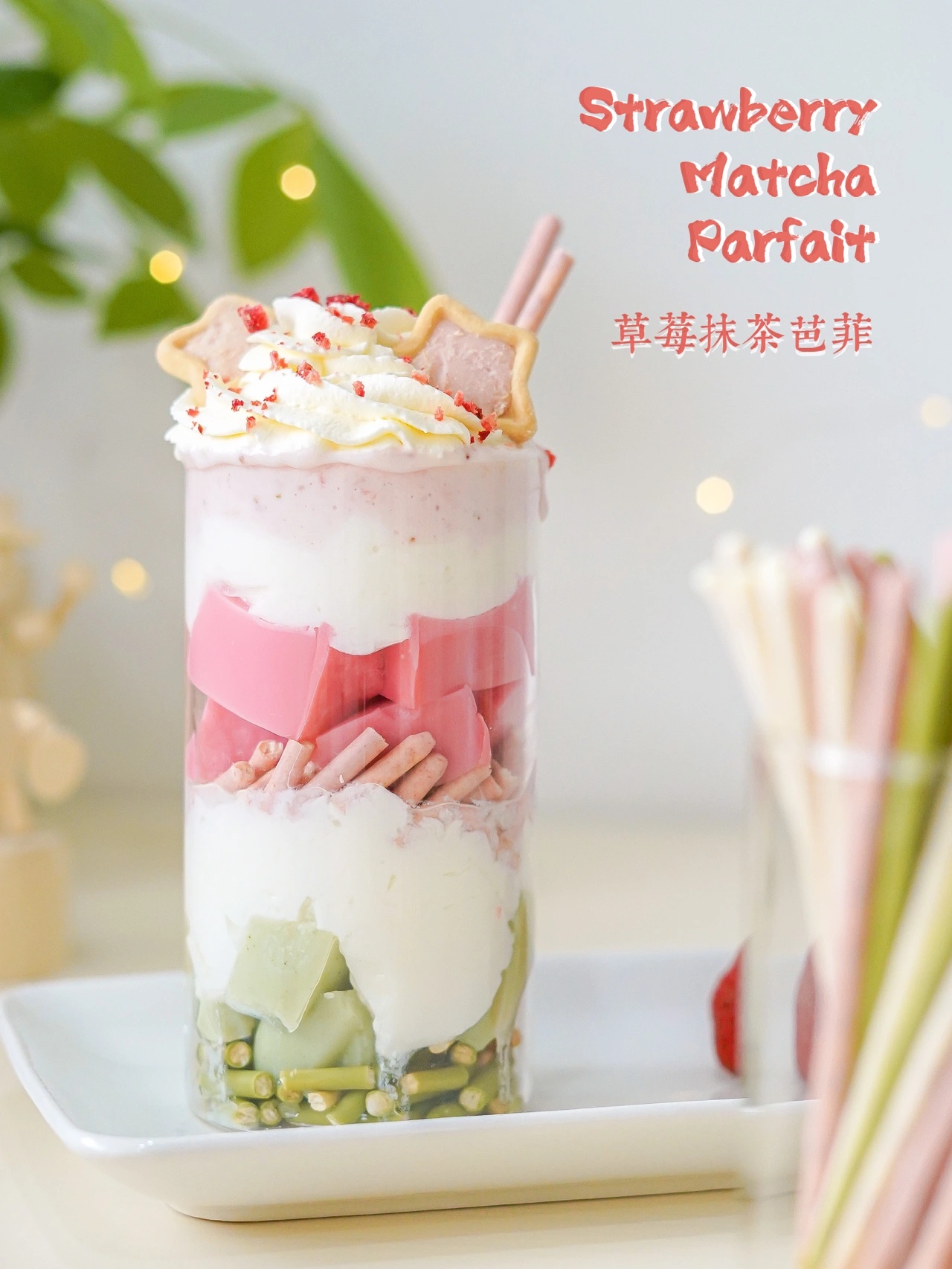 杯子里的甜品草莓抹茶芭菲|||今天分享一款不需要烤箱就能做的甜品