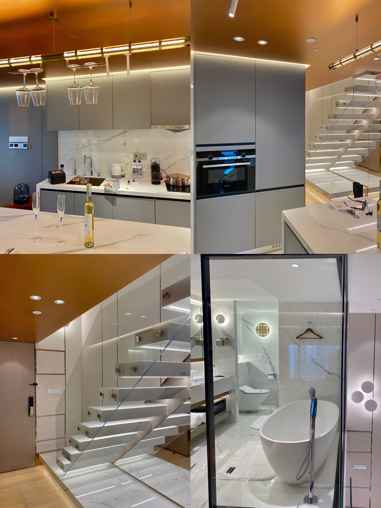 酒店内里陈设很高级,房型都是loft一楼是客厅餐厅带小卫生间,有烤箱冰箱咖啡机等设备可以自己动手做饭。全智能开关控制太方便了!每个房间都有harman音响音质没得说!
