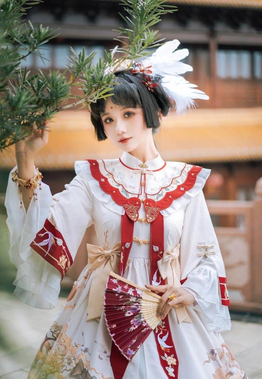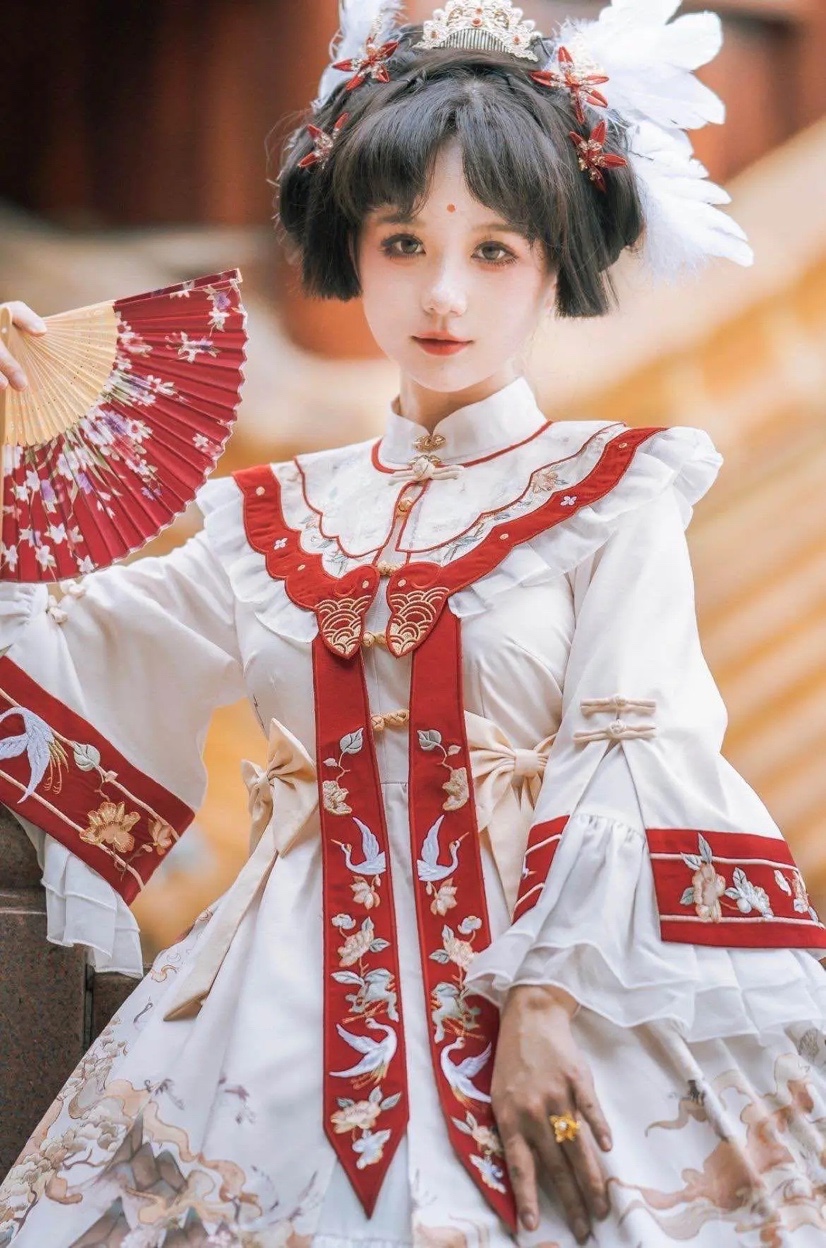 眉间一点红妆容本来就比较浓重,虽然风格与洛丽塔洋装有差别,但是搭配在一起,却毫无违和感。