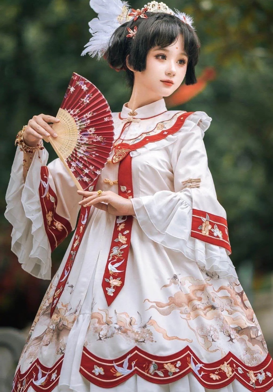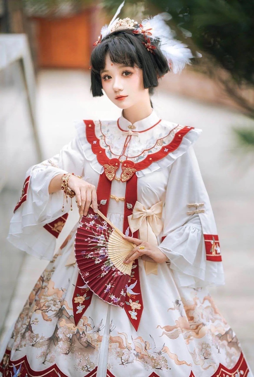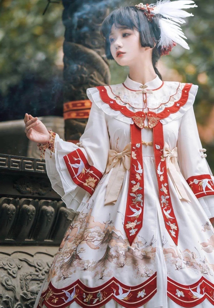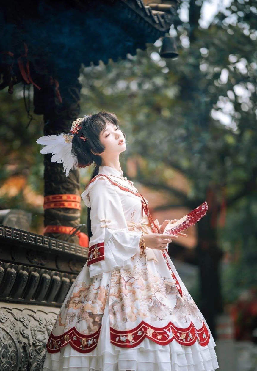 除此之外,眉间一点红属于比较浓的妆容,而洛丽塔洋装款式华丽,配色丰富且吸睛,两者都比较隆重,搭配在一起不但没有违和感,反而看起来相互融合。