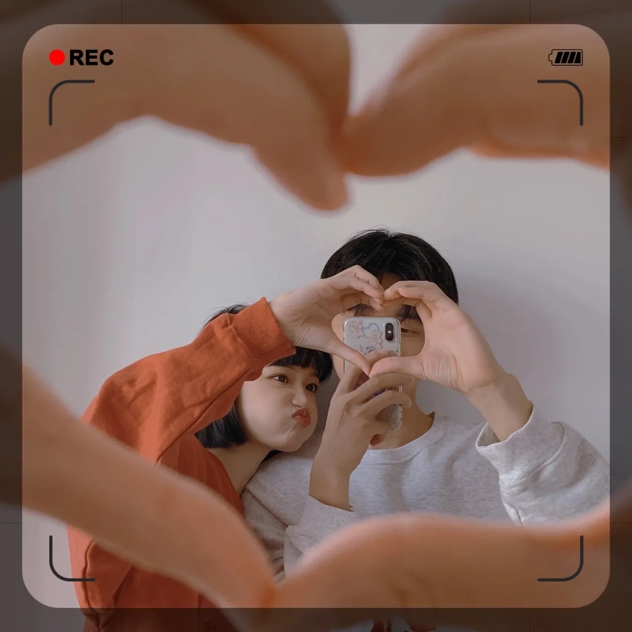 爱心💗拍照就是对镜自拍然后两个人拼一个爱心在镜头前面,这样拍敲甜[飞吻R]
